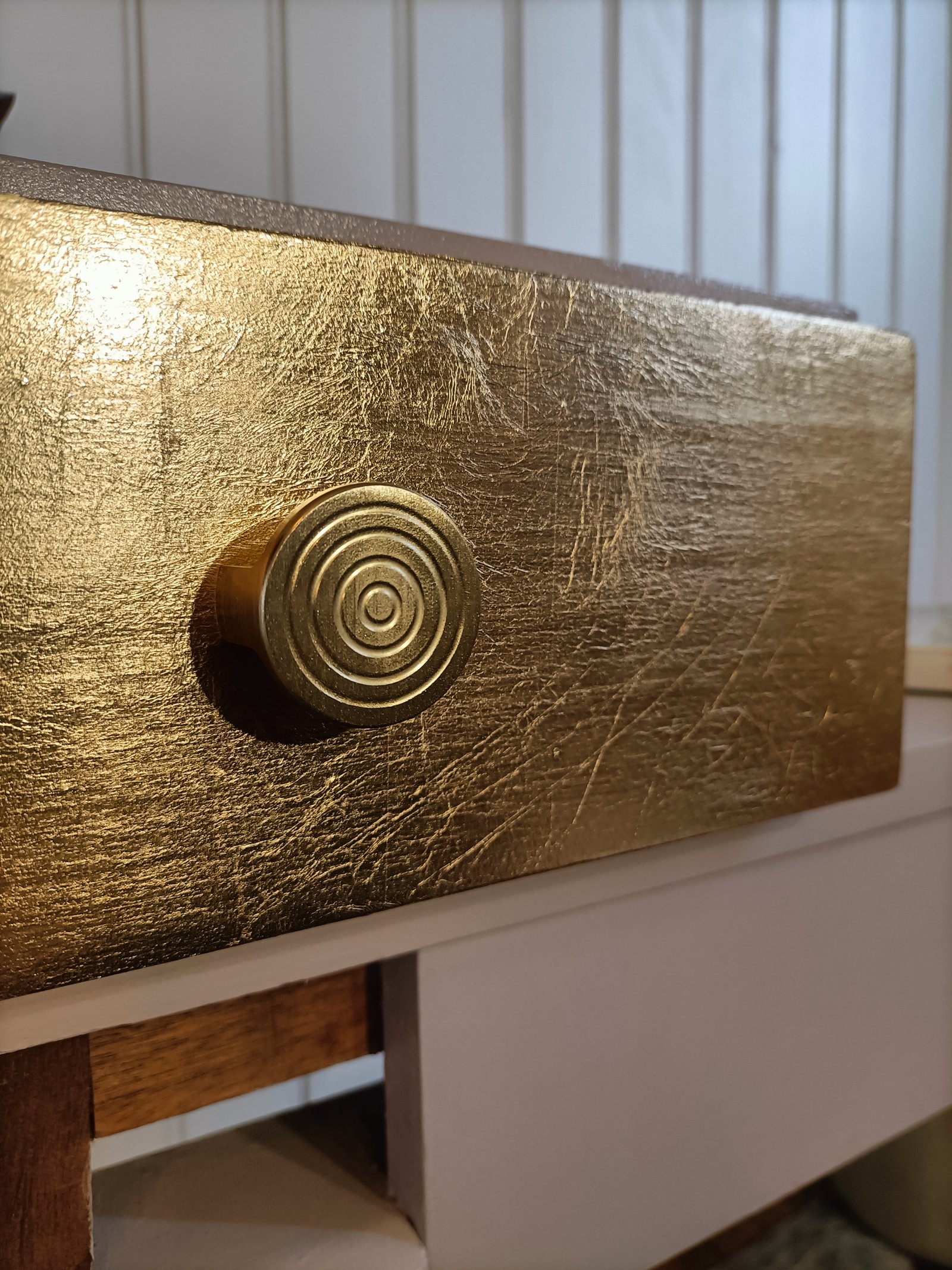 Après des heures et des heures de ponçage, j’ai enfin redonné vie à ce magnifique bureau en chêne. Sous l’ancienne teinte sombre, se cachait une belle couleur dorée et chaleureuse, que j’ai pris plaisir à faire réapparaître. 🌾 Pour lui apporter ma touche personnelle, j’ai ajouté une veine d’or qui vient subtilement parcourir le bois, comme une cicatrice précieuse racontant son histoire. 💛 Aujourd’hui, ce bureau allie authenticité et modernité, prêt à commencer un nouveau chapitre dans une nouvelle maison. 🏡