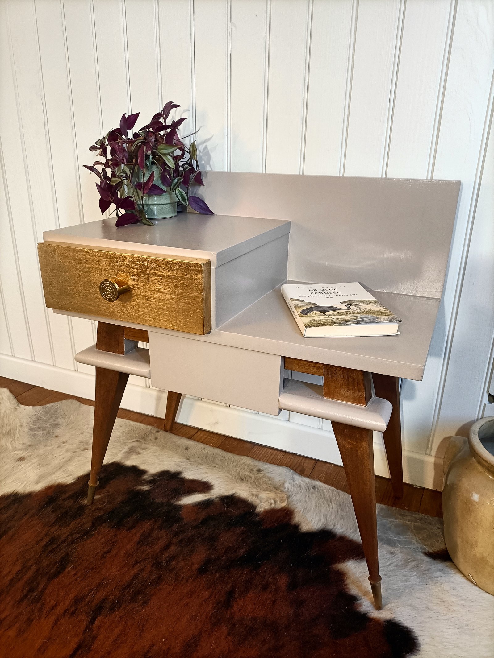 Table de chevet au design rétro entièrement revalorisée, mêlant bois naturel, peinture beige et feuille d’or pour un rendu à la fois authentique et lumineux. Chaque détail a été pensé pour lui redonner vie : le bois a été soigneusement poncé et nourri, la peinture apporte douceur et modernité, et le tiroir doré capte la lumière avec élégance. Ce petit meuble unique s’intègre parfaitement dans une déco vintage, bohème chic ou mid-century, que ce soit en table de chevet, meuble d’appoint ou rangement déco. Les pieds inclinés et les finitions soignées renforcent son caractère.