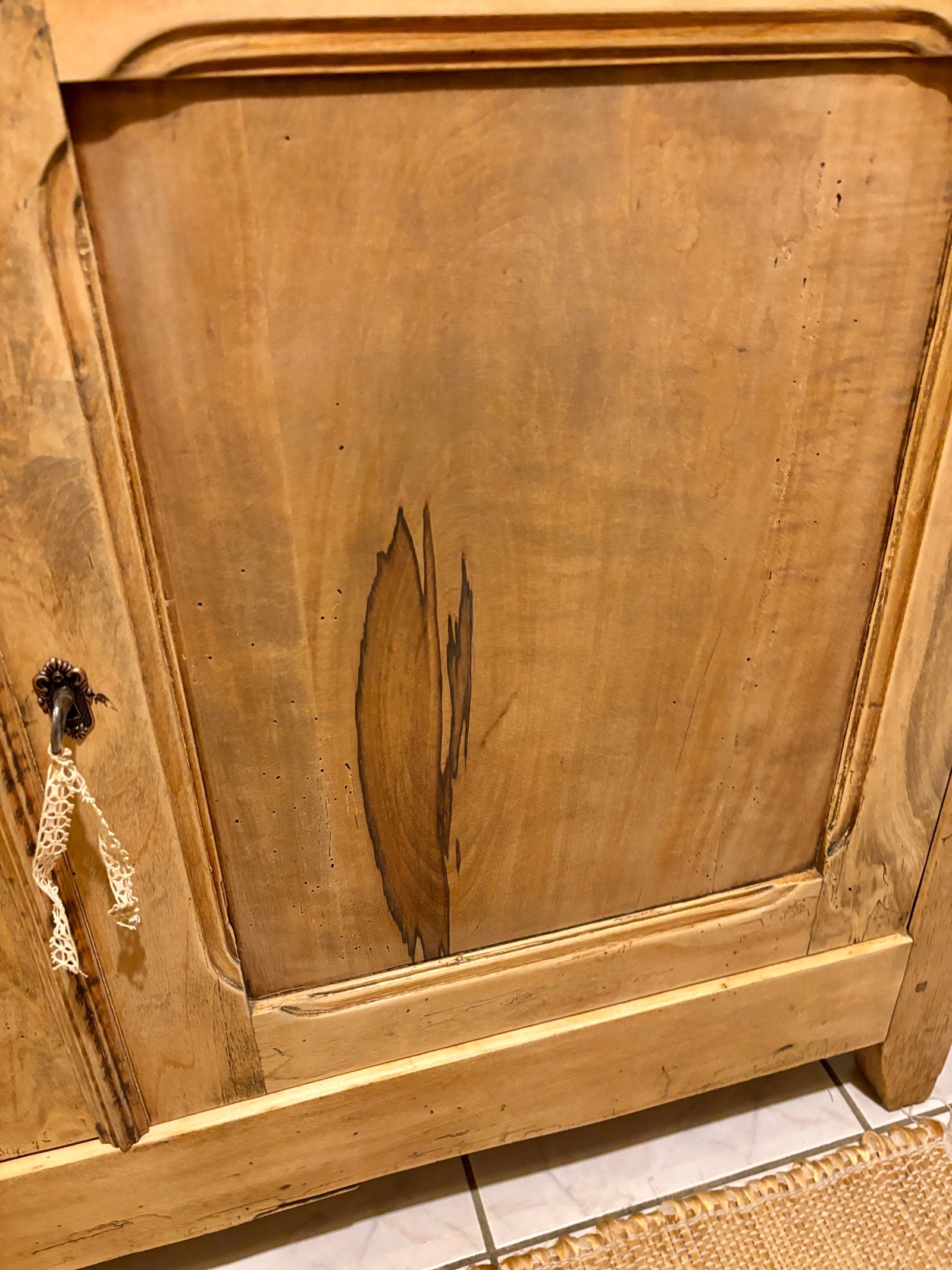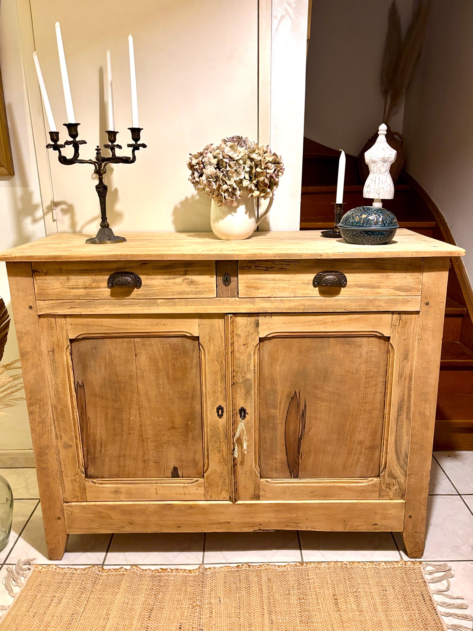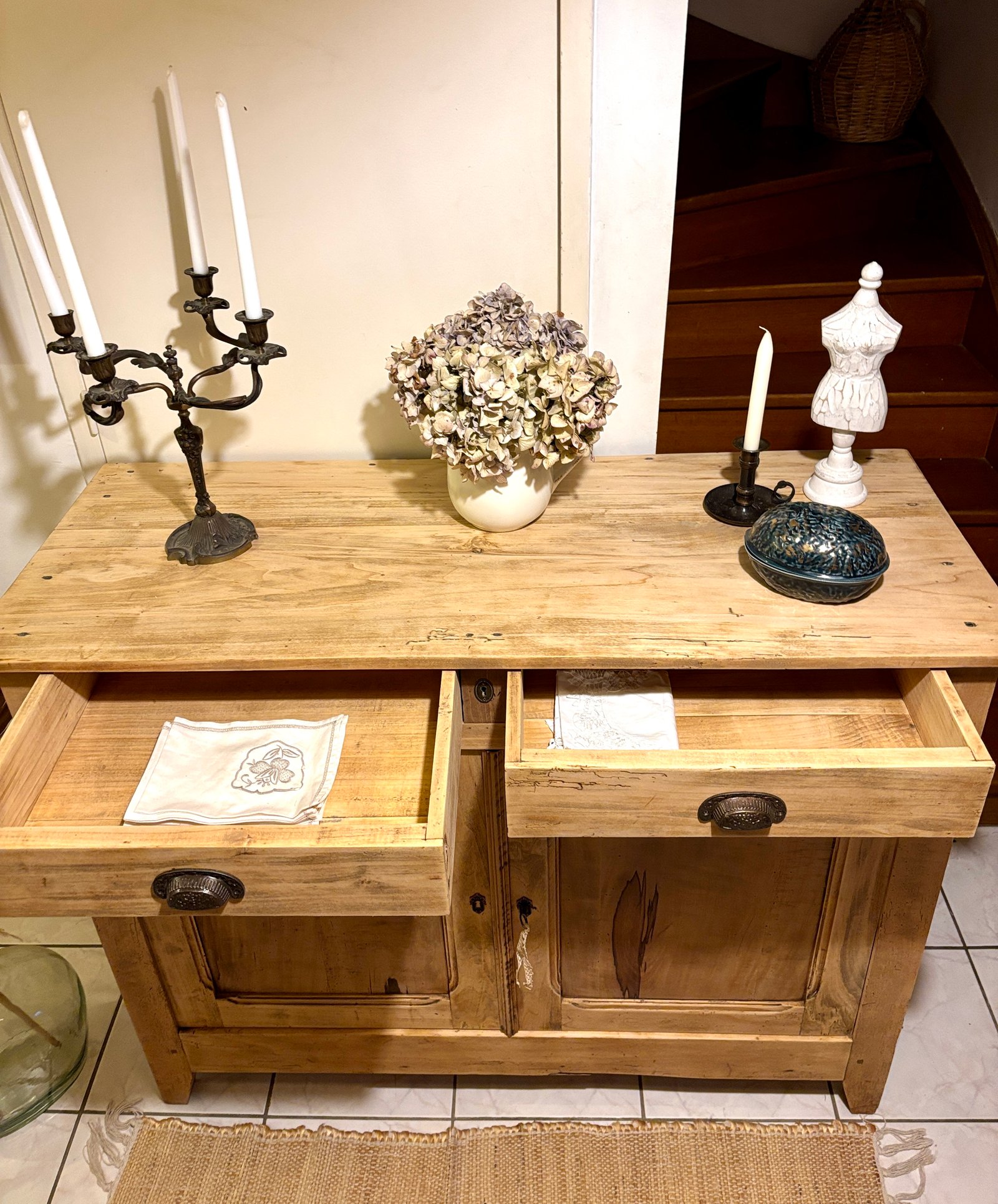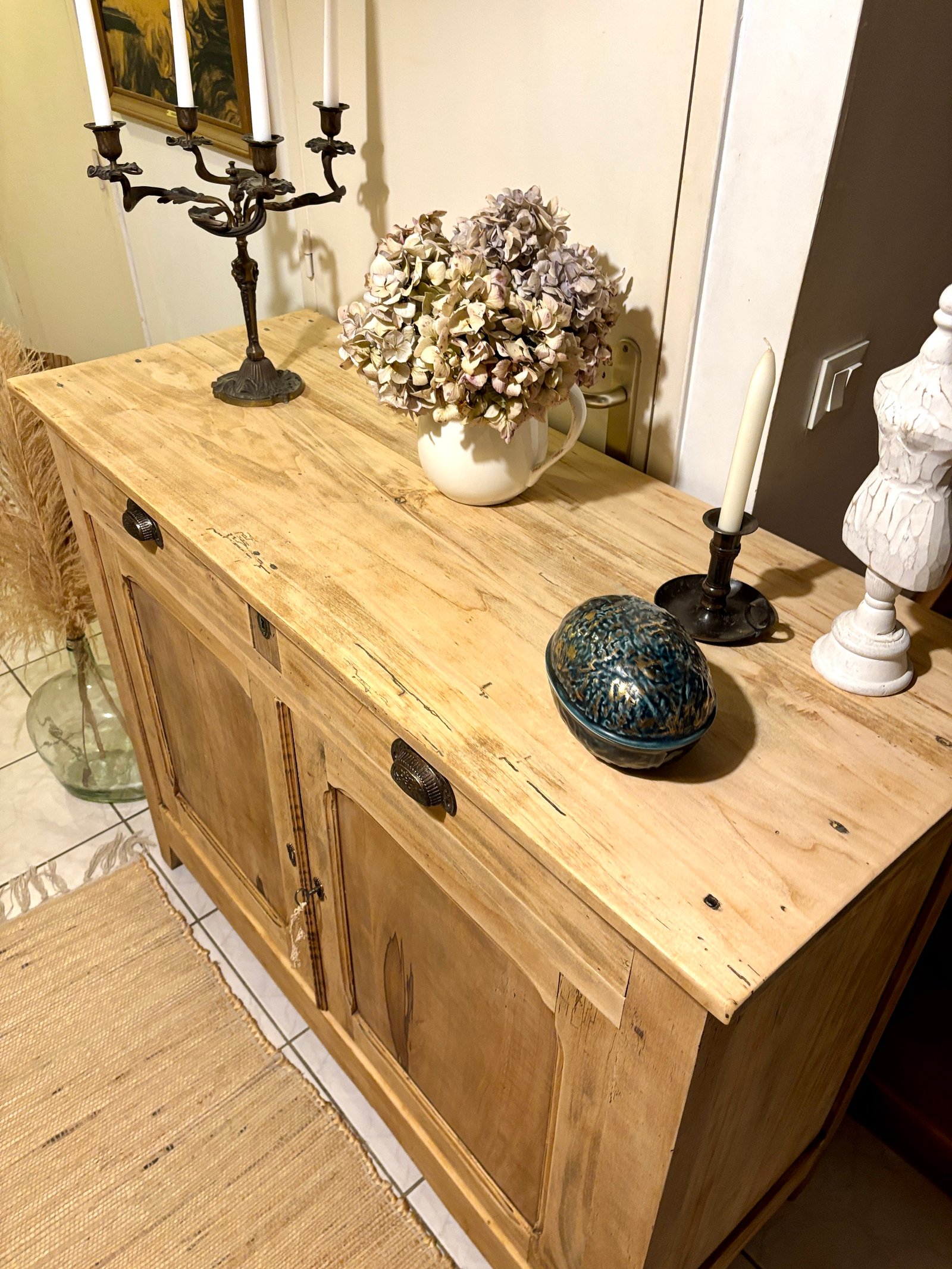Ce buffet parisien rustique est une véritable pièce de caractère, idéale pour apporter chaleur et authenticité à votre intérieur. Entièrement poncé, nettoyé et traité, il est prêt à vivre une nouvelle vie chez vous. Son bois présente de magnifiques marques naturelles, qui ne sont pas des défauts mais le témoignage de son histoire – c’est ce qui lui donne toute son âme. Doté de 2 tiroirs avec poignées coquille en bronze et de rangements intérieurs spacieux, il est aussi pratique qu’esthétique. Parfait dans une salle à manger, une entrée ou un salon, il s’intègre aussi bien dans un décor campagne chic, bohème ou vintage.