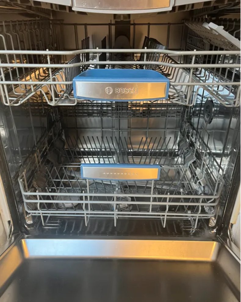 Ce lave-vaisselle Bosch est de couleur grise et semble être un modèle encastrable. La façade avant comporte une poignée intégrée pour ouvrir la porte. Le panneau de commande est situé en haut de la porte et comprend plusieurs boutons et un cadran rotatif pour sélectionner les différents programmes de lavage. Le logo "Bosch" est visible au centre du panneau supérieur. Il y a également des indicateurs lumineux sur le côté droit du panneau de commande, probablement pour indiquer l'état du cycle ou des options supplémentaires comme le séchage ou le rinçage supplémentaire.