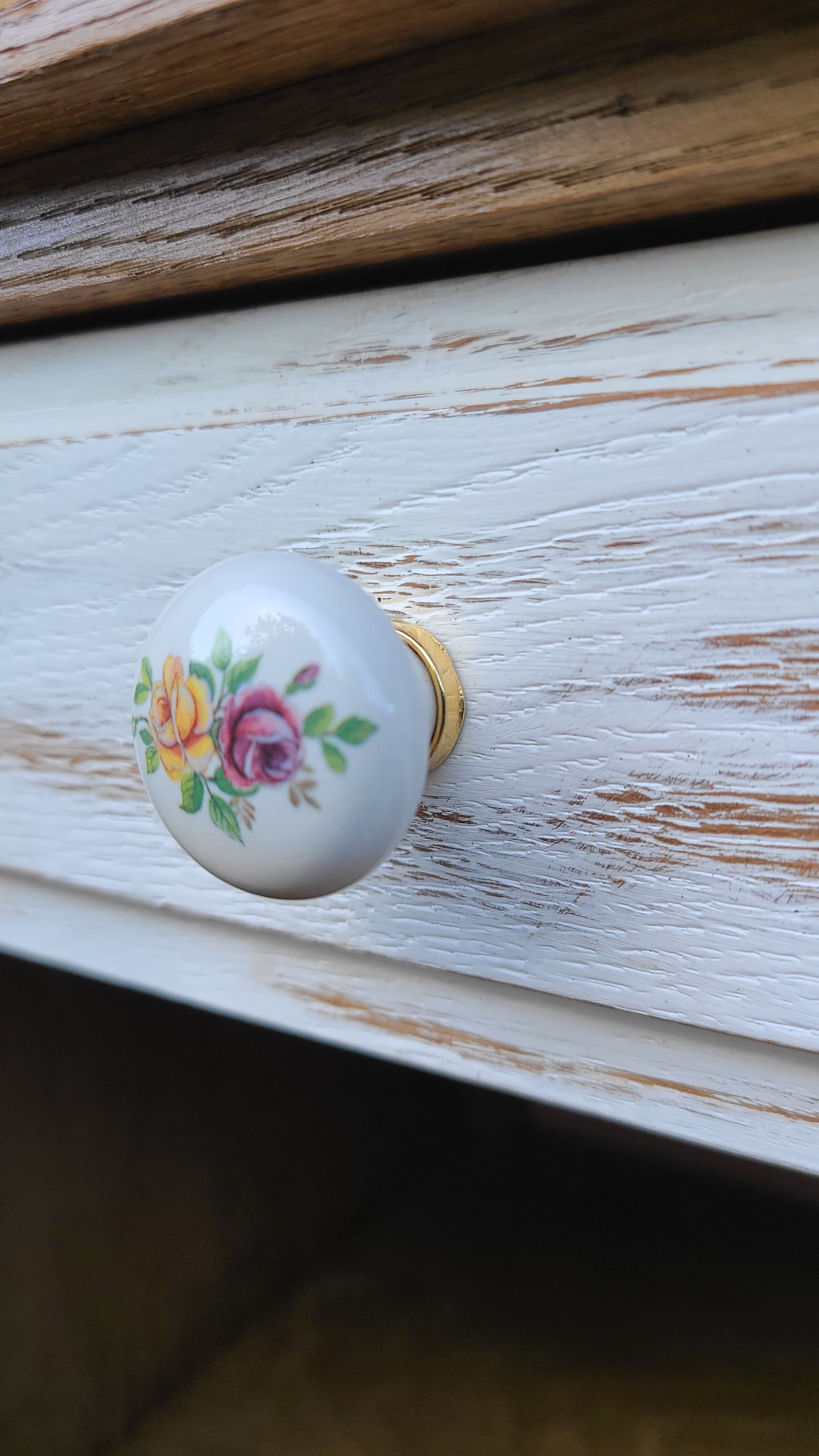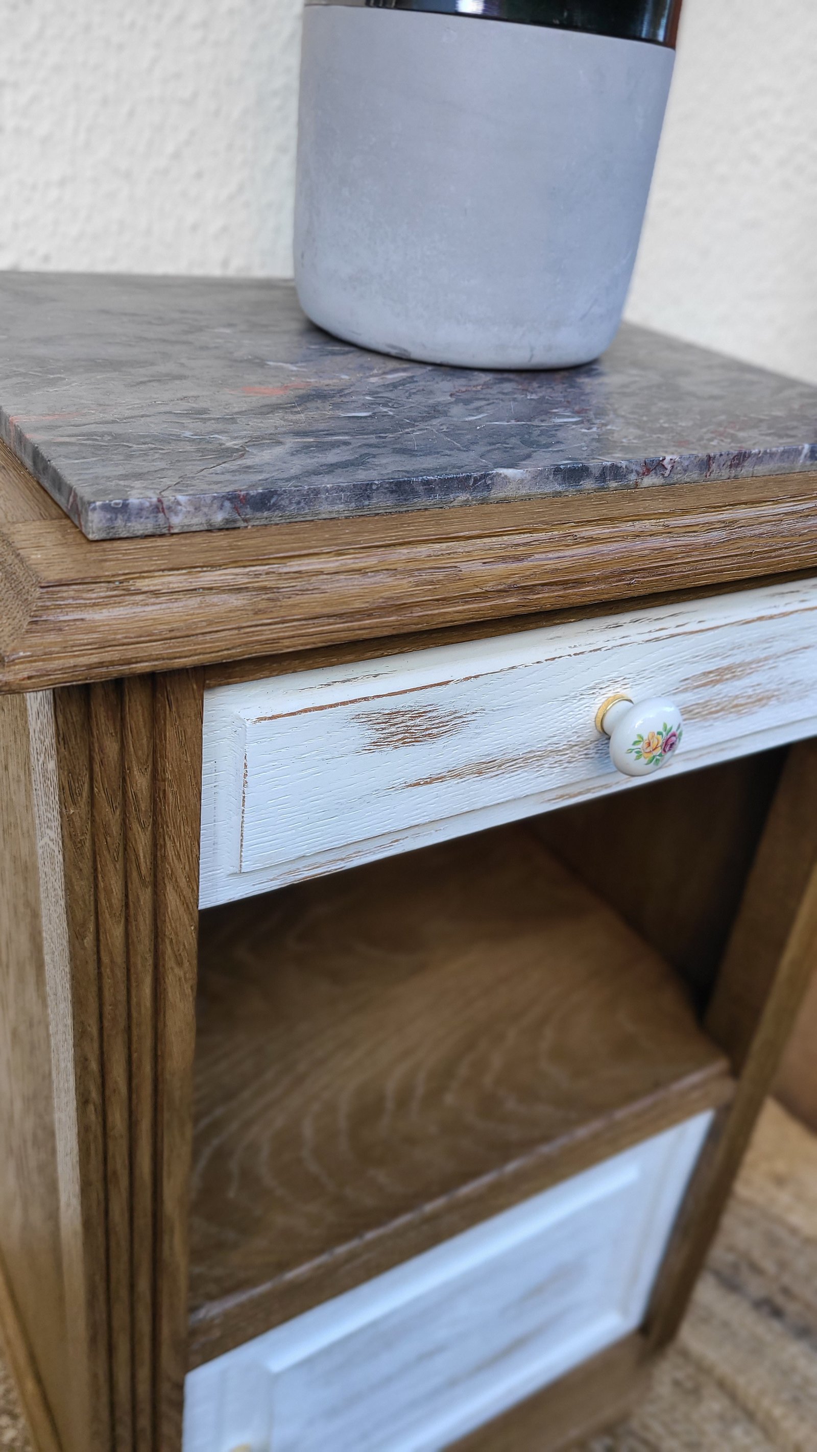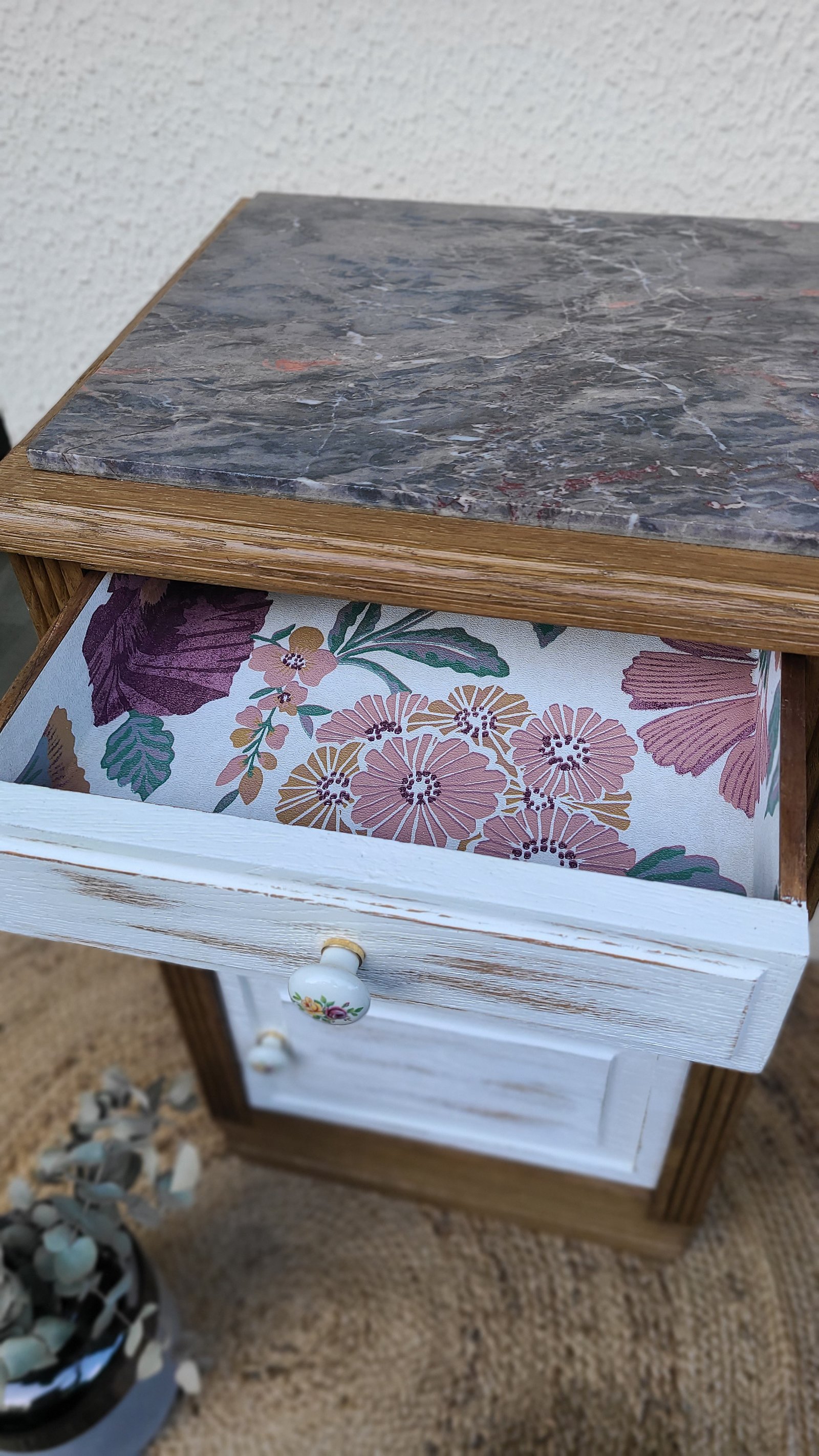 Voici Maggie Entre charme d’antan et fraîcheur estivale… Ce chevet en bois massif et marbre, héritage du mobilier ancien, retrouve une nouvelle vie. Sa patine blanche évoque l’esprit cottage et la douceur des intérieurs shabby chic, tandis que ses poignées en porcelaine fleuries ajoutent une touche romantique et vintage. À l’intérieur, un imprimé fleuri coloré insuffle un esprit bohème plein de vitalité, contrastant avec l’association bois naturel et blanc, subtile alliance entre authenticité rustique et lumière. Un meuble unique, comme une invitation à poser vos livres et vos rêves dans un cottage anglais baigné de soleil.