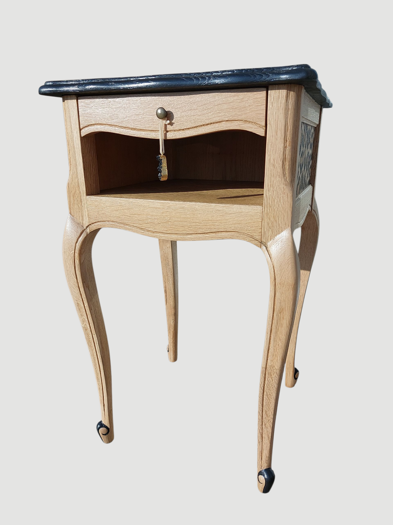 Jolie et décorative pour embellir votre coin nuit ! Si vous êtes adepte des meubles qui racontent une histoire, vous allez l'adorer. Avec sa touche vintage, cette table de chevet revisitée a tout pour vous plaire. Ce petit meuble élégant pourra accueillir votre réveil, une jolie lampe et tout ce dont vous avez besoin près de votre lit. Son petit plus ? Outre l'élégance de son galbe, le cannage agrémenté d'un laçage apporte beaucoup de charme à cet ensemble bohème. Son détail trop chou ? Les petits pompons ocre qui sont un accord parfait avec ce noir profond choisi pour réveiller son potentiel. Son tiroir et le dos tapissés aux motifs "attrape rêve" apportent une touche de poésie contemporaine. Son côté super pratique ? Son tiroir qui vous permet de ranger tout votre petit bazar ! Créer un joli petit coin de nuit cosy dans votre chambre grâce à cette réalisation unique qui n'attend que vous. Laissez ce magnifique chevet opérer du charme dans votre intérieur. Avec une allure fière et élégante, le design de ce chevet réalisé avec des détails soignés ne va pas vous laisser indifférent. Solide et bien robuste, il est fait pour durer. Les petits défauts qui font qu'il a vécu une belle vie : Habillement dissimulés mais pas reniés... Un léger gondolement sur le dessus (reprise du placage abîmé) et de petites lacunes au niveau du cannage corrigées par le laçage de la cordelette décorative.