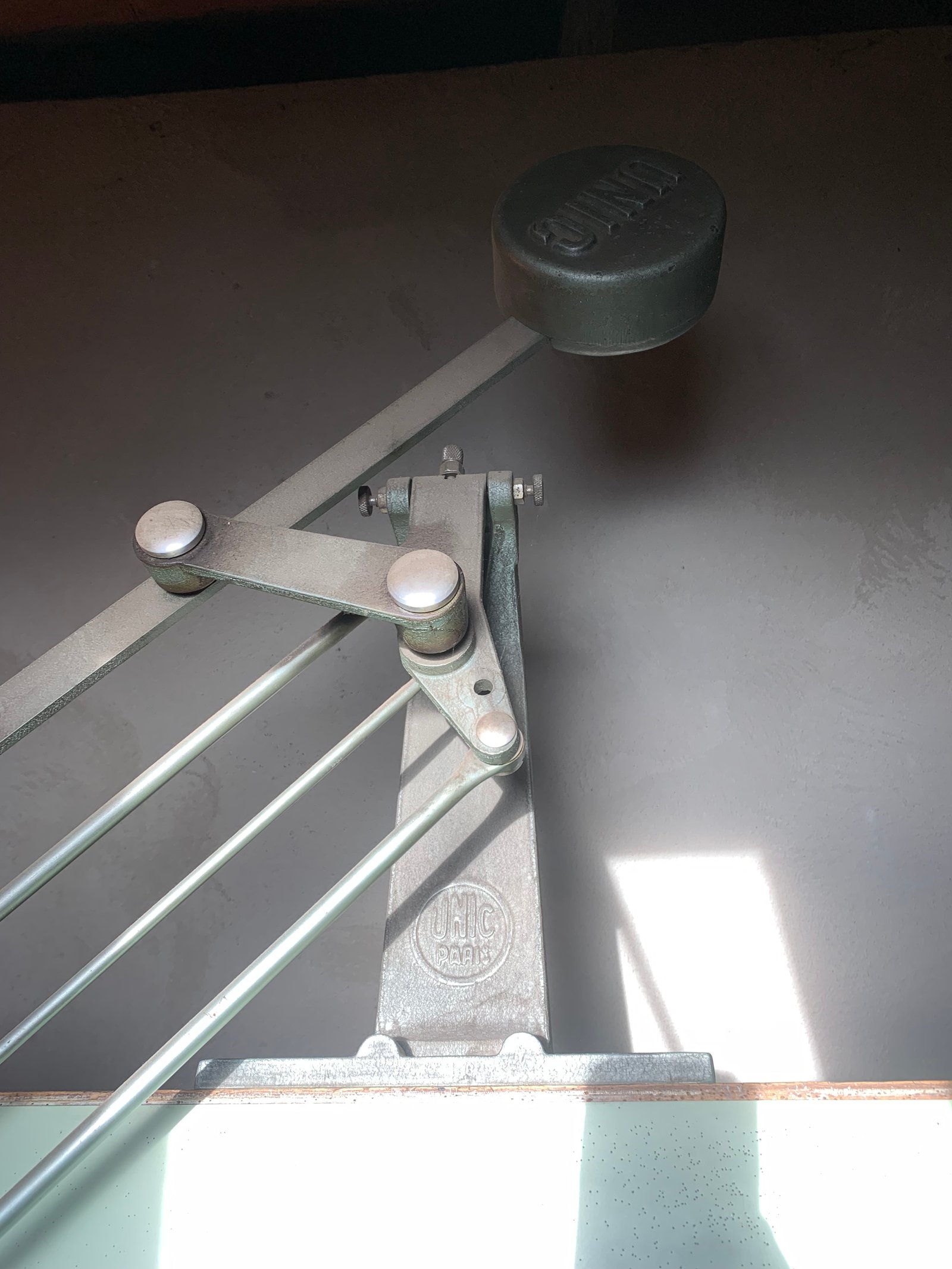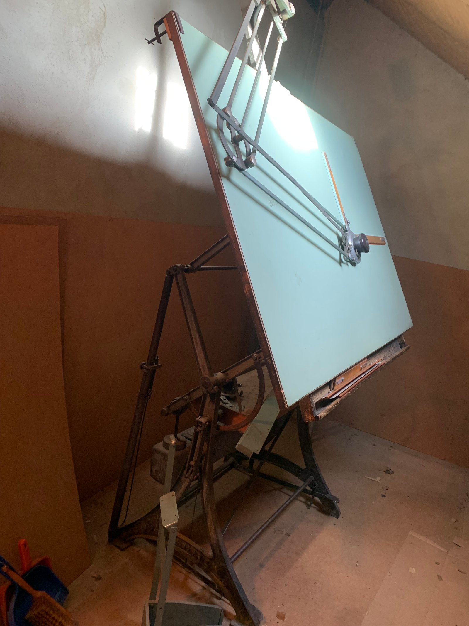 Table à dessin d’architecte des années 1950. Construction en fonte de très haute qualité avec une table à dessin. Le cadre est réglable en hauteur et la table peut être inclinée. Fabriqué en allemagne, fabricant: nestler (marque sur le cadre). Hauteur de travail 88 cm. Hauteur 168 - 230 cm. Profondeur 38 - 110 cm. Cadre en acier.