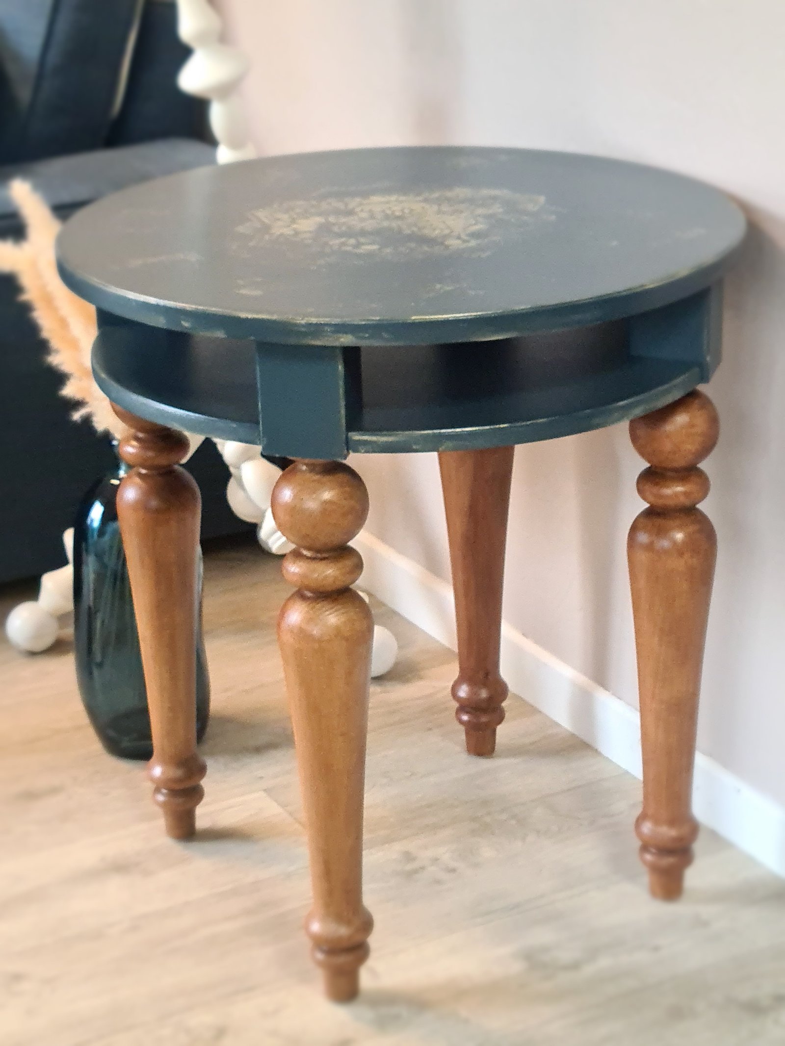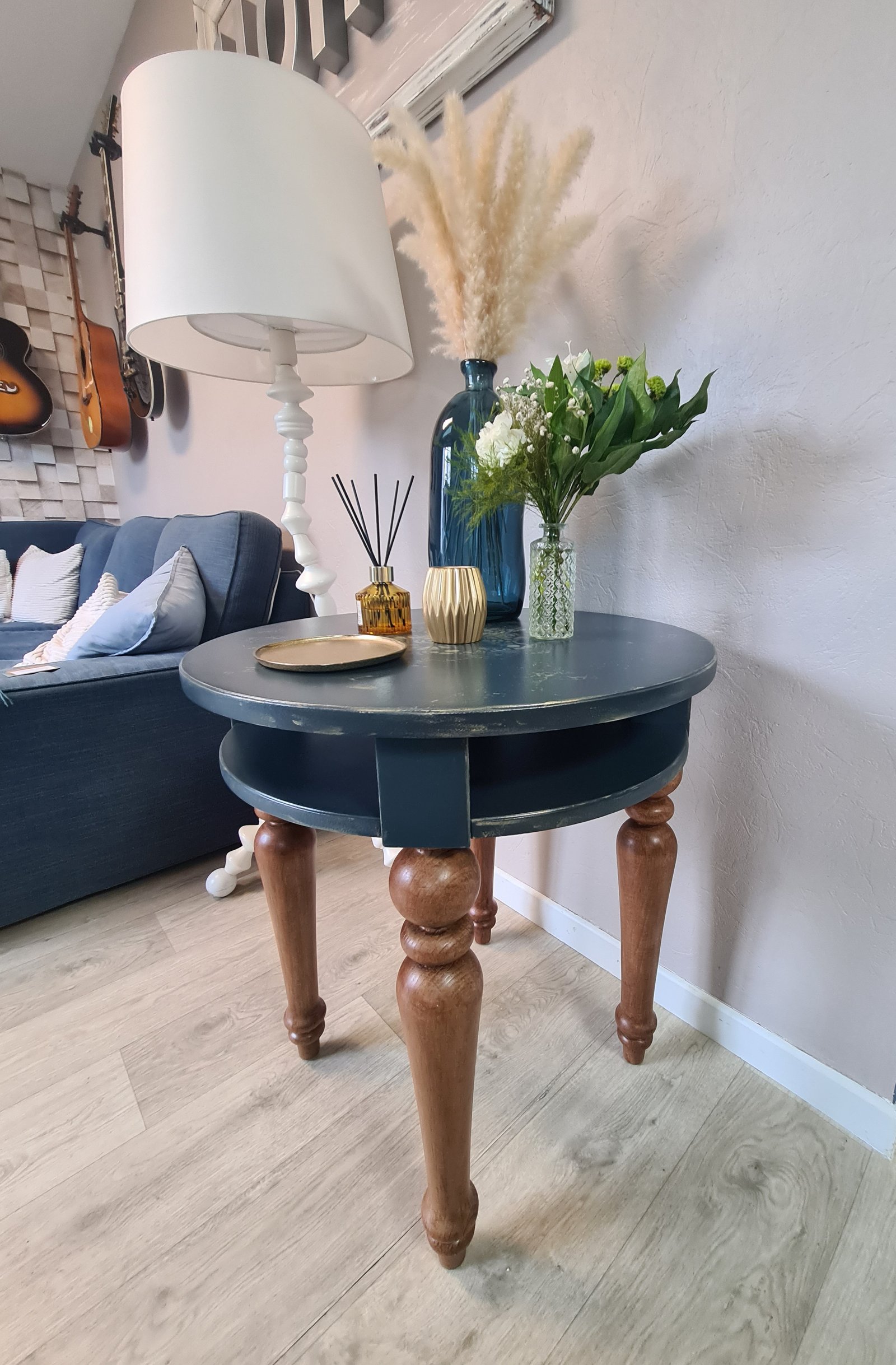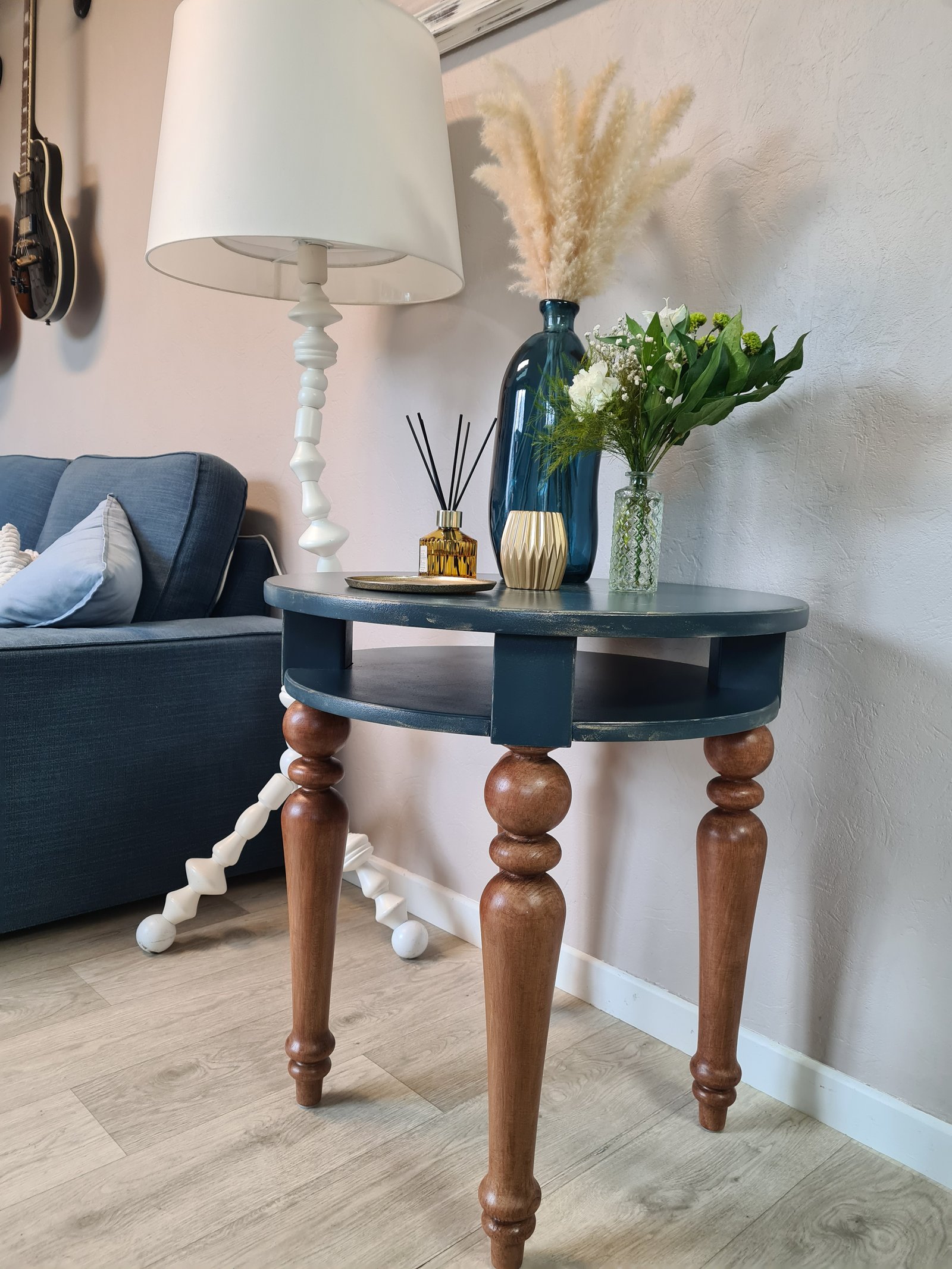 Guéridon revalorisé – Pièce unique – Style bohème chic Superbe guéridon entièrement revalorisé à la main. C’est une pièce unique, idéale pour apporter du charme et du caractère à un salon, une entrée ou une chambre. 🔹 Plateau peint dans un bleu profond avec un effet patiné doré 🔹 Motif mandala délicatement pochoiré au centre pour une touche bohème chic 🔹 Plateau inférieur pratique, parfait pour ranger livres ou petites décorations 🔹 Pieds tournés en bois massif, nettoyés et protégés, teinte naturelle pour un joli contraste 🔹 Finition vernie pour une bonne tenue dans le temps Dimensions : – Diamètre : 60 cm – Hauteur : 64 cm État : Comme neuf, entièrement restauré. Pièce prête à l’emploi. 💙 Idéal si vous aimez les meubles revisités, uniques et chaleureux. 👉 Prix : 145 € N’hésite pas à me contacter pour plus d’informations.