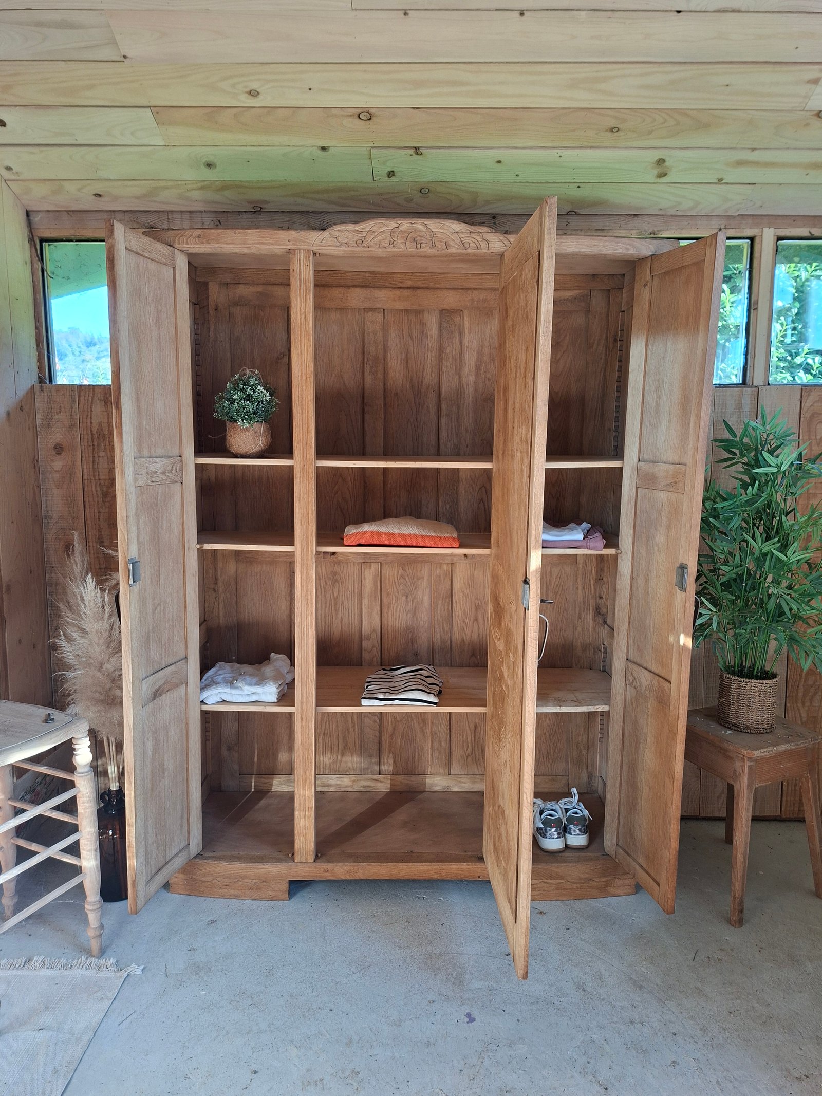 Armoire penderie anglaise art déco – Élégance et caractère Cette superbe armoire en hêtre séduit par son design unique et ses lignes raffinées. Sa forme à pans coupés, ses motifs sculptés et sa magnifique poignée en font une pièce remarquable. Caractéristiques : - Peinture couleur argile, douce et lumineuse - Deux étagères de chaque côté et trois penderies pour un rangement optimal - Finition vernis satiné pour une touche d’élégance Un meuble au charme intemporel, parfait pour sublimer votre intérieur avec raffinement.