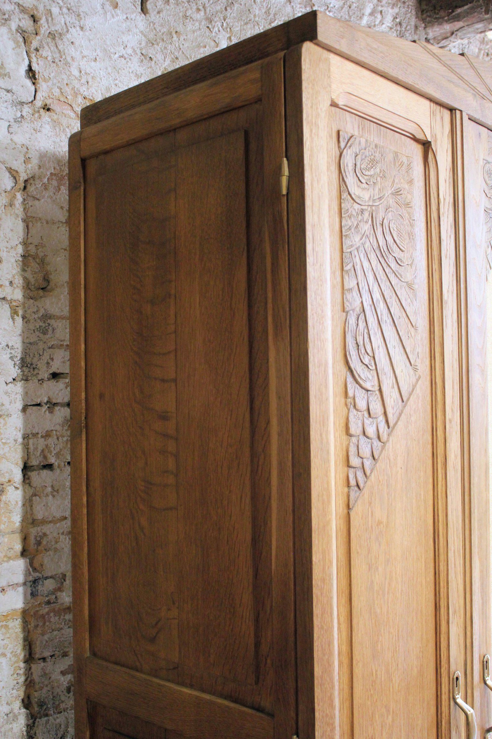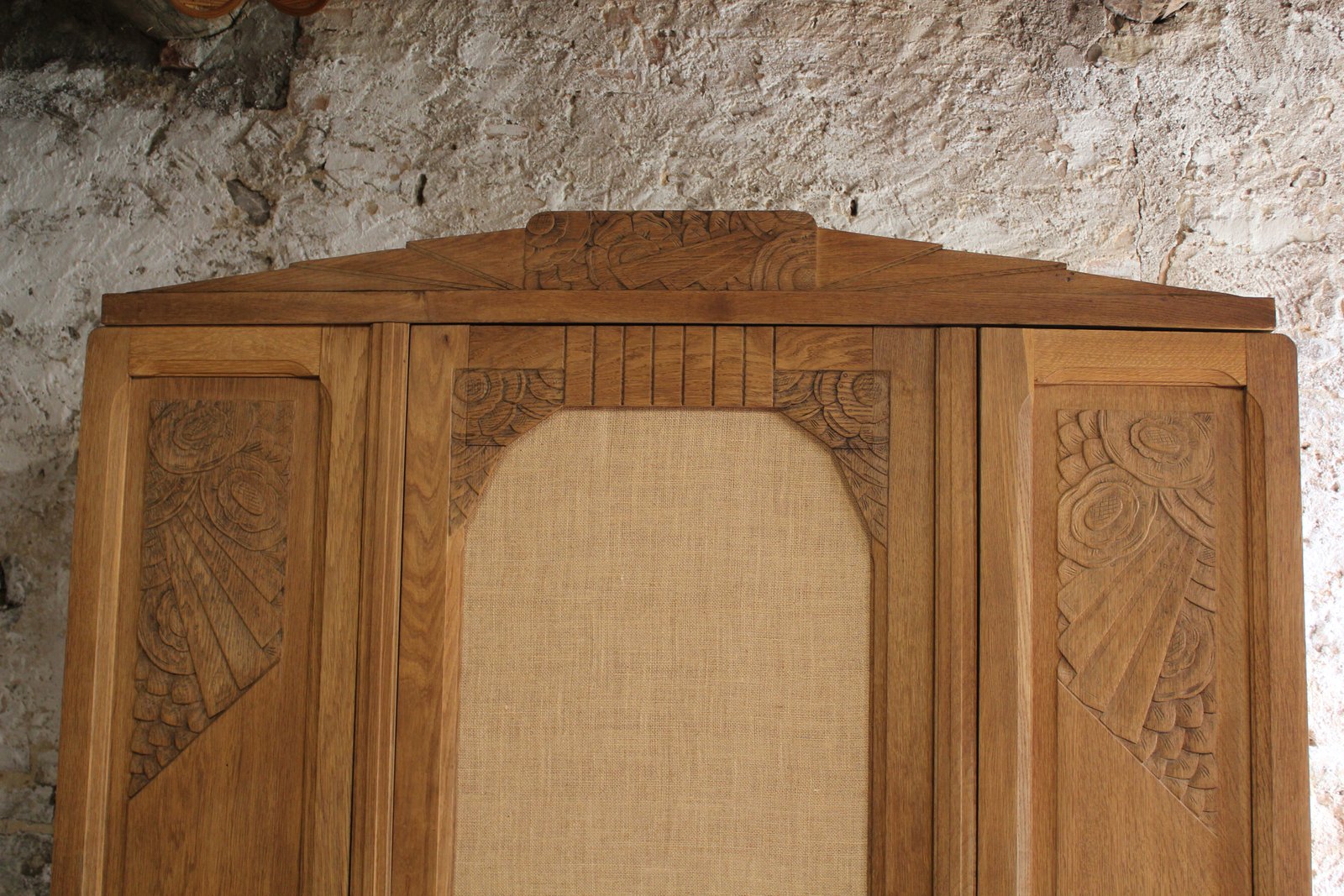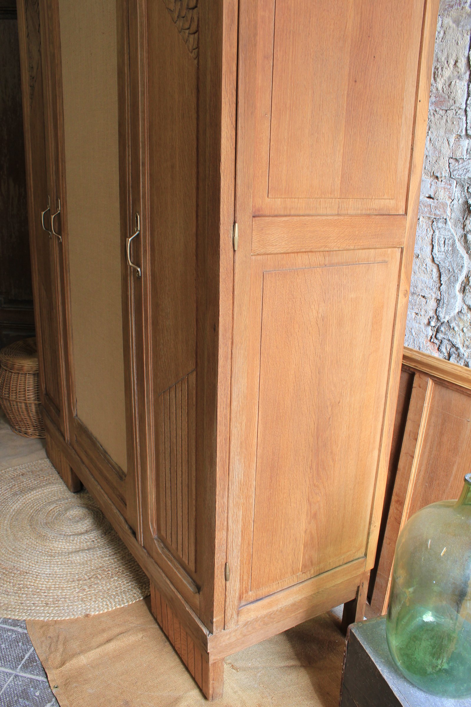Coup de cœur pour cette superbe armoire ancienne de style art déco ✨ Elle a été entièrement poncé et traité en préventif. Elle dispose de 3 étagères réglables sur crémaillère. Les clés ayant été perdues j'ai positionné des aimants pour une fermeture plus rapide et simple sur chaque porte. Le miroir a été remplacé par une toile de jute. L'extérieur a été entièrement vernis avec un vernis mat incolore. Dimensions. Hauteur 214cm. Longueur 150cm. Profondeur 48, 5cm. Elle est démontable.