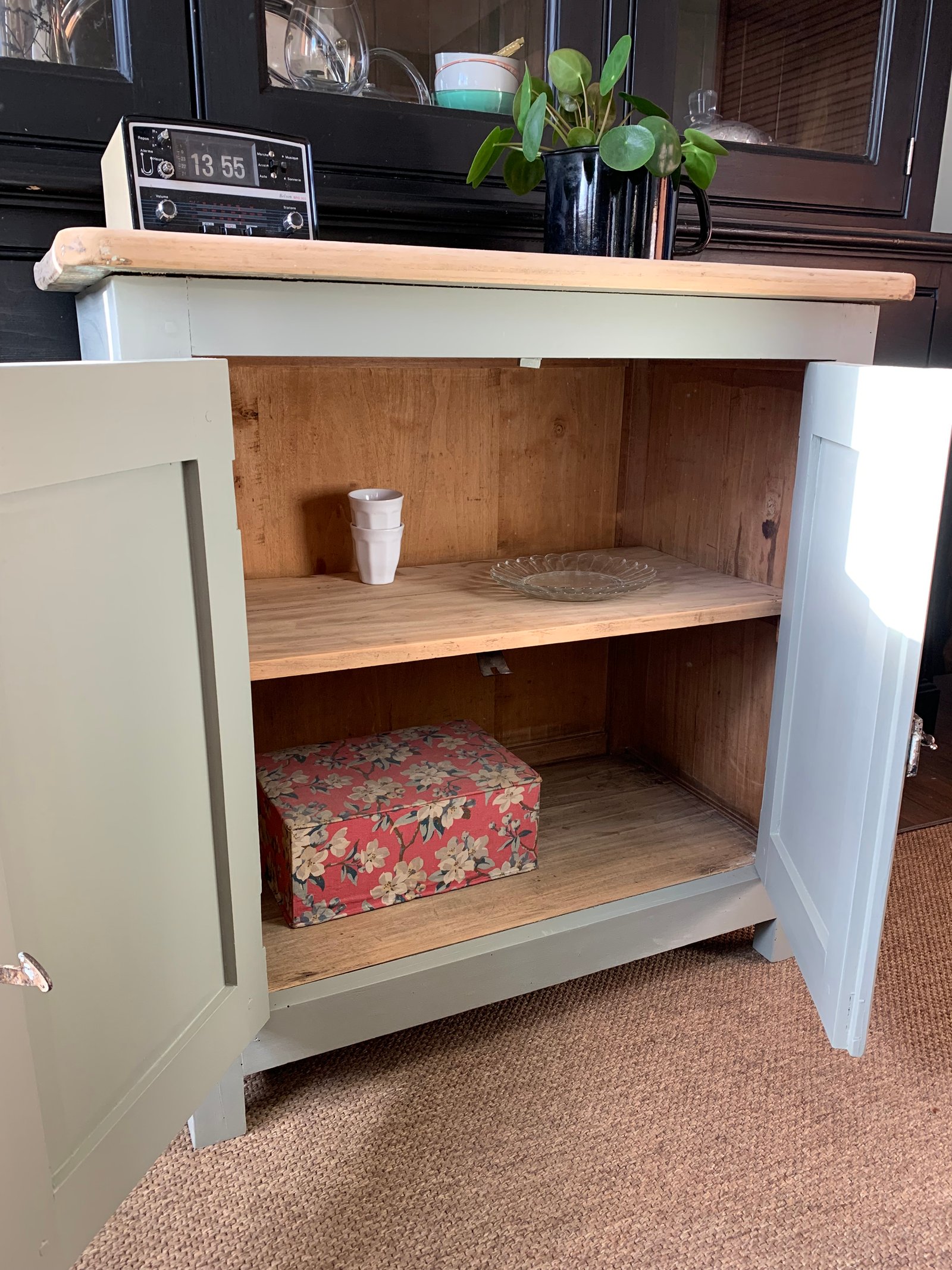 Buffet parisien entièrement décapé puis repeint dans une teinte douce mat, un mélange gris vert, idéal pour une chambre d’enfant. Beaucoup de cachet grâce aux anciennes couches de peinture conservées sur le verrou. Le plateau est brut, je peux soit le vernis soit le peindre également. Le meuble a été traité, il est en bon état général. 1 étagère sur tasseaux à l’intérieur. En bois massif ( hêtre + sapin )