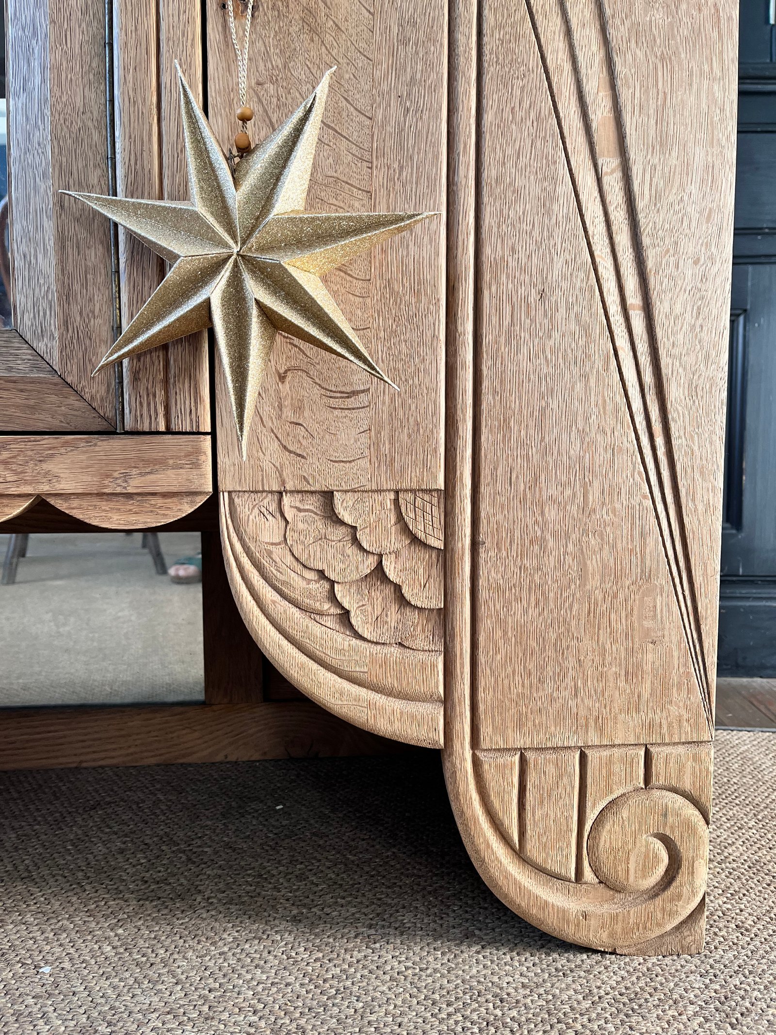 Enfilade art deco en chêne brut. Il s'agit du haut d'un vaisselier détourné en meuble bas. Il peut servir de bibliothèque ou de vaisselier. Les poignées et étagères sont en cours de rénovation. Un bois chaleureux couleur miel, une forme atypique ... il apportera beaucoup d'authenticité et d'originalité à votre deco. 129x101x36 cm