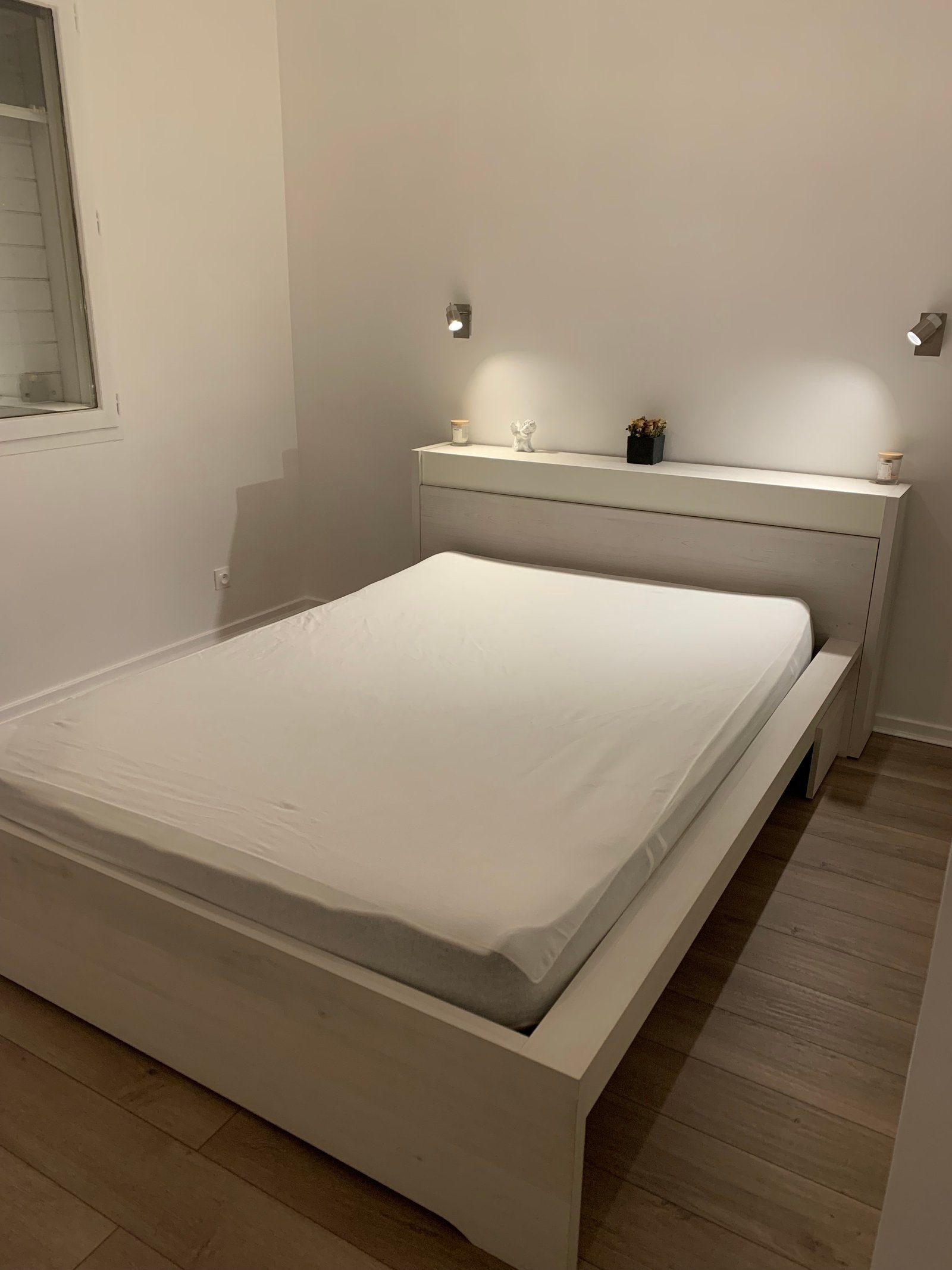 Lit double de couleur blanc, dimension 140x200 avec deux caissons de rangement (voir la dernière photo). Il dispose également de deux rangement de lit en guise de table de nuit qui sont intégrés sur chaque côté de la tête de lit et qu’il est possible d’ouvrir ou de fermer. Il y a un ou deux accrochages discrets (au besoin des photos supplémentaires peuvent être envoyées) mais reste en bon état. Le lit pourra être démonté avant qu’il soit récupéré.