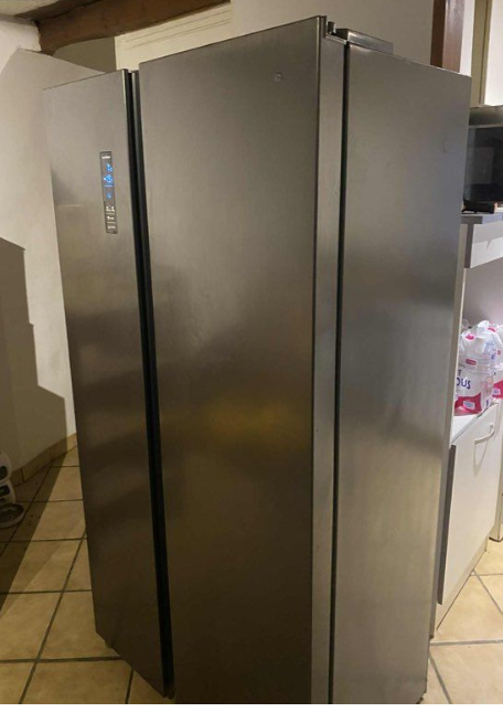 Réfrigérateur américain en finition inox, utilisé seulement quelques mois en attendant l’installation d’une cuisine équipée avec frigo encastrable, ce qui garantit un moteur quasiment neuf et un fonctionnement impeccable. Les éléments intérieurs sont encore sous plastique, preuve d’un usage très limité. Il produit des glaçons, offre un froid ventilé performant et peut se connecter à l’application dédiée selon le modèle, pratique pour gérer les réglages à distance. La couleur gris métal s’intègre facilement dans une cuisine moderne ou familiale. Il présente quelques traces et cabosses liées à un déménagement, uniquement esthétiques et sans impact sur ses performances. Idéal pour équiper une maison, un appartement ou une résidence secondaire avec un frigo grande capacité fiable et économique.