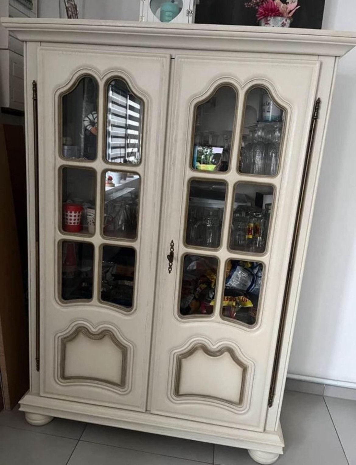 Salle à manger complète 3 pièces en chêne blanc provenant de la marque crack, style vintage. Composée de : bahut + vitrine + table et 6 chaises. * Bahut de 4 portes et 4 tiroirs , dimensions 231cm x 55,5 cm hauteur 107,5 cm * Vitrine de 2 portes, dimensions 122 x 45,5 cm hauteur 168,5 cm * Table 180x 85 cm (toujours protégé par une nappe ) Etat neuf.