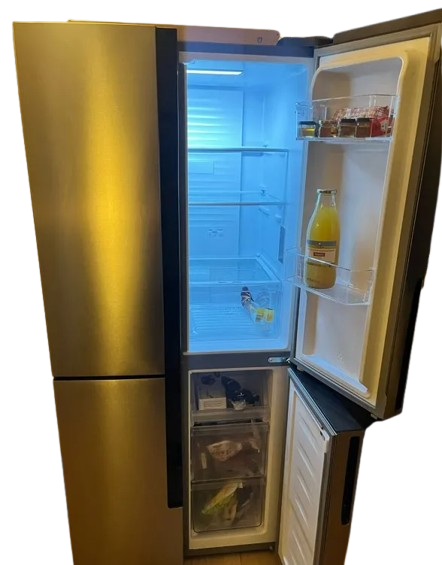 Réfrigérateur américain Gorenje gris en très bon état, avec double porte et une grande capacité de rangement idéale pour une famille ou pour ceux qui aiment organiser facilement leurs aliments. Sa couleur gris métal et sa finition moderne s’intègrent parfaitement dans une cuisine contemporaine. L’intérieur est particulièrement spacieux, avec de nombreuses étagères et balconnets, offrant un large volume aussi bien côté réfrigérateur que congélateur. Le distributeur d’eau et de glaçons en façade apporte un vrai confort d’utilisation au quotidien, et le système No Frost garantit un fonctionnement sans givre et un entretien simplifié. Propre, fiable et bien entretenu, ce frigo américain est parfait pour un usage quotidien ou une grande cuisine familiale.