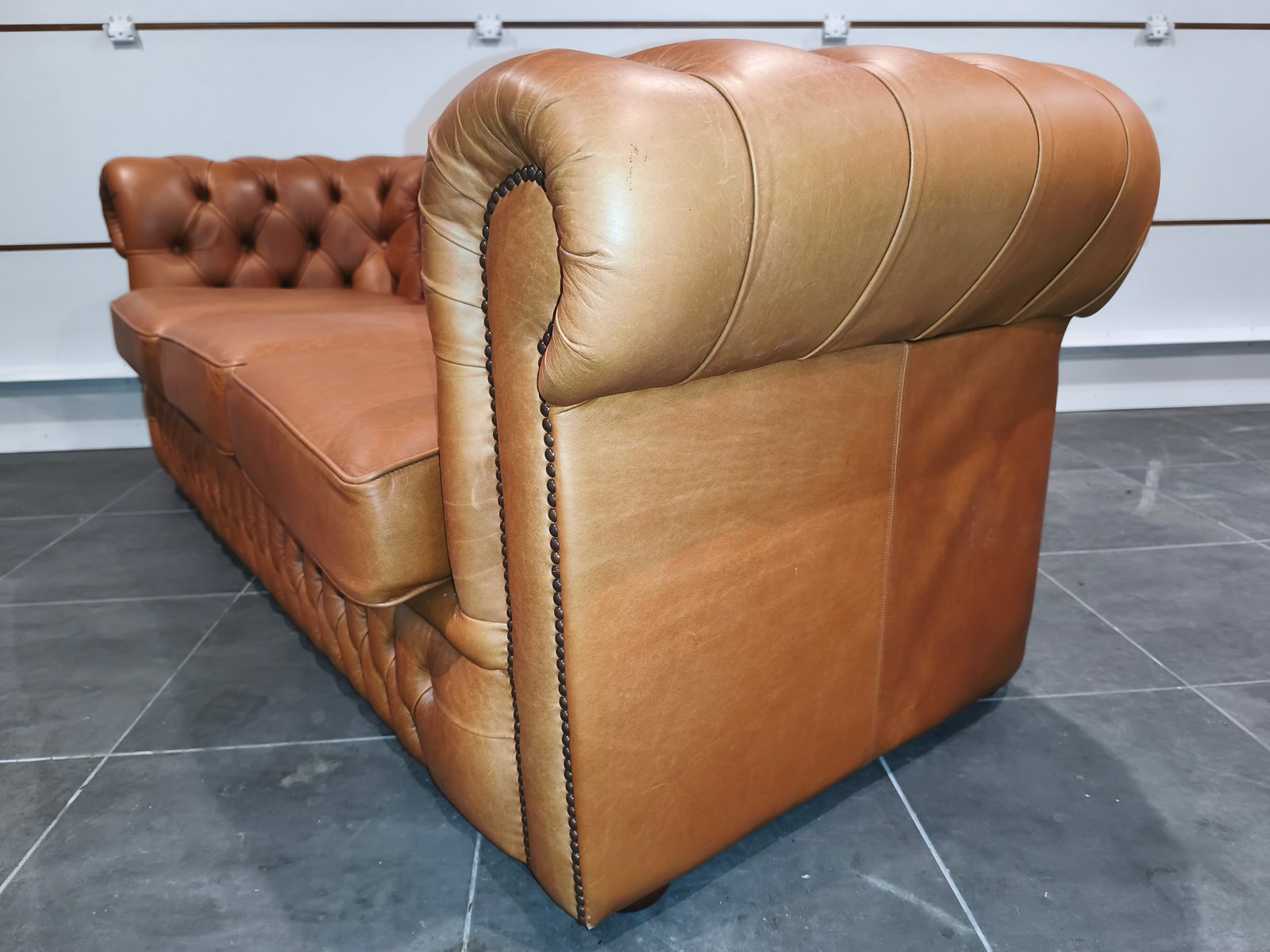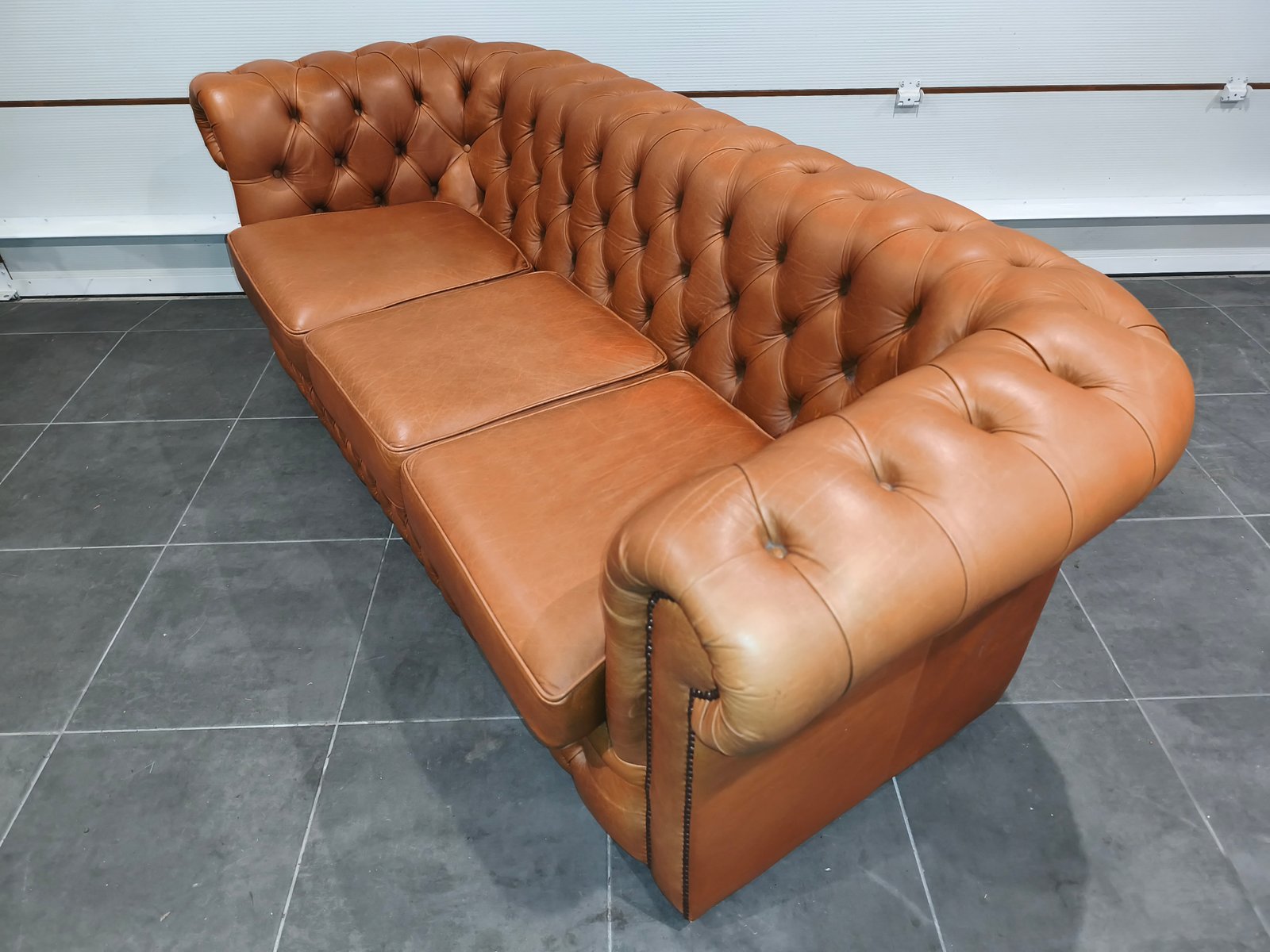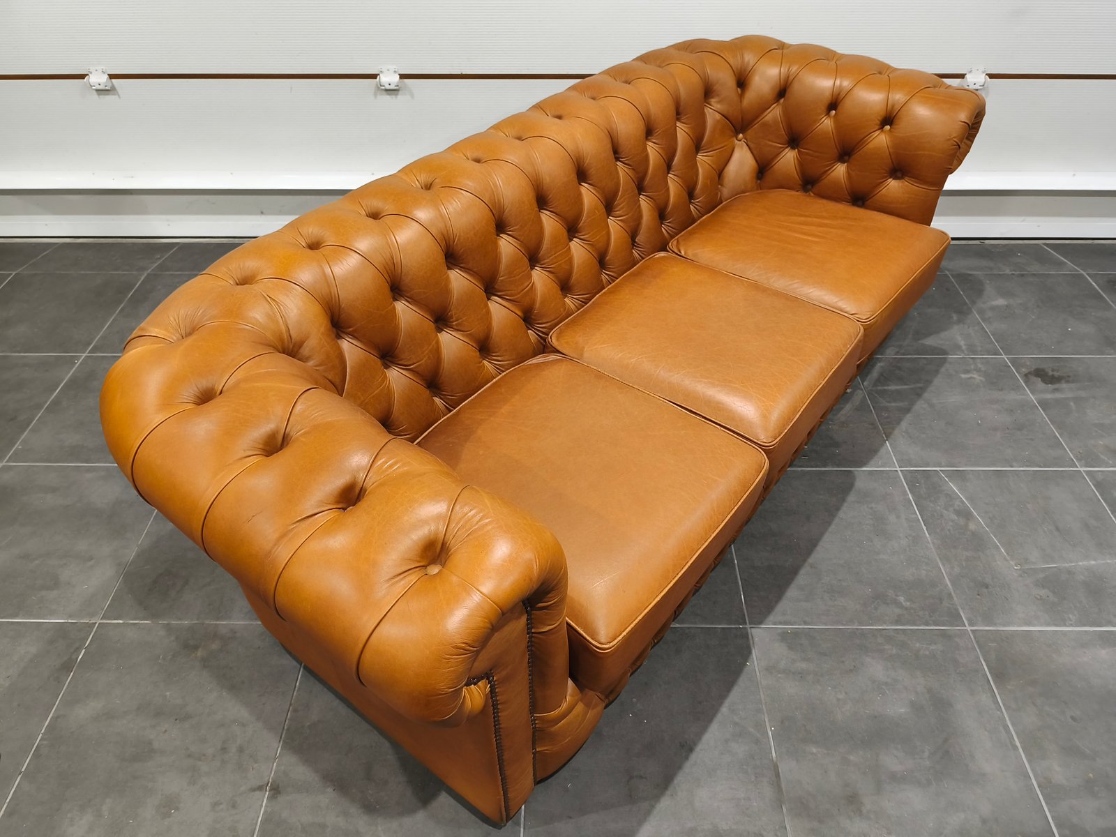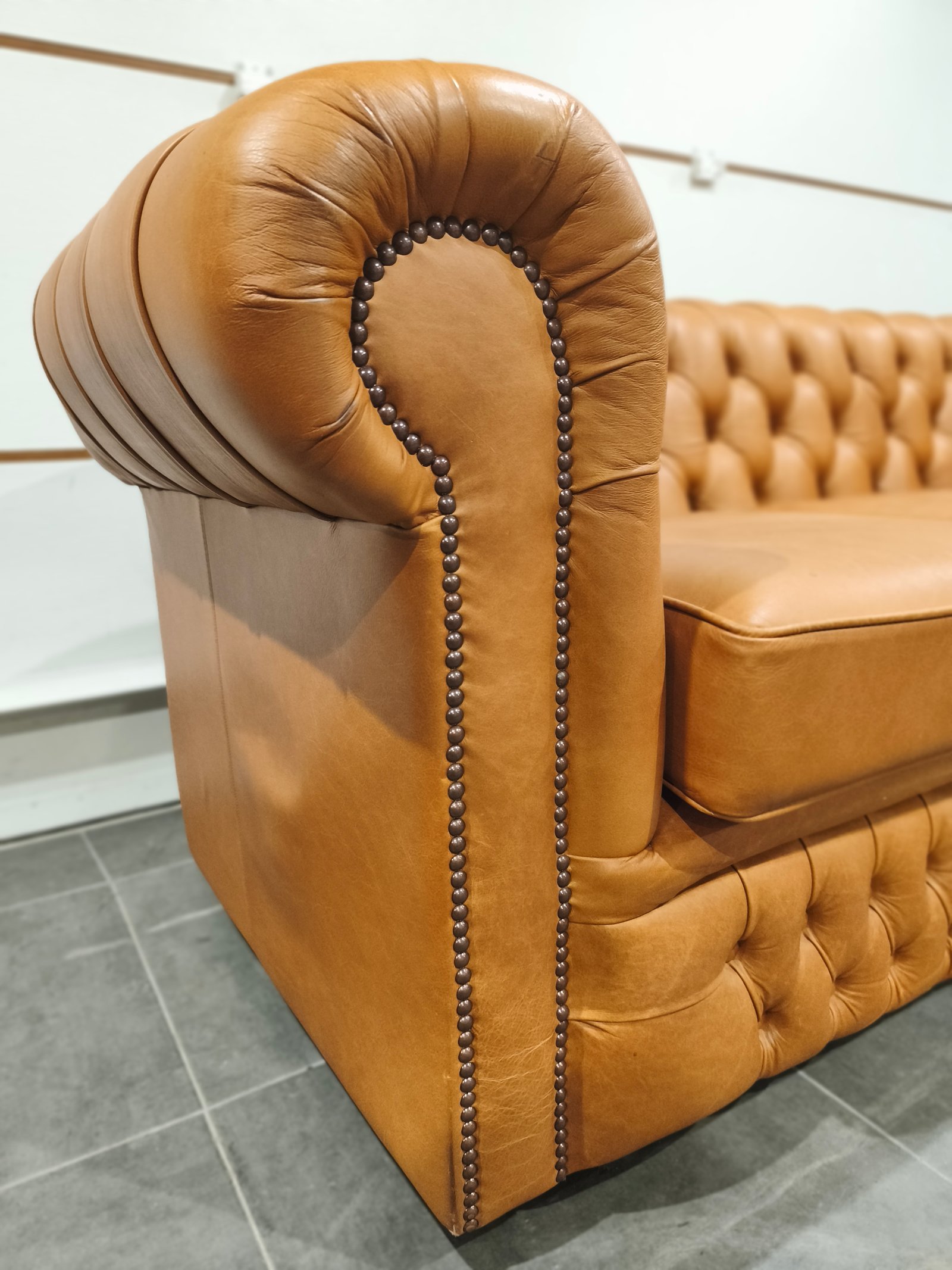 Je vend mon exceptionnel canapé chesterfield 3 places. Très beau style anglais de très grande qualité en cuir vache pleine fleur, patiné main de coloris jaune Vénitien et marron Alezan, suivant le type d'éclairage utilisé (lumière naturelle ou tamisée : l'ensemble des photos est réalisé avec ces deux types de lumières, afin de vous montrer la différence de teinte suivant l'éclairage). Ce canapé Chesterfild est totalement comme neuf puis qu'il n'a presque jamais servi : Aucun bouton ou clou manquant, aucune déchirure, aucune coupure : Le cuir est partout en très bon état. Il a toujours été très bien nourri avec de la crème : souple et très belle patine. Je suis non fumeur et sans animaux. Partie noble du cuir, laissant apparaître les caractéristiques de la peau et le grain. Montage entièrement réalisée sur ressorts et assise rembourrée. Dossier totalement capitonnés et assise composé de larges coussin : La classe du Chesterfield et le confort d'un canapé classique. Finition passepoil et cloutage à l'ancienne (accoudoirs). Dimension extérieure canapé : L205 x P92 x H79 Dimension assise canapé : L158 x P56 x H50 Plus de photos sur demande. Ce canapé a été acheté neuf plus de 3000 € neuf ; je le revend seulement 870 euros, soit moins d'1/3 de son prix neuf, alors qu'il est totalement comme neuf. Ce canapé est identifiable dans des films anglais et américains comme Peaky blinders ou House of cards ou Sherlock holmes ou crown ou des films de Mafia comme scarface ou Le parrain. Il sera idéal pour une pub anglais ou irlandais ou un restaurant ou un bar à vin ou une maison close ou une écurie ou centre équestre en mode Thomas Shelby ou château ou hôte particulier ou maison d'hôtel. Style red light district vintage loft industriel indus vintage rétro ancien déco riche classe ancien vieux décoration luxure atelier cheval noble
