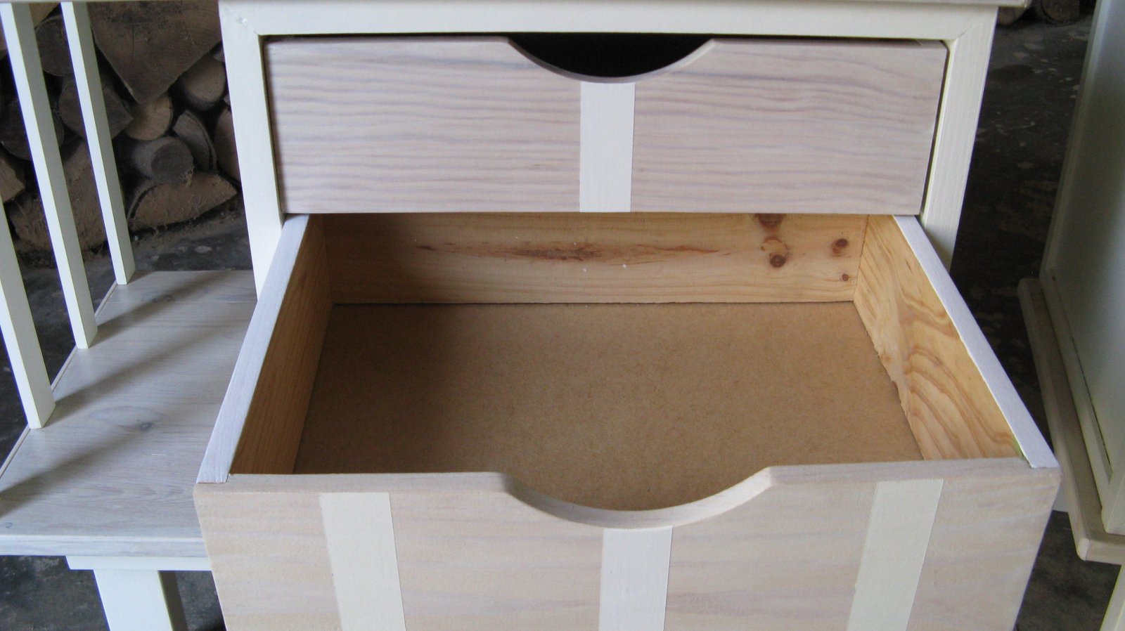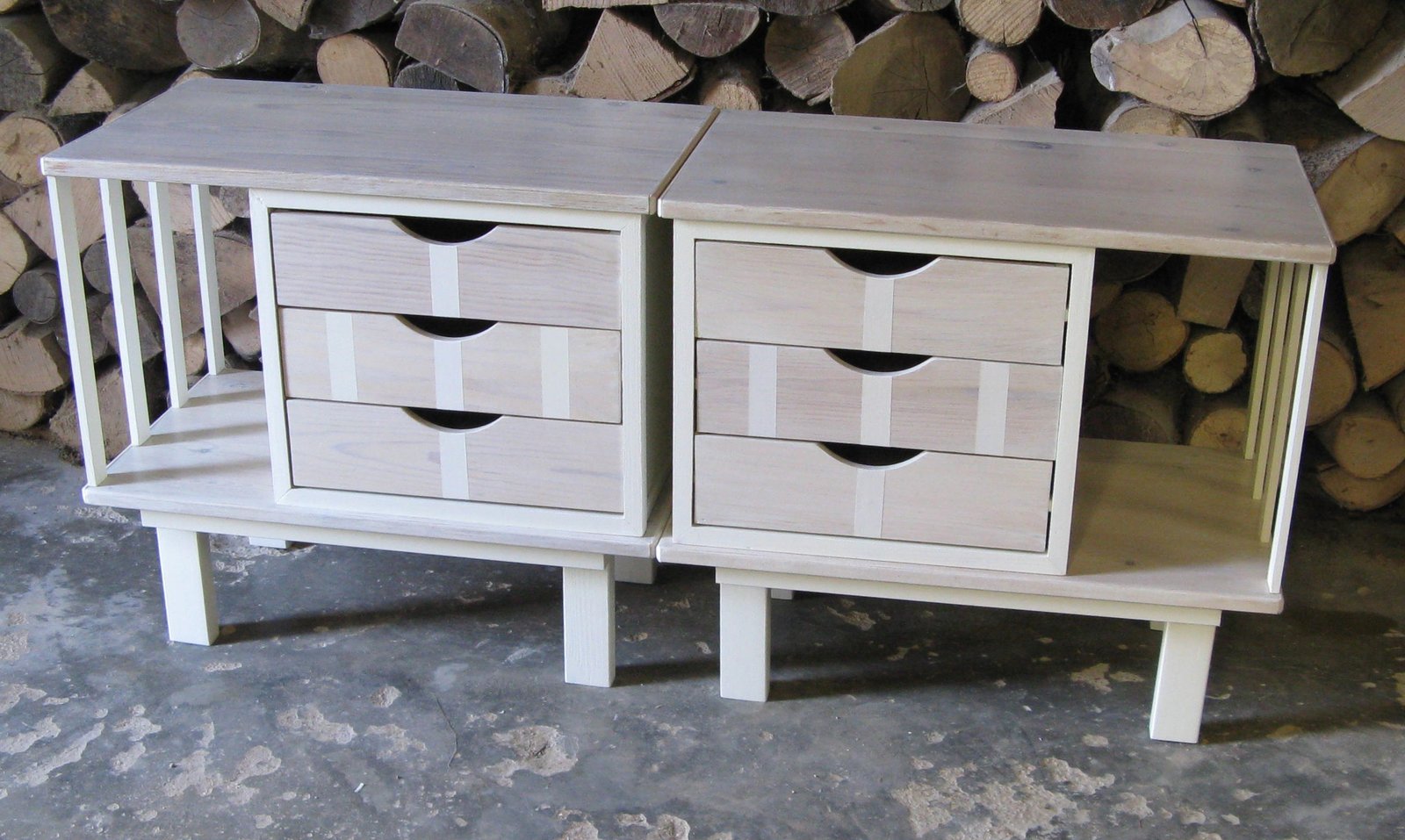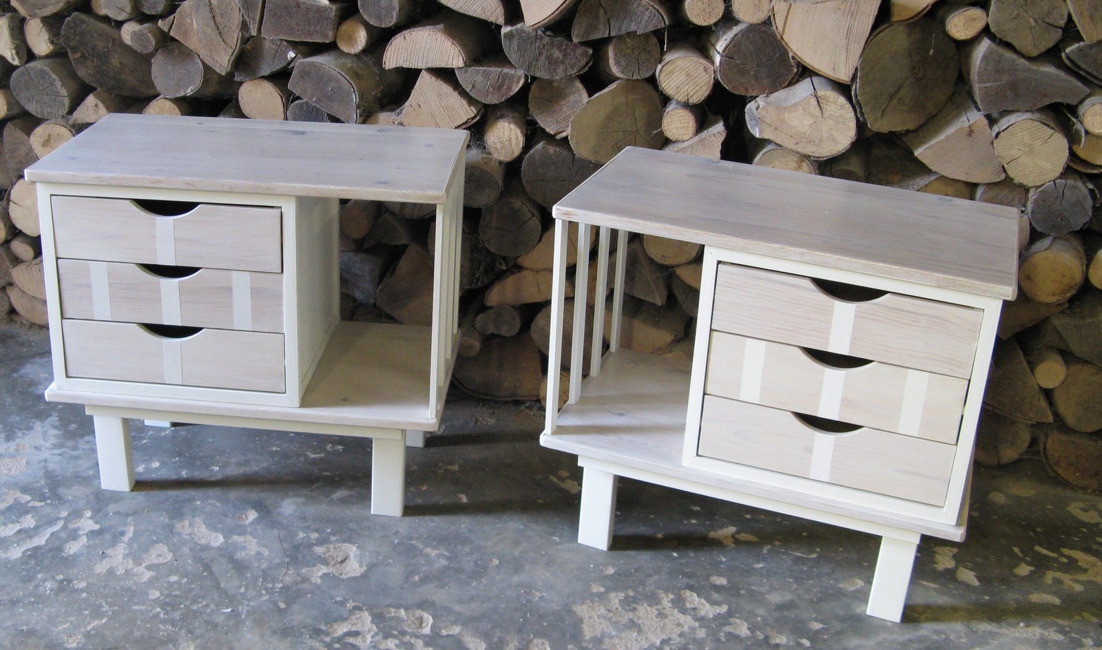 Deux chevets uniques au style épuré et moderne. Ils ont été réalisés a partir de deux blocs tiroirs et d’une étagère. Le tout poncé, blanchi et verni pour une protection maximum. Ils se composent de trois tiroirs pour la partie rangement et d’une étagère latérale pour la partie déco. Ils sont parfaitement opposables. A la fois moderne, chic et nature, ils peuvent s’intégrer dans ne nombreux intérieurs. Au salon, ils seront parfaits en bout de canapé. Dimensions : L 62 cm P 34 cm H 56,5 cm