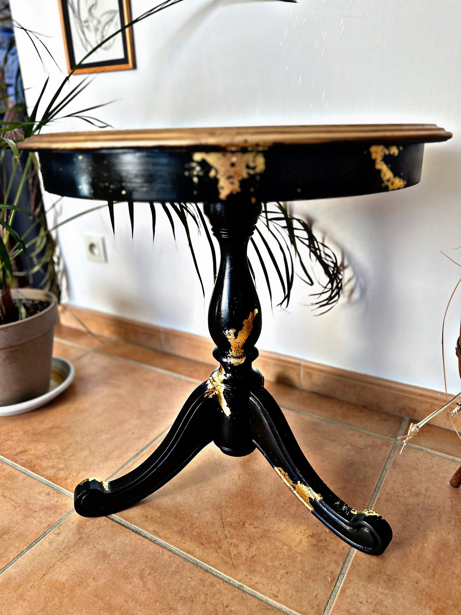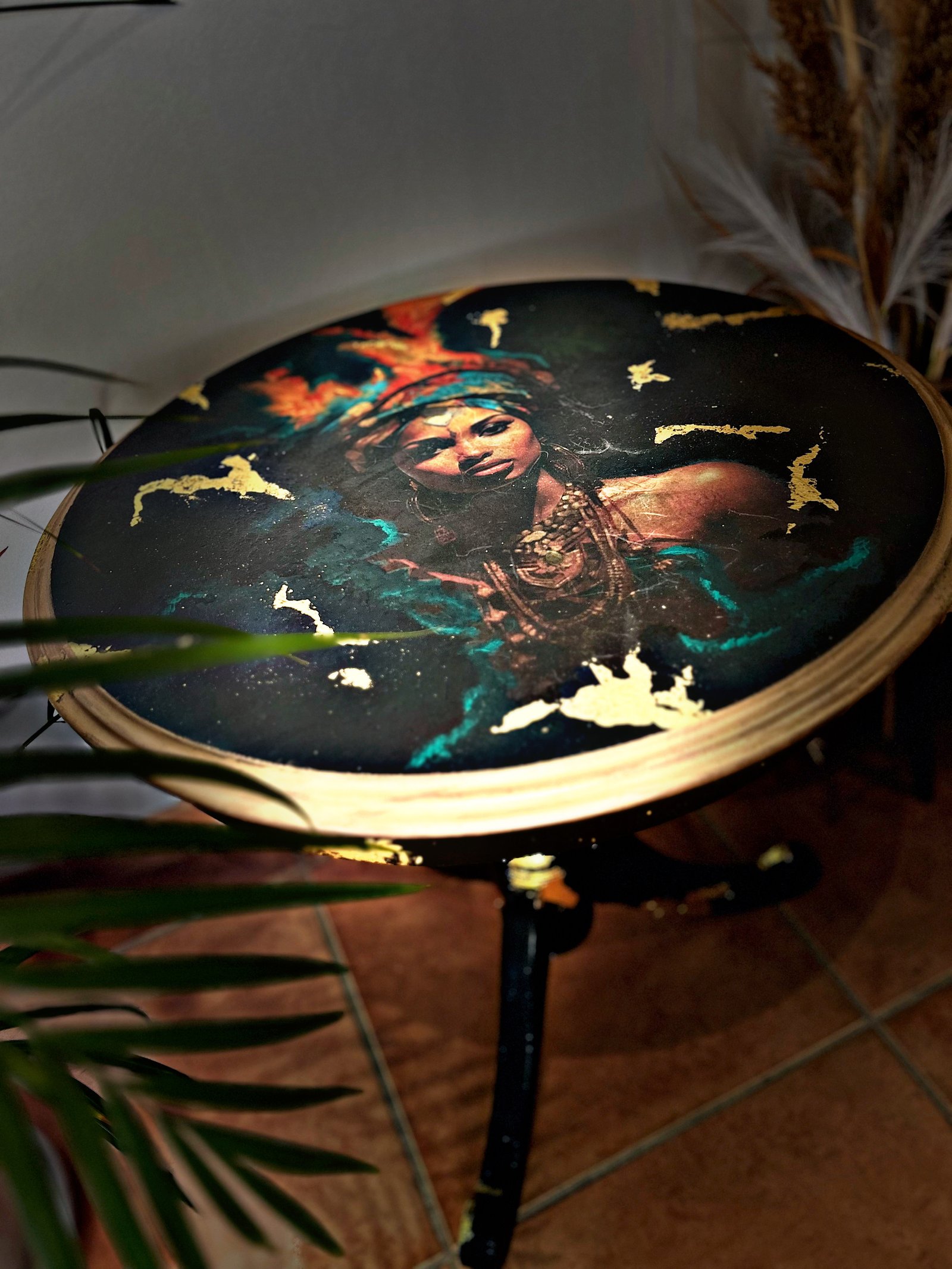 Indomptée Une pièce née du geste et du désordre assumé. Plateau et pied ont été travaillés dans une même énergie brute : superpositions de peinture, touches de doré, application volontairement imparfaite, presque sauvage. Sur le plateau, la matière prend le dessus : fleurs en relief, coulures de peinture en relief, pour créer une texture vivante, instinctive, sans contrôle excessif. Indomptée incarne une femme libre, qui n’a pas peur de se salir les mains et de laisser la matière parler.