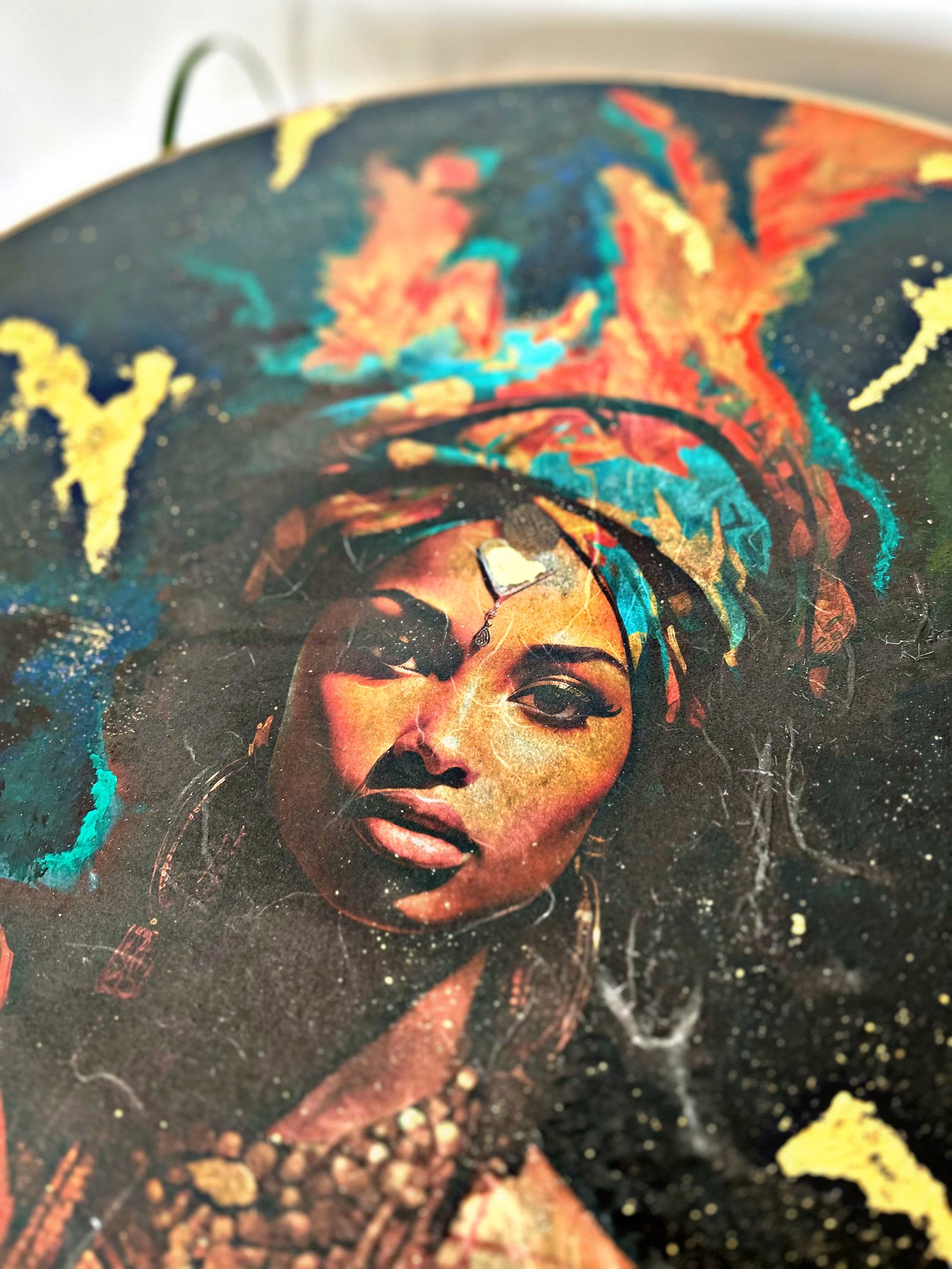 Pièce unique issue de la collection Les musées du monde. Ce guéridon est né d’un dialogue entre deux mondes. En partie basse, des teintes profondes et foncées évoquent la Terre, les racines, l’ancrage, en lien avec le rapport sacré que les peuples amérindiens entretiennent avec la nature. En partie haute, la lumière prend place : un plateau peint représentant une figure amérindienne, accompagnée de symboles oniriques (lune, plume…), entre veille et rêve. Un meuble à la fois fonctionnel et artistique, pensé comme un objet de contemplation autant que d’usage Idéal en guéridon, bout de canapé ou pièce forte dans un intérieur singulier. Création artisanale, pièce unique.