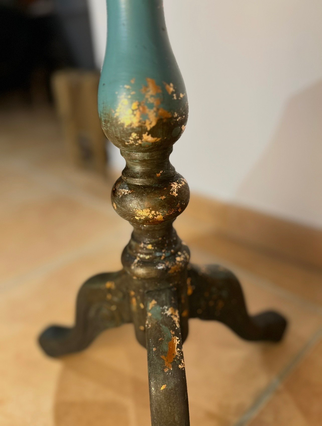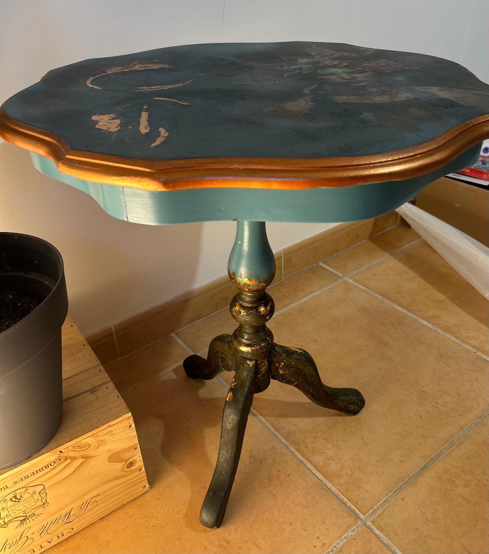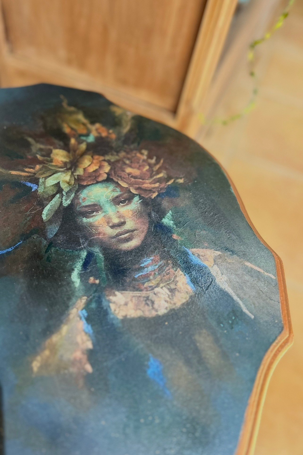 Indomptée Une pièce née du geste et du désordre assumé. Plateau et pied ont été travaillés dans une même énergie brute : superpositions de peinture, touches de doré, application volontairement imparfaite, presque sauvage. Sur le plateau, la matière prend le dessus : fleurs en relief, coulures de peinture en relief, pour créer une texture vivante, instinctive, sans contrôle excessif. Indomptée incarne une femme libre, qui n’a pas peur de se salir les mains et de laisser la matière parler.