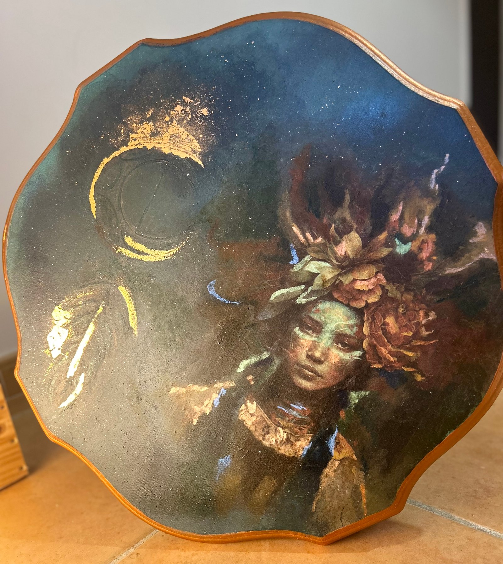 Pièce unique issue de la collection Les musées du monde. Ce guéridon est né d’un dialogue entre deux mondes. En partie basse, des teintes profondes et foncées évoquent la Terre, les racines, l’ancrage, en lien avec le rapport sacré que les peuples amérindiens entretiennent avec la nature. En partie haute, la lumière prend place : un plateau peint représentant une figure amérindienne, accompagnée de symboles oniriques (lune, plume…), entre veille et rêve. Un meuble à la fois fonctionnel et artistique, pensé comme un objet de contemplation autant que d’usage Idéal en guéridon, bout de canapé ou pièce forte dans un intérieur singulier. Création artisanale, pièce unique.