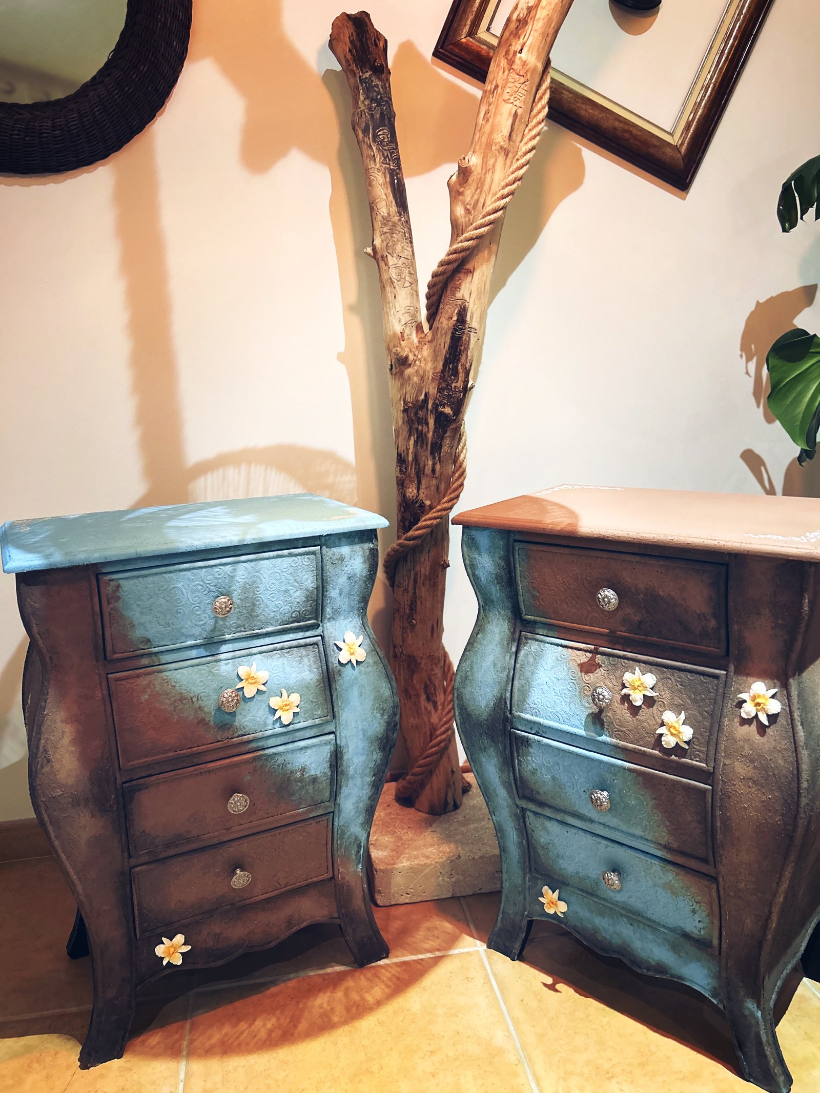 Anciens chevets relookés par moi-même, avec gôut. Ils ont été poncés à blanc ; le bois est de l'acajou. Laissé par endroits à l'état brut, et à d'autres peint couleur calisson (coloris Tollens professionnel). Joliment décorés de papiers peints de qualité, ils trouveront leur place dans une chambre ou dans une entrée...