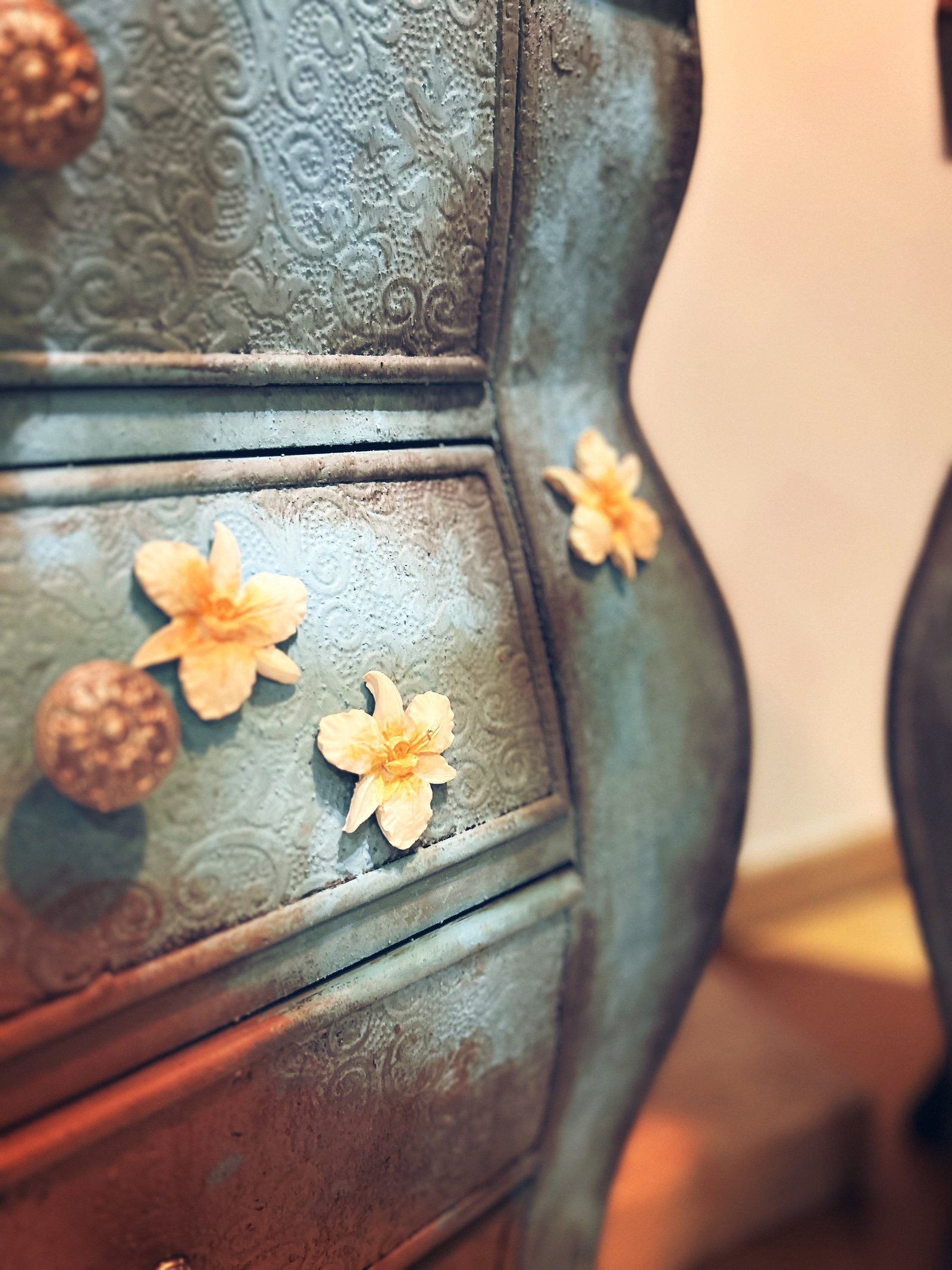 sublime commode 2 tiroirs bombée, entièrement rénovée à la main avec beaucoup d’amour. Pièce unique au style shabby chic romantique. Peinture prune foncée profond et veloutée sur le cadre et les côtés, motif central délicat préservé (scène de ballerine poétique entourée de fleurs et textures anciennes), rehaussé de touches d’or appliquées manuellement pour des reflets subtils et élégants. Effet vieilli doux, patine authentique, lignes légèrement déstructurées – un vrai coup de cœur ! Détails qui font la différence : • Poignées droites classiques en finition dorée (simples et raffinées) • Forme bombée typique style Louis XV revisité • Tiroirs fonctionnels, glissent parfaitement, intérieur propre • beau volume de rangement, idéale pour chambre, entrée ou coin cosy) Travail artisanal soigné, fait avec passion – elle a une vraie âme