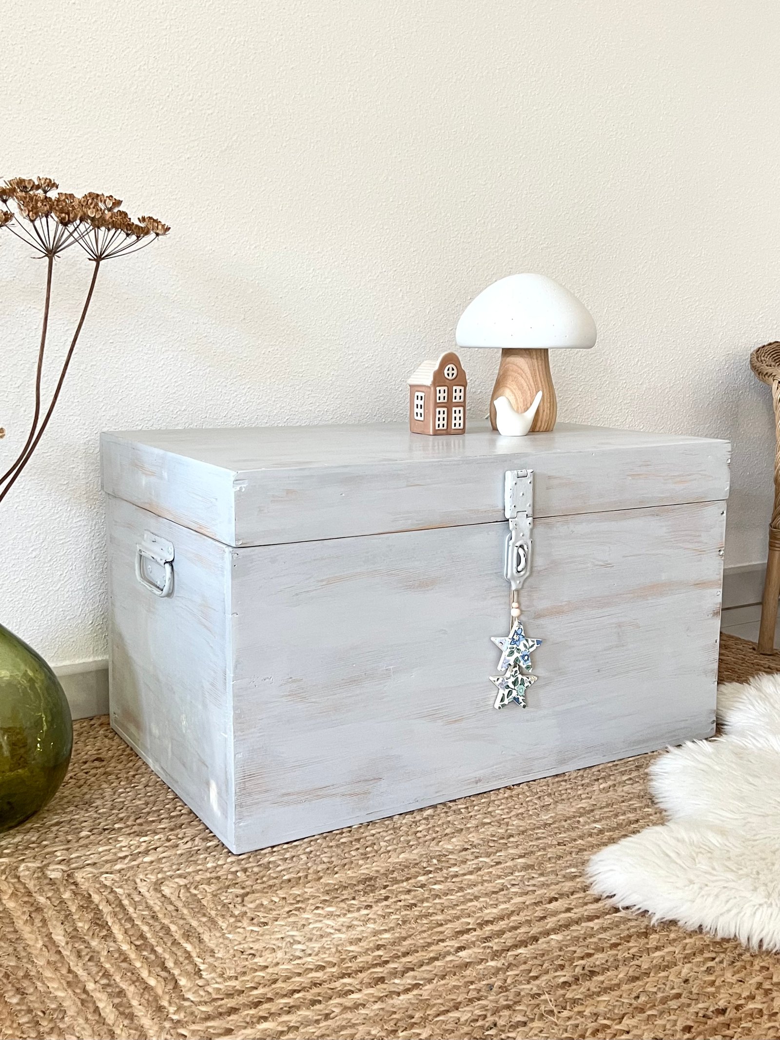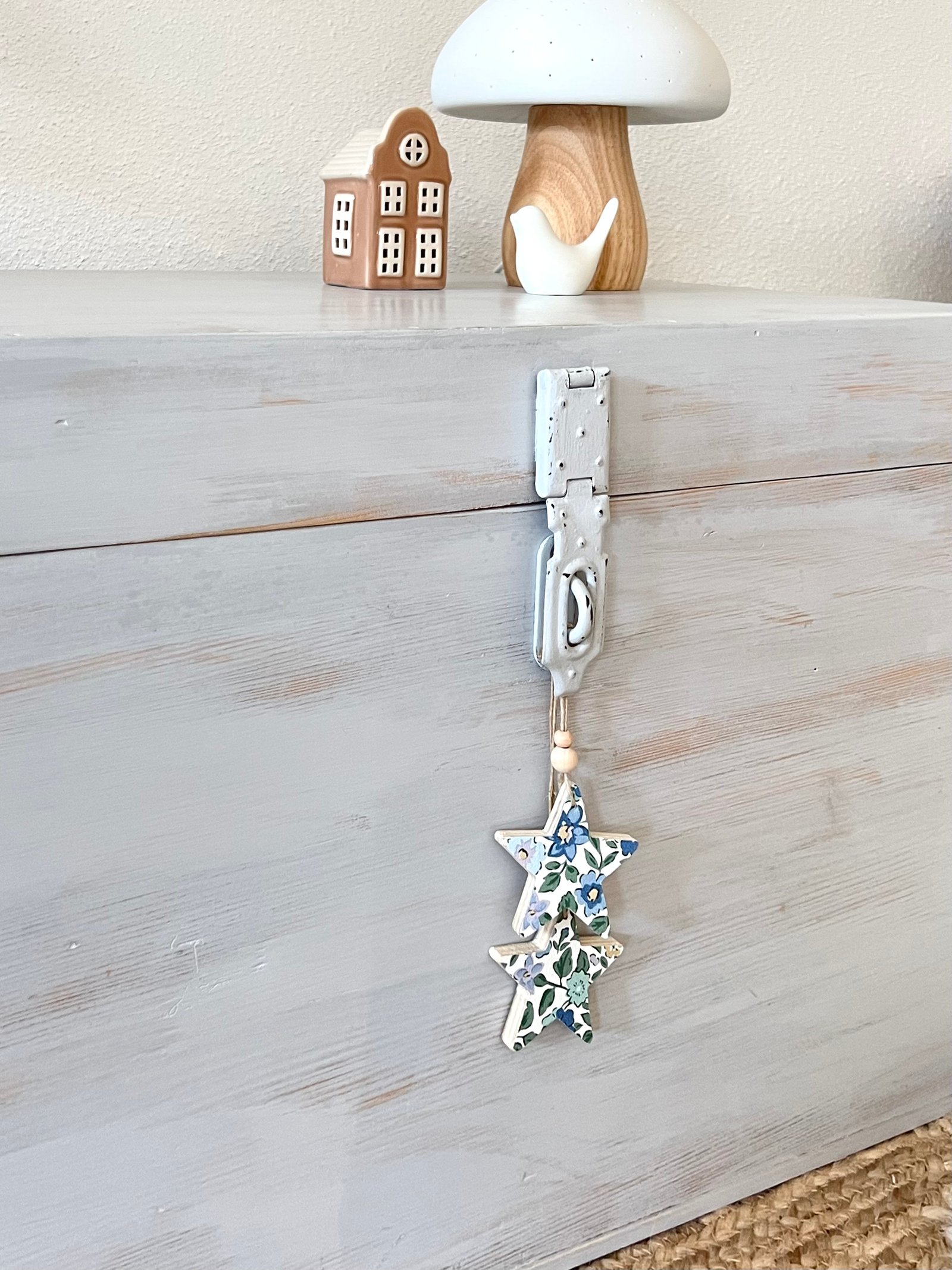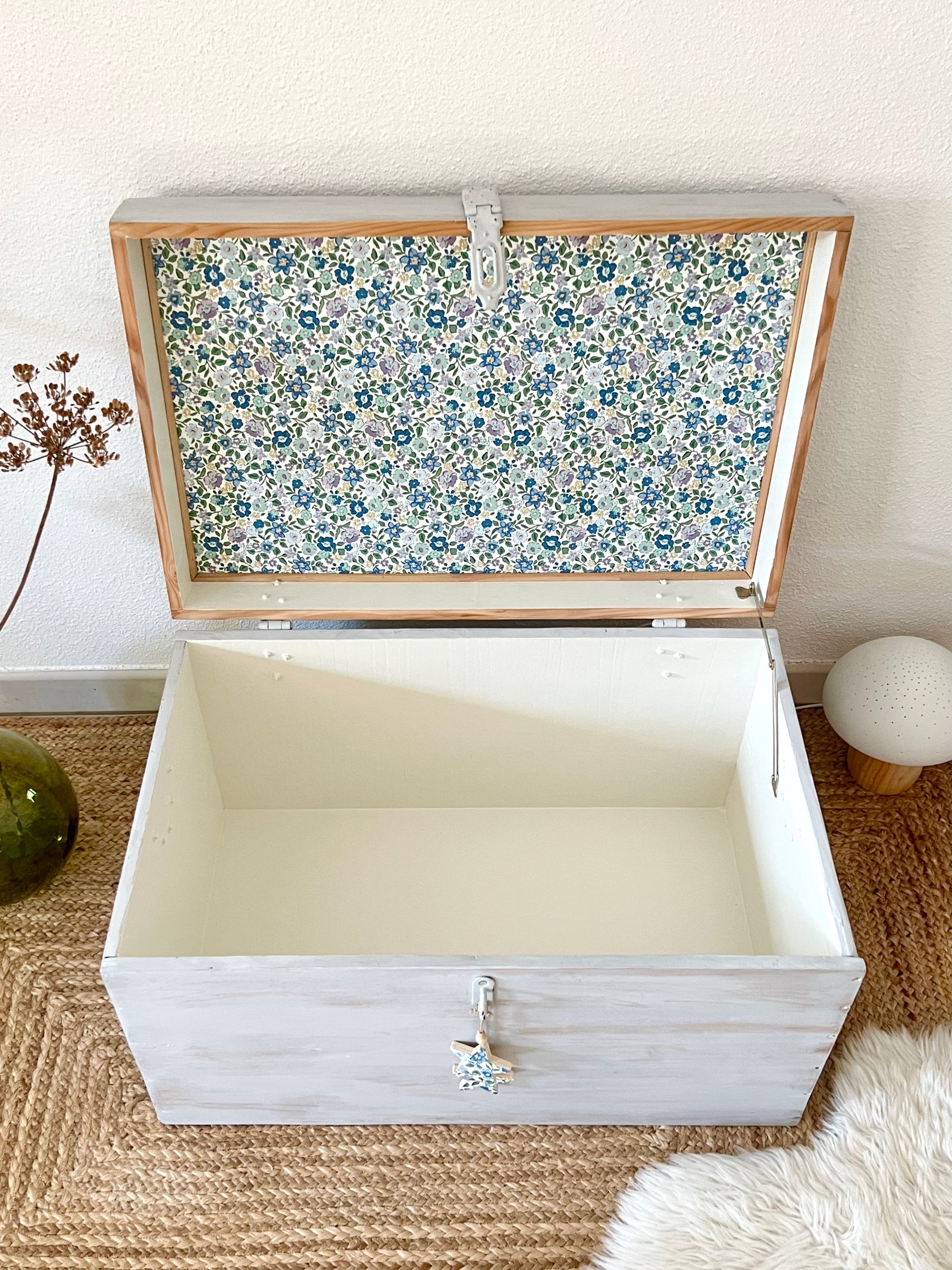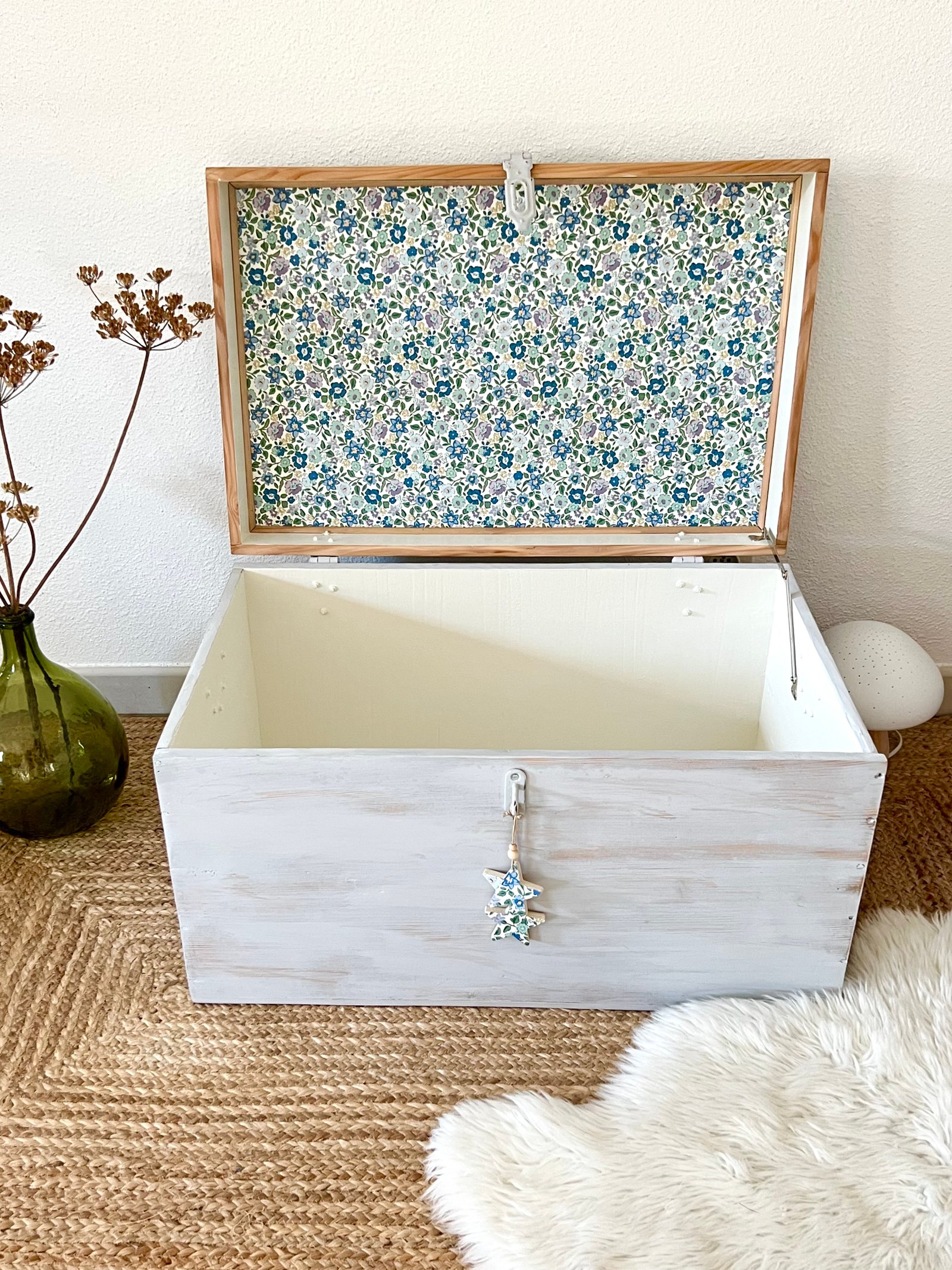 Jolie malle ancienne en bois. Elle a été entièrement restaurée et patinée en gris clair. L'intérieur a été habillé avec un papier peint liberty et des petites étoiles en bois assorties au papier ont été réalisées pour les suspendre à la serrure. Cette malle sera parfaite dans une chambre comme coffre à jouets ou pour y ranger du linge de maison. Elle trouvera aussi sa place dans un salon pour y ranger les plaids ou autre. Elle apportera à votre déco une touche unique et remplie de charme. Dimensions : Largeur 70 cm Hauteur 40,5 cm Profondeur 45 cm N'hésitez pas si vous avez des questions, j'y répondrai avec plaisir.