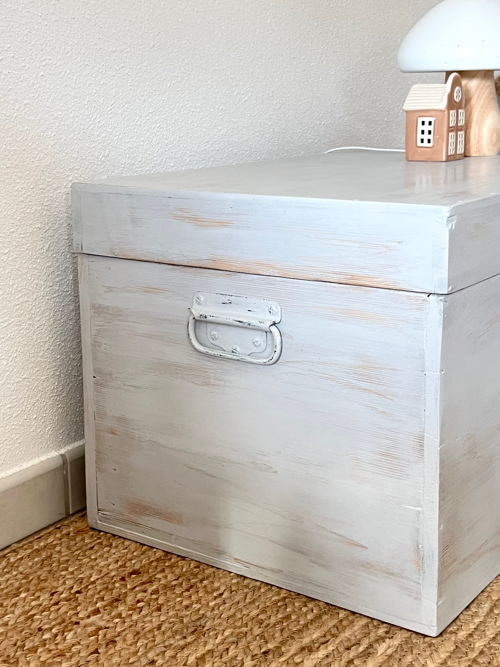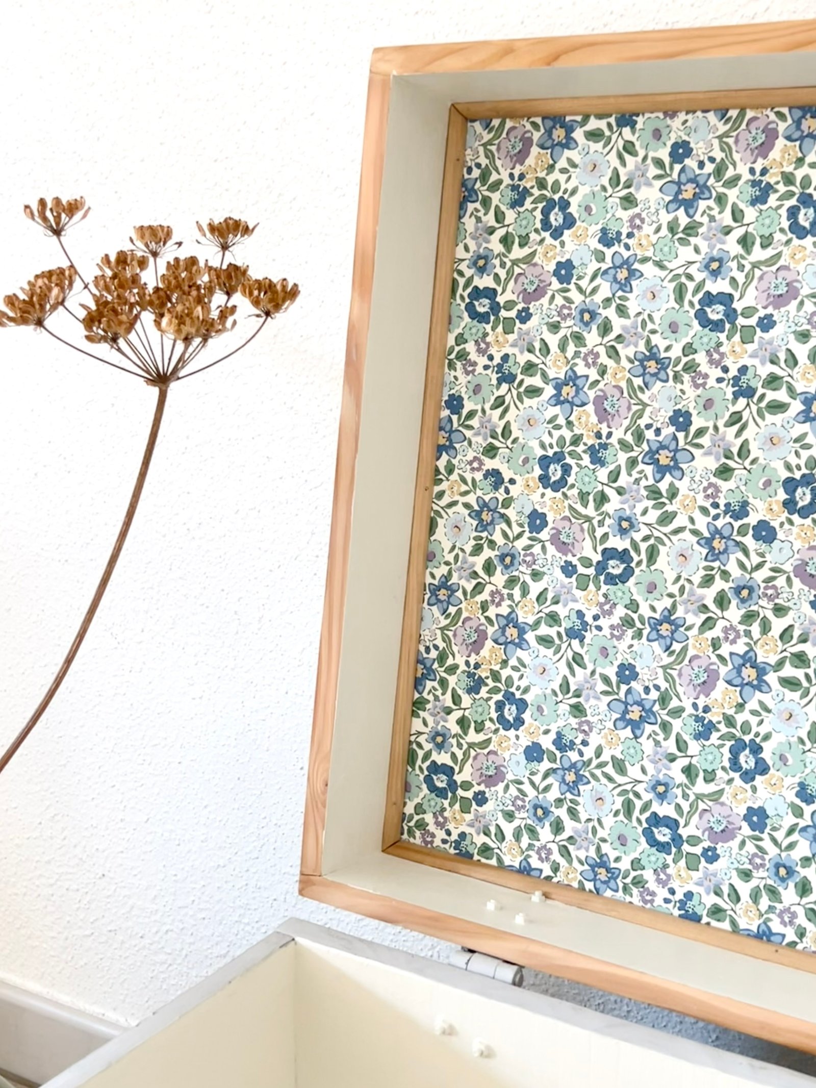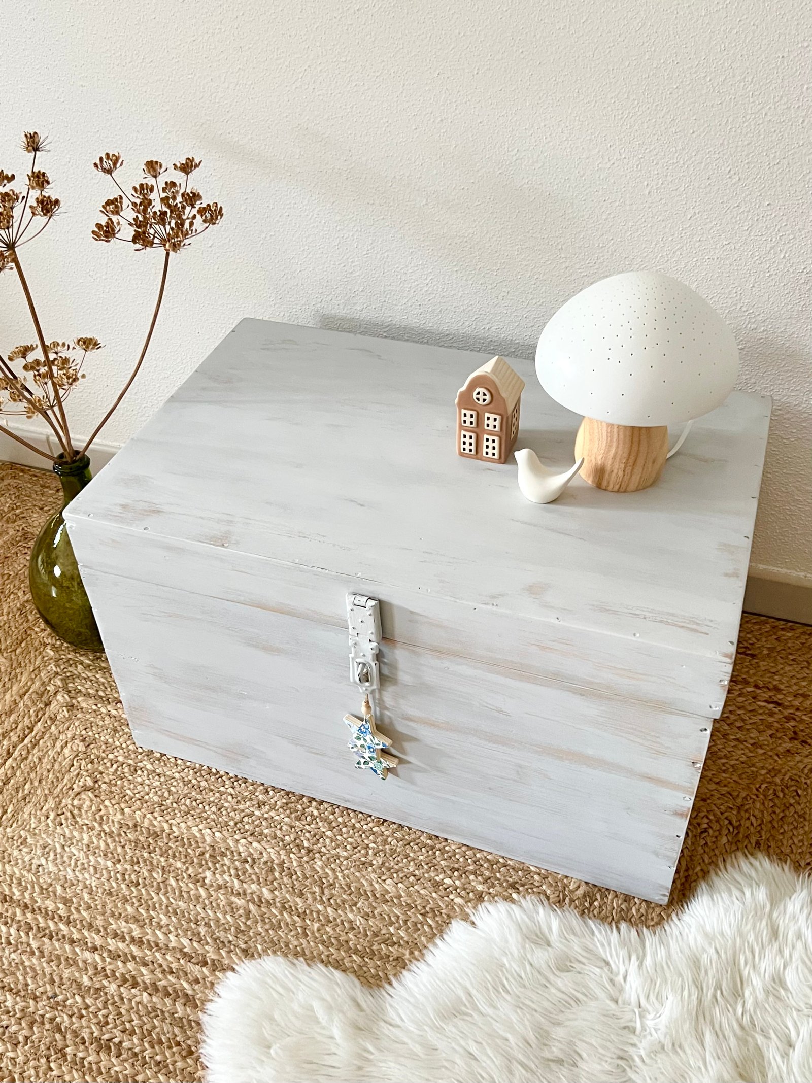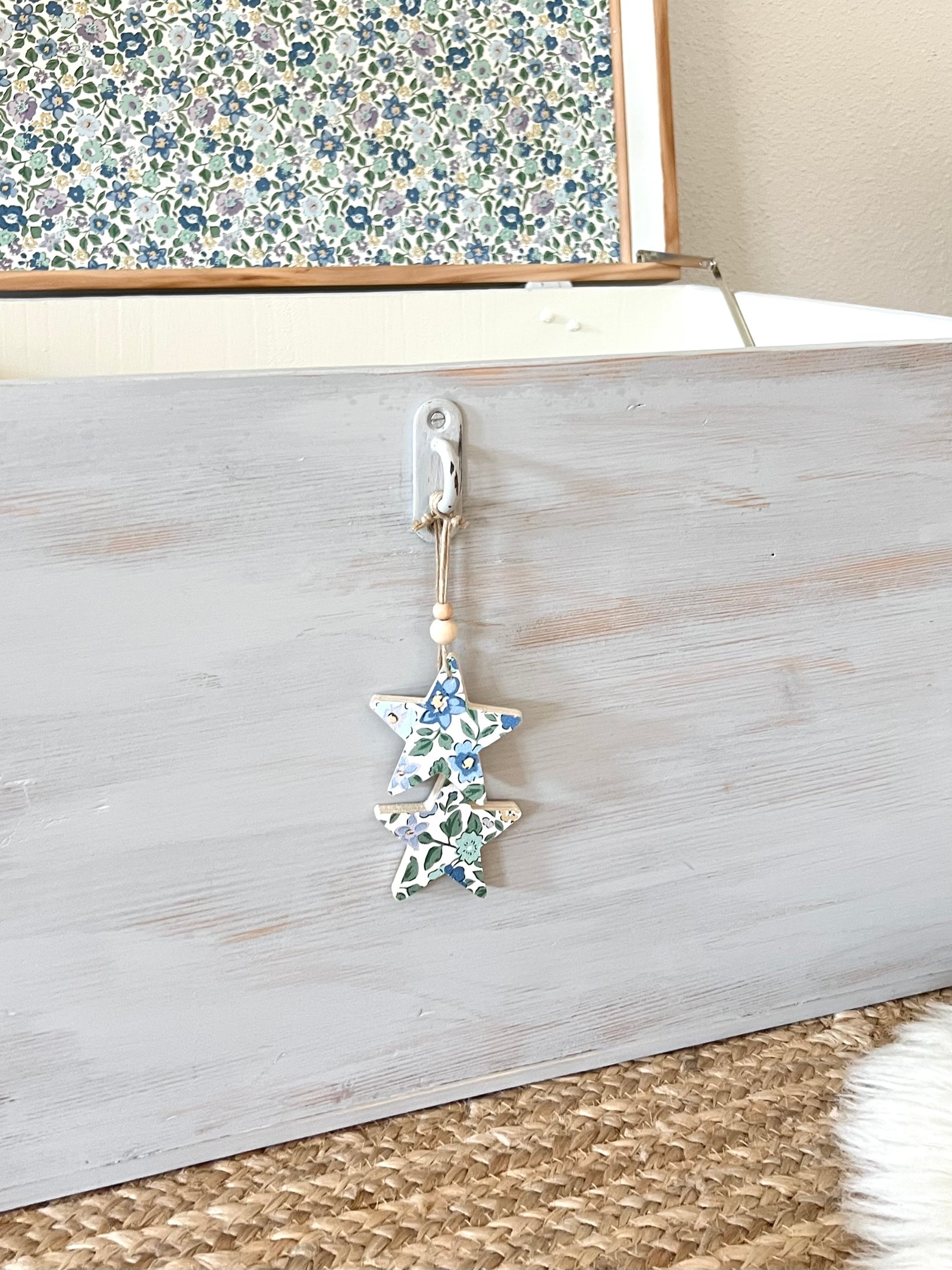 Jolie malle ancienne en bois. Elle a été entièrement restaurée et patinée en gris clair. L'intérieur a été habillé avec un papier peint liberty et des petites étoiles en bois assorties au papier ont été réalisées pour les suspendre à la serrure. Cette malle sera parfaite dans une chambre comme coffre à jouets ou pour y ranger du linge de maison. Elle trouvera aussi sa place dans un salon pour y ranger les plaids ou autre. Elle apportera à votre déco une touche unique et remplie de charme. Dimensions : Largeur 70 cm Hauteur 40,5 cm Profondeur 45 cm N'hésitez pas si vous avez des questions, j'y répondrai avec plaisir.