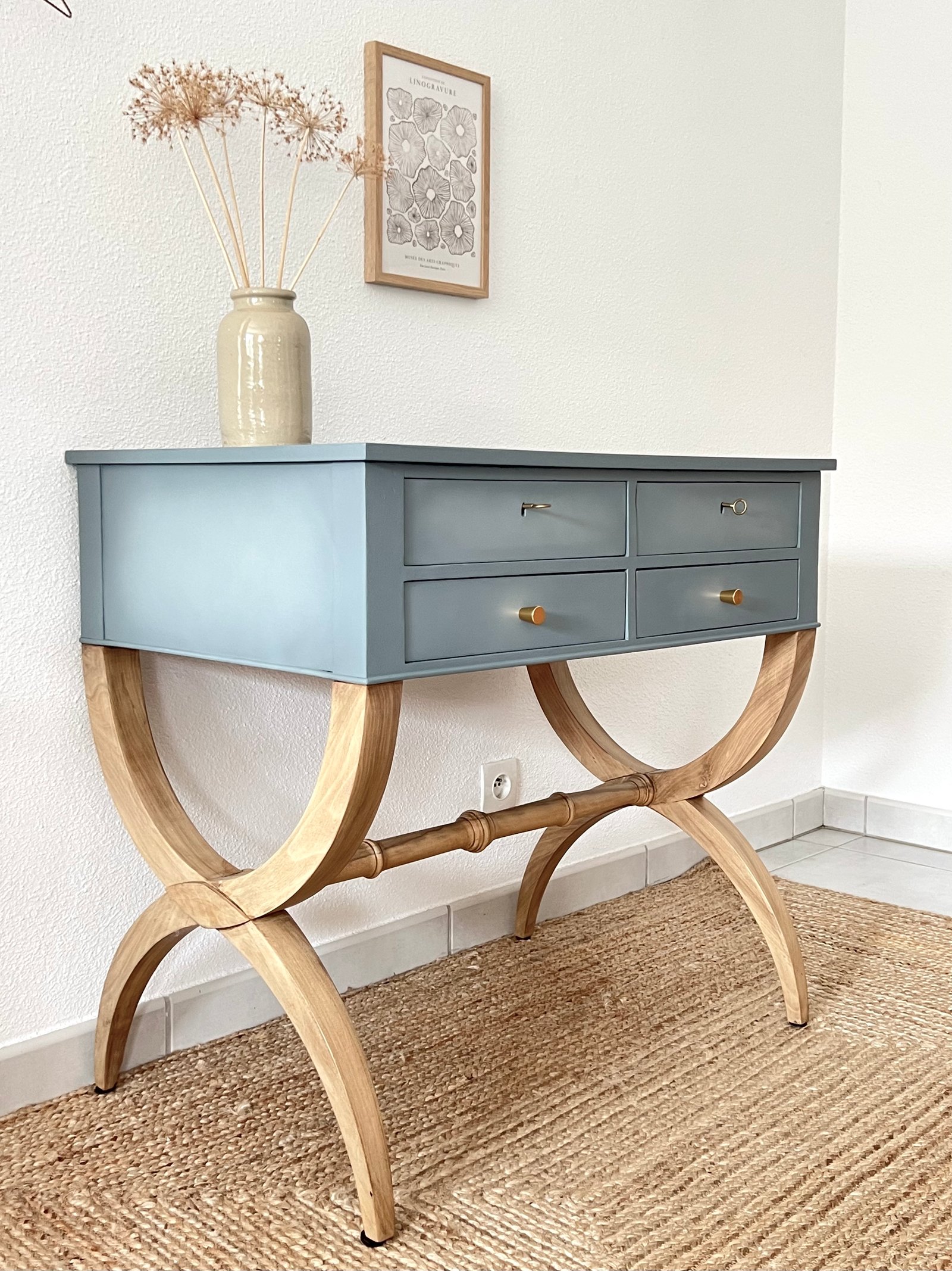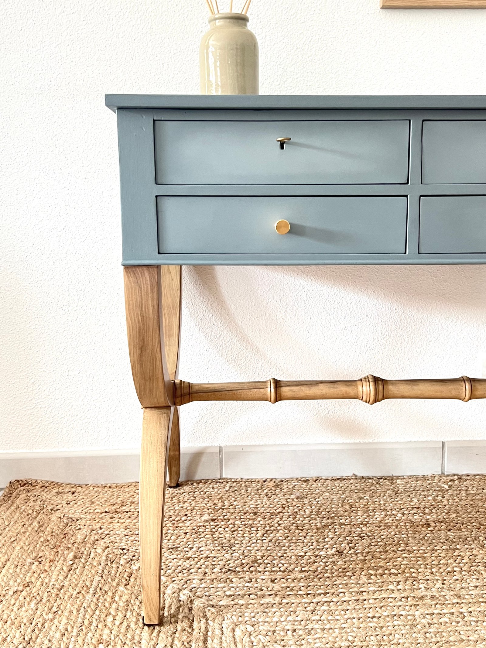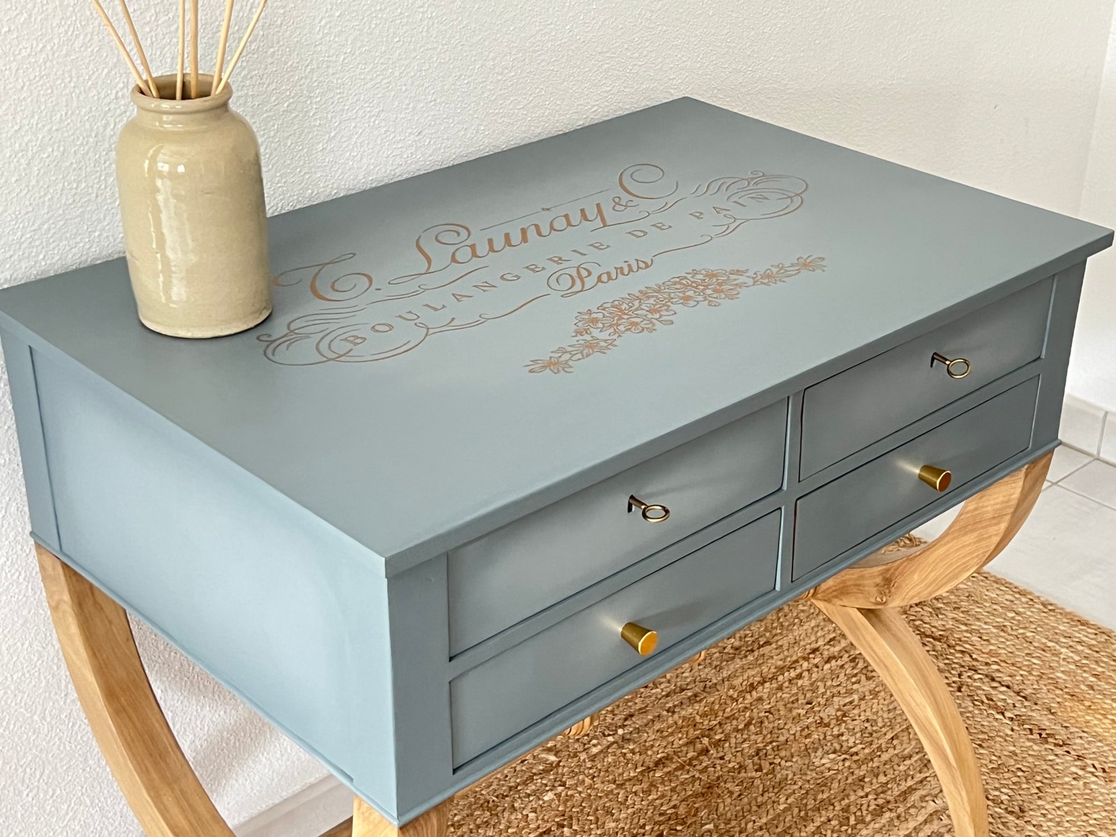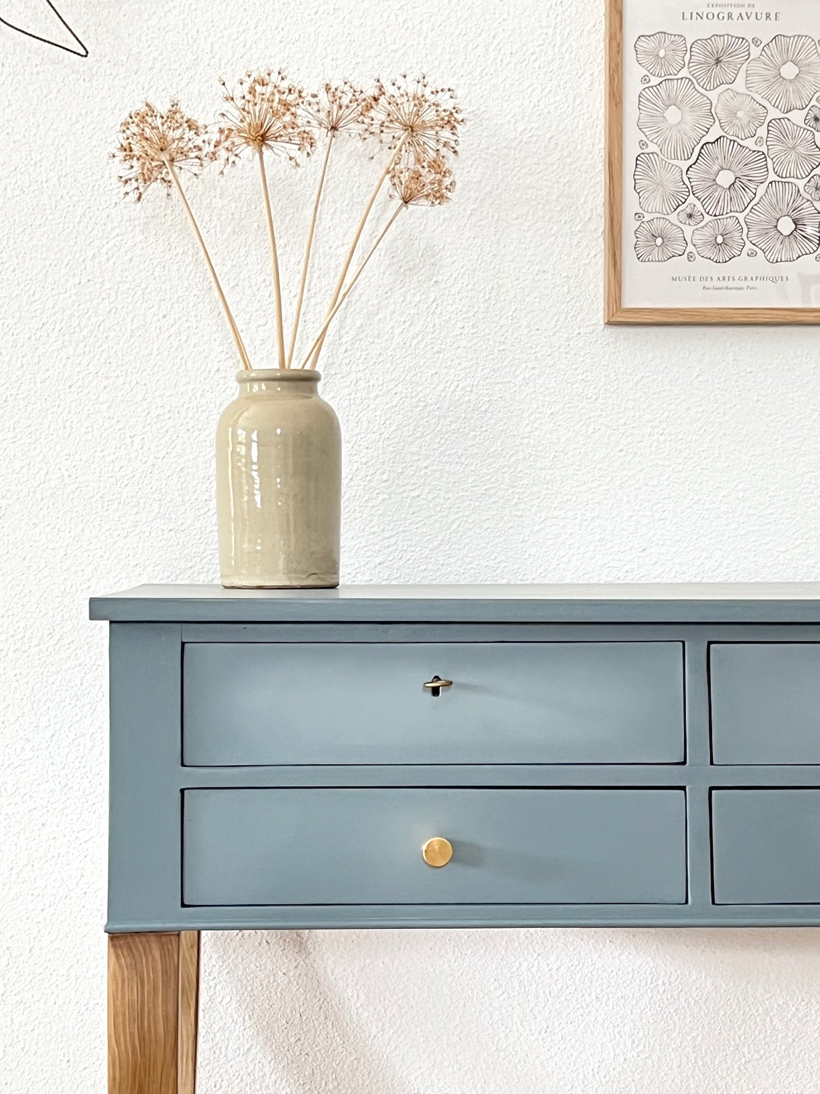 Jolie console qui peut également servir de table ou bureau d'appoint. Elle sera parfaite dans une chambre, un salon ou une entrée. Elle a été entièrement restaurée avec beaucoup de soin. L'extérieur a été peint dans des tons de bleu dégradé avec un transfert appliqué sur le plateau. Ses jolis pieds ont été conservés en bois brut. L'intérieur des tiroirs possède des compartiments dont un qui se ferme avec un petit couvercle. Ils ont été peints en blanc cassé et tapissés d'un délicat papier peint à rayures bleues. Les 2 tiroirs du haut se ferment à clef. Les 2 serrures sont fonctionnelles. Voici les dimensions : Hauteur : 90,5 cm Largeur : 119,5 cm Profondeur : 48 cm N'hésitez pas à me contacter si vous avez des questions, j'y répondrai avec plaisir.