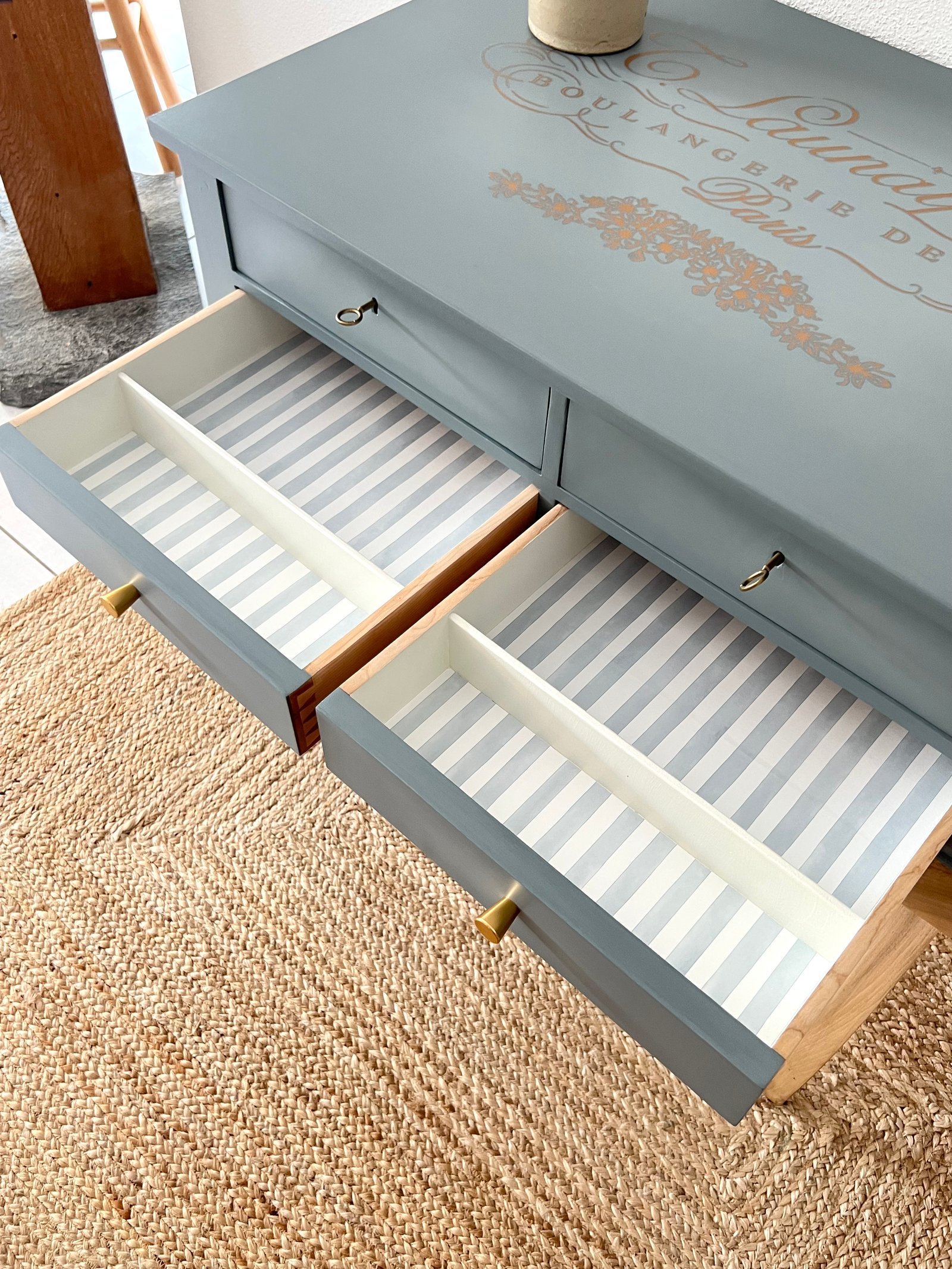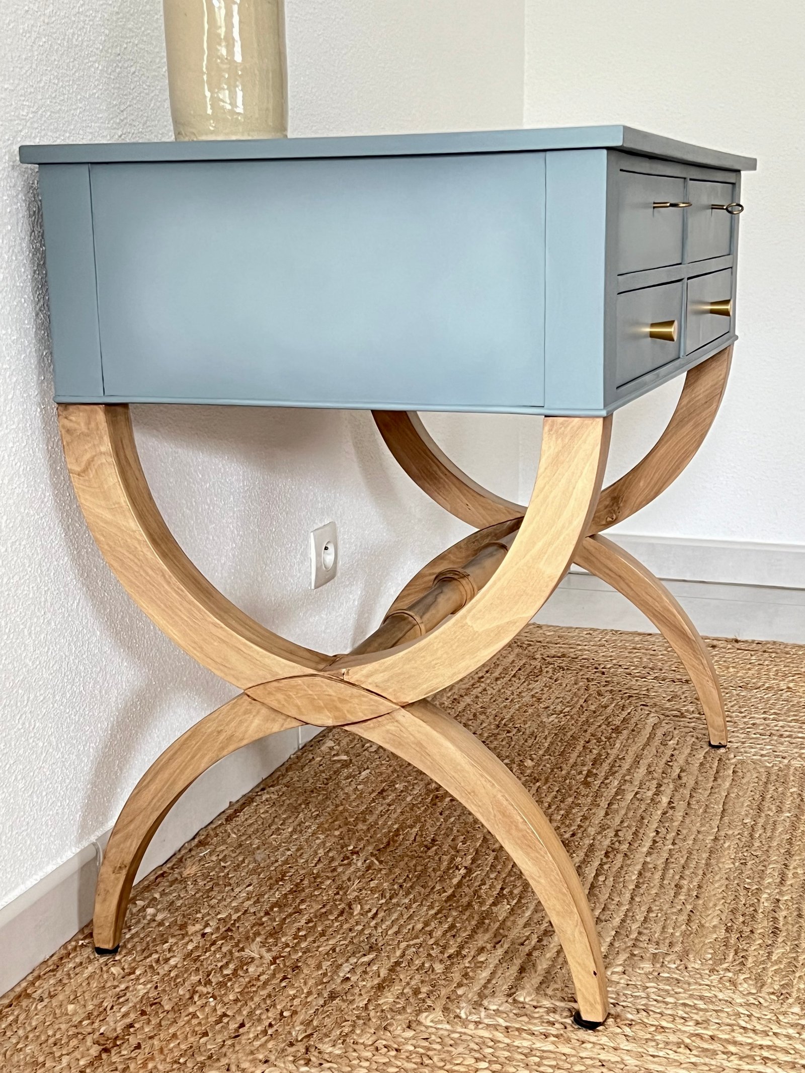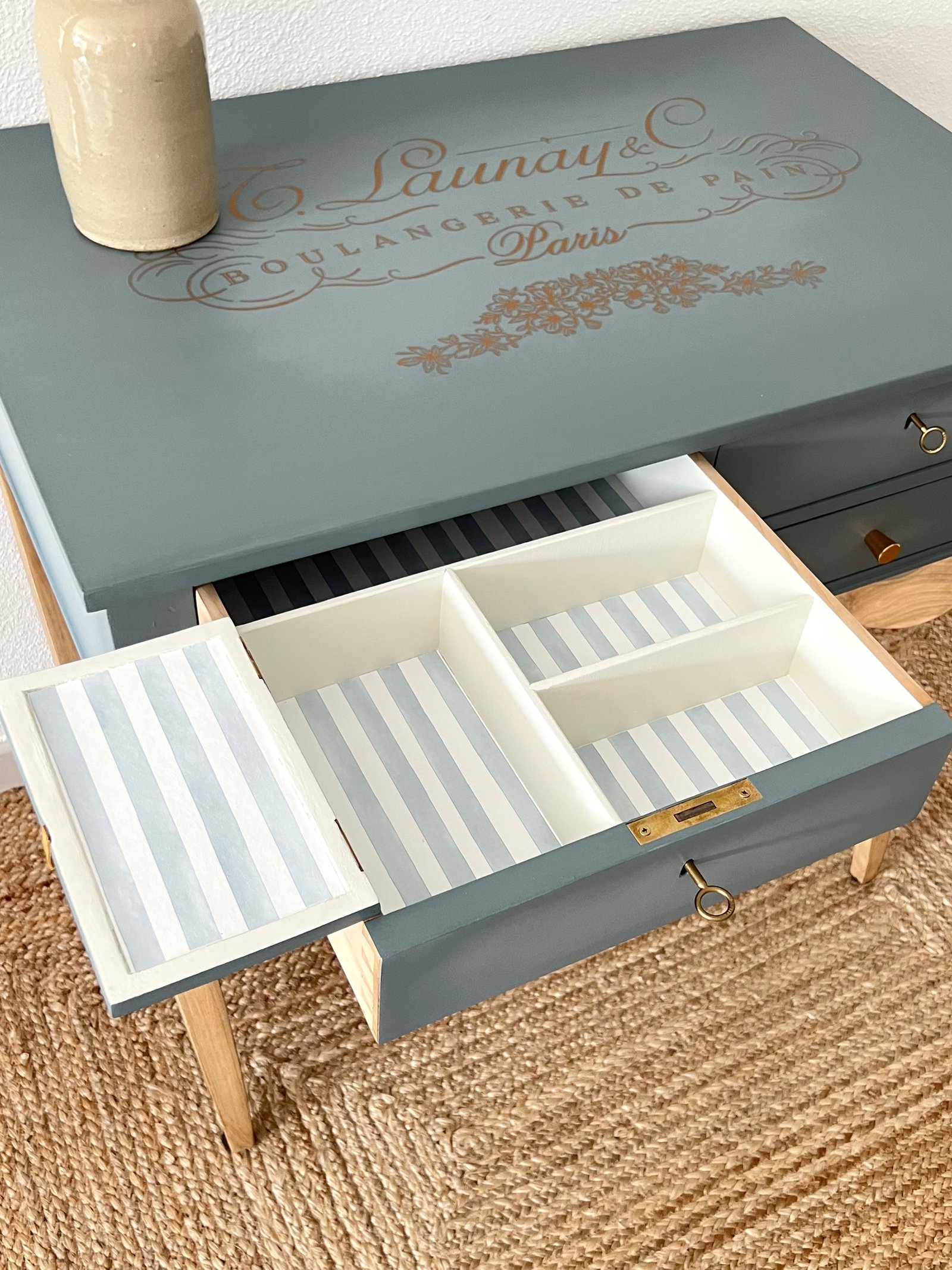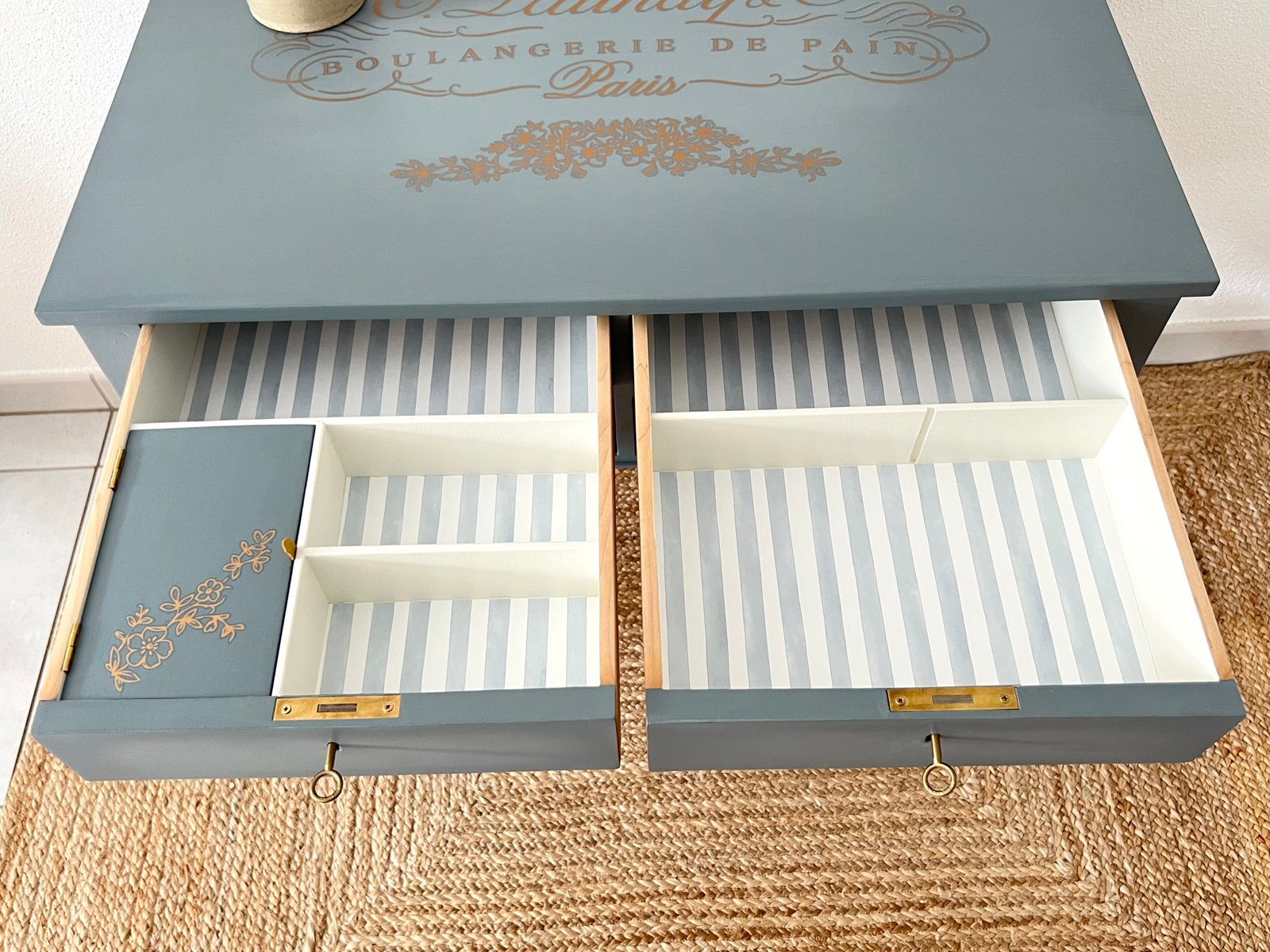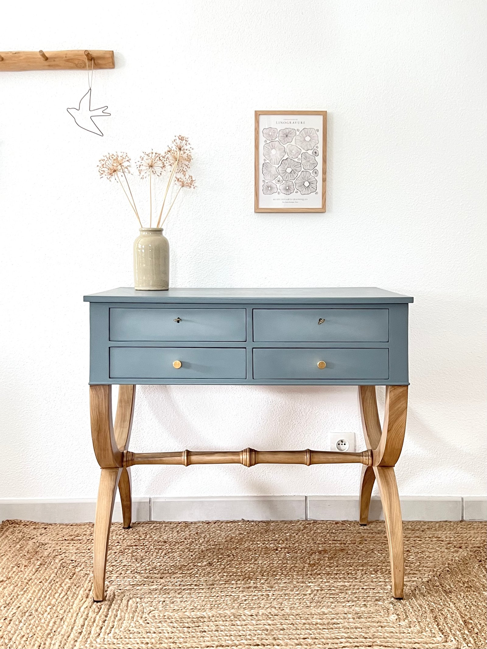 Jolie console qui peut également servir de table ou bureau d'appoint. Elle sera parfaite dans une chambre, un salon ou une entrée. Elle a été entièrement restaurée avec beaucoup de soin. L'extérieur a été peint dans des tons de bleu dégradé avec un transfert appliqué sur le plateau. Ses jolis pieds ont été conservés en bois brut. L'intérieur des tiroirs possède des compartiments dont un qui se ferme avec un petit couvercle. Ils ont été peints en blanc cassé et tapissés d'un délicat papier peint à rayures bleues. Les 2 tiroirs du haut se ferment à clef. Les 2 serrures sont fonctionnelles. Voici les dimensions : Hauteur : 90,5 cm Largeur : 119,5 cm Profondeur : 48 cm N'hésitez pas à me contacter si vous avez des questions, j'y répondrai avec plaisir.
