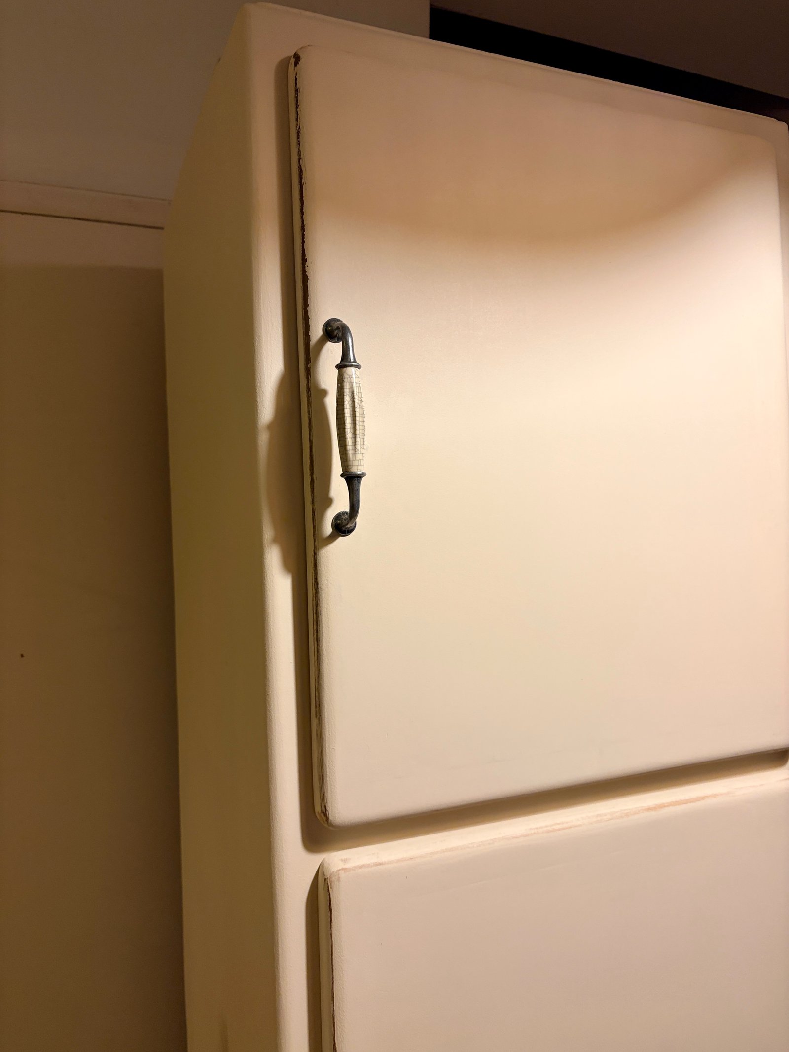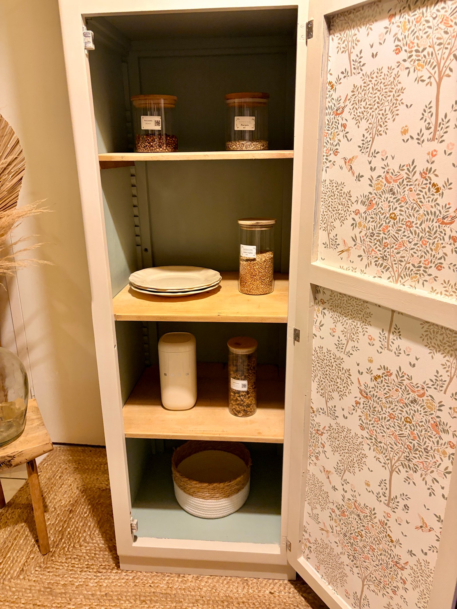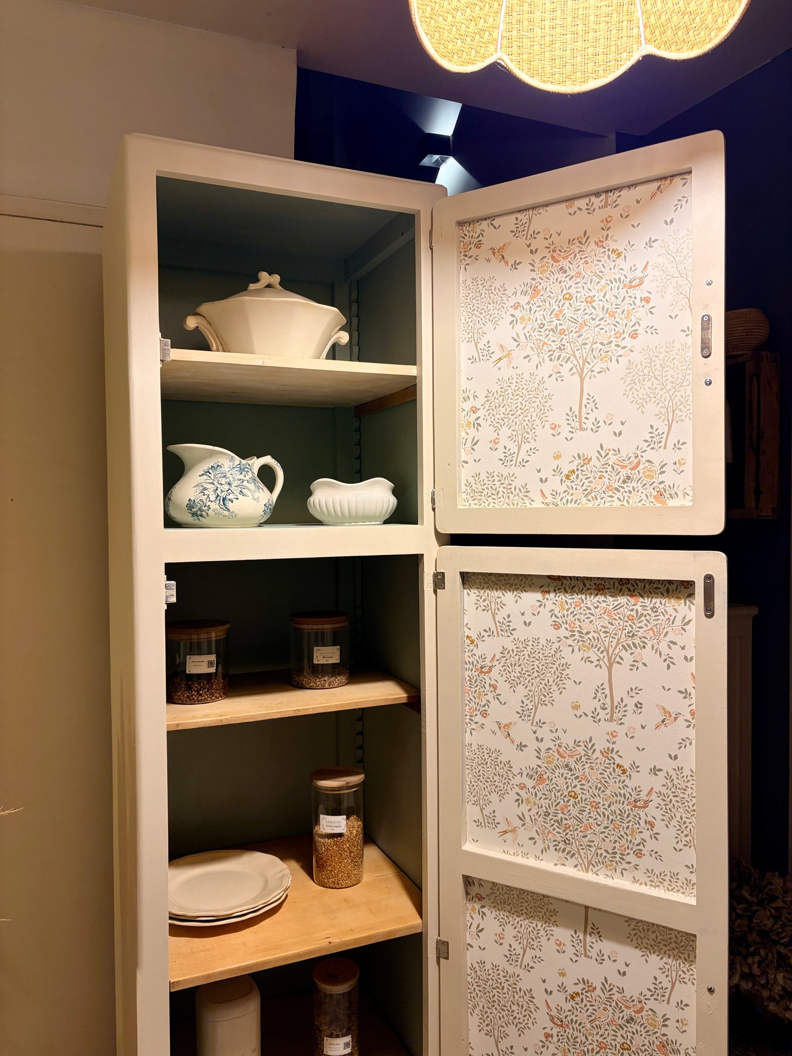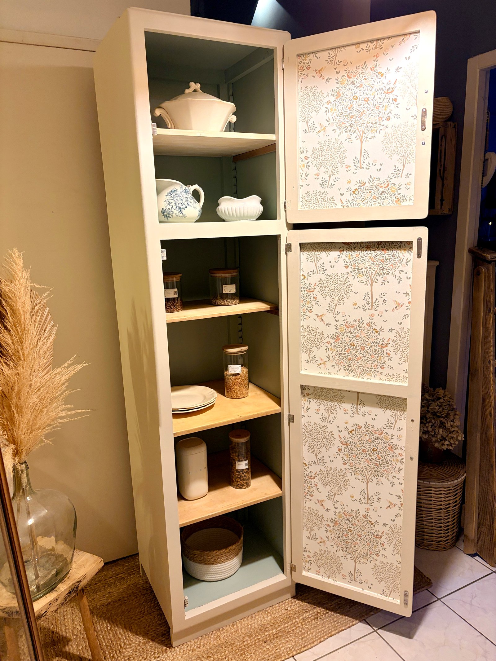 🏷 Disponible ✨ Magnifique Colonne Mado des Années 50/60 – Style Rétro Chic ✨ Apportez une touche de poésie et d'authenticité à votre intérieur avec cette authentique colonne Mado, entièrement restaurée avec soin. Ses lignes courbes iconiques et ses détails soignés en font une pièce unique qui s'adaptera aussi bien à une cuisine qu'à une chambre d’enfant ou un salon. 🎨 Une Rénovation Douce et Élégante • Extérieur : Peinte dans la nuance "Ivoire d’Orfèvre" de chez liberon , un blanc chaud et lumineux qui souligne ses célèbres portes arrondies. Les côtés ont été travaillés avec un effet cérusé pour un aspect naturel et texturé. • Intérieur : Un contraste superbe avec le coloris "Vert des Halles" de chez liberon, apportant de la profondeur et du caractère. • Finition : L’intérieur des portes est habillé d’un élégant papier peint fleuri aux tons printaniers. • Détails : Poignées en porcelaine, véritables bijoux rétro. Malgré son encombrement réduit au sol, cette colonne offre un très grand espace de rangement grâce à ses nombreux rayonnages en bois brut. Idéale pour votre épicerie fine, votre vaisselle ou même comme armoire de rangement pour du linge. • En cuisine : Pour un garde-manger au look vintage. • En chambre : Comme petite armoire ou bibliothèque pleine de charme. • En salle de bain : Pour ranger vos serviettes et cosmétiques avec style. Prête à poser • L51cm • P48 cm • H199 cm