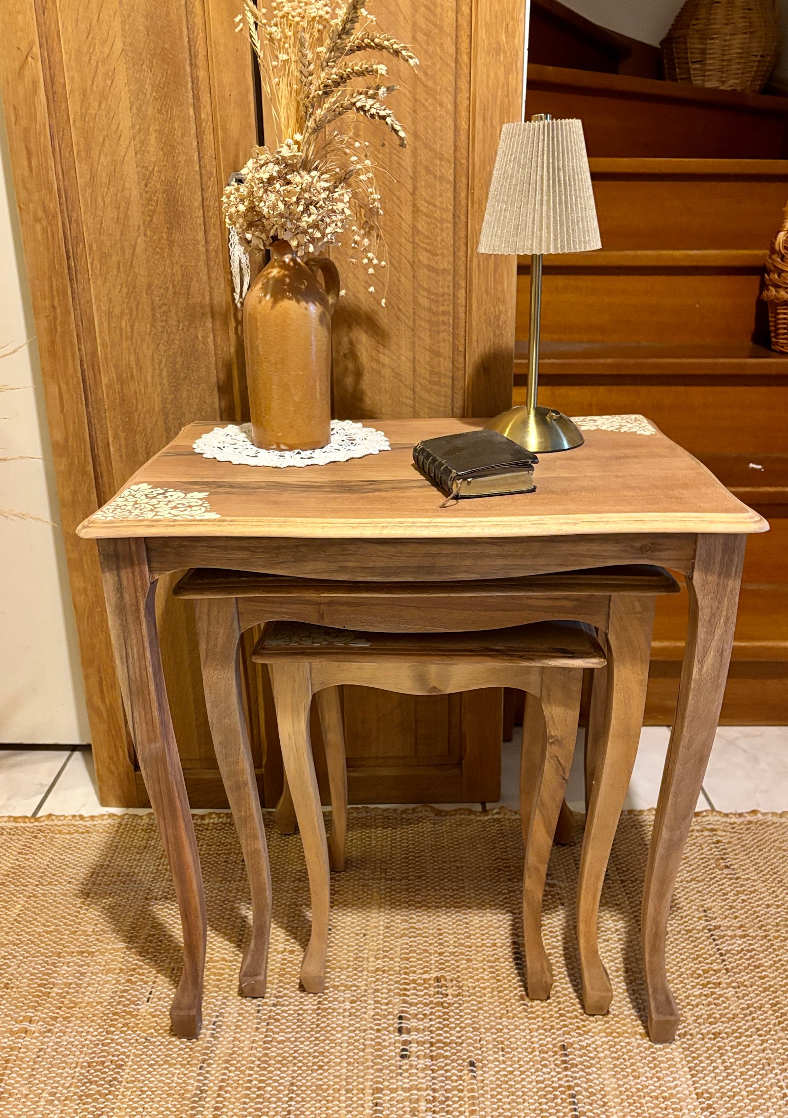 Magnifique Ensemble de 3 Tables Gigognes Rénovées "Campagne Chic" Ces superbes tables gigognes ont été entièrement rénovées pour allier l'élégance intemporelle du style ancien au raffinement du "Campagne Chic". Idéales pour les petits espaces ou comme tables d'appoint modulables, elles apportent une touche de douceur et d'histoire à votre salon, entrée ou chambre. • Chaque table a été entièrement poncée, nettoyée et traitée pour révéler la belle patine naturelle du bois, tout en assurant sa longévité. • Un motif de pochoir finement dessiné a été appliqué sur les coins de chaque plateau, ajoutant une note romantique et unique. • Les pieds aux lignes courbées rappellent le mobilier de style, garantissant charme et stabilité. Grâce à leur conception gigogne, ces tables s'emboîtent parfaitement les unes dans les autres pour un gain de place maximal. Vous pouvez les séparer en un instant pour servir vos invités ou exposer vos décorations. Dimensions de la Grande Table • H56 cm • L54 cm • P38 cm (Les deux autres tables sont de dimensions inférieures et s'insèrent sous celle-ci.)