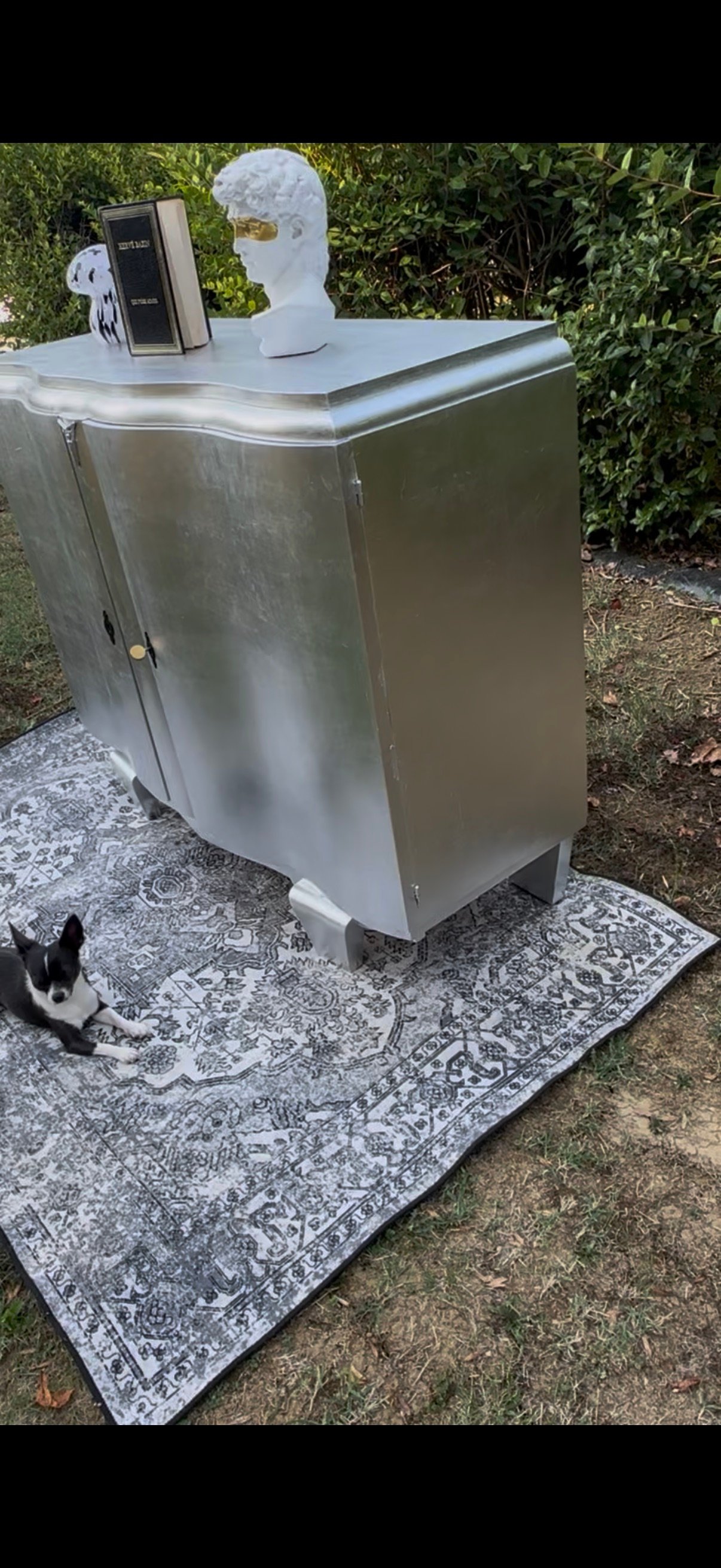 Ancien meuble 2 portes entièrement recouvert de feuilles d'argent. Son intérieur est en velours noir et les portes ont un magnifique papier peint vert et doré afin de lui donner son complément de beauté chic. Celui-ci est lumineux tel un miroir qui illumine une pièce. Pour plus de renseignements n'hésitez pas a nous contacter