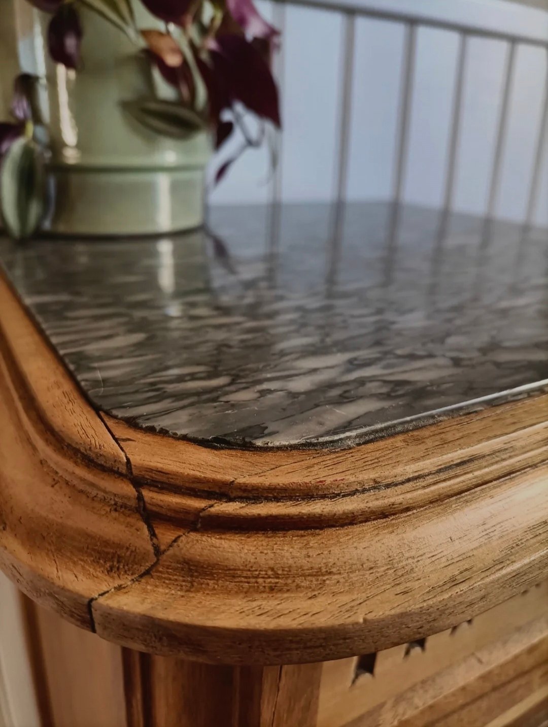 Rénovation d'un trésor des années 30 ! Voici la belle Marguerite tout en chêne massif, qui a retrouvé tout son éclat. Avec son élégant plateau en granit aux nuances rouge/ocre, elle apporte une touche de caractère et de chaleur à n'importe quelle chambre. L'intérieur, d'un Bordeaux profond, ajoute une note de sophistication et de mystère, parfait pour y ranger vos petits secrets. Chaque détail a été soigneusement restauré pour préserver l'authenticité de ce meuble unique. Prêt à faire briller votre espace avec son charme vintage !