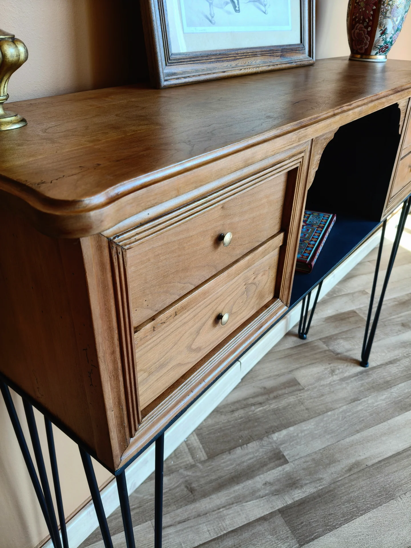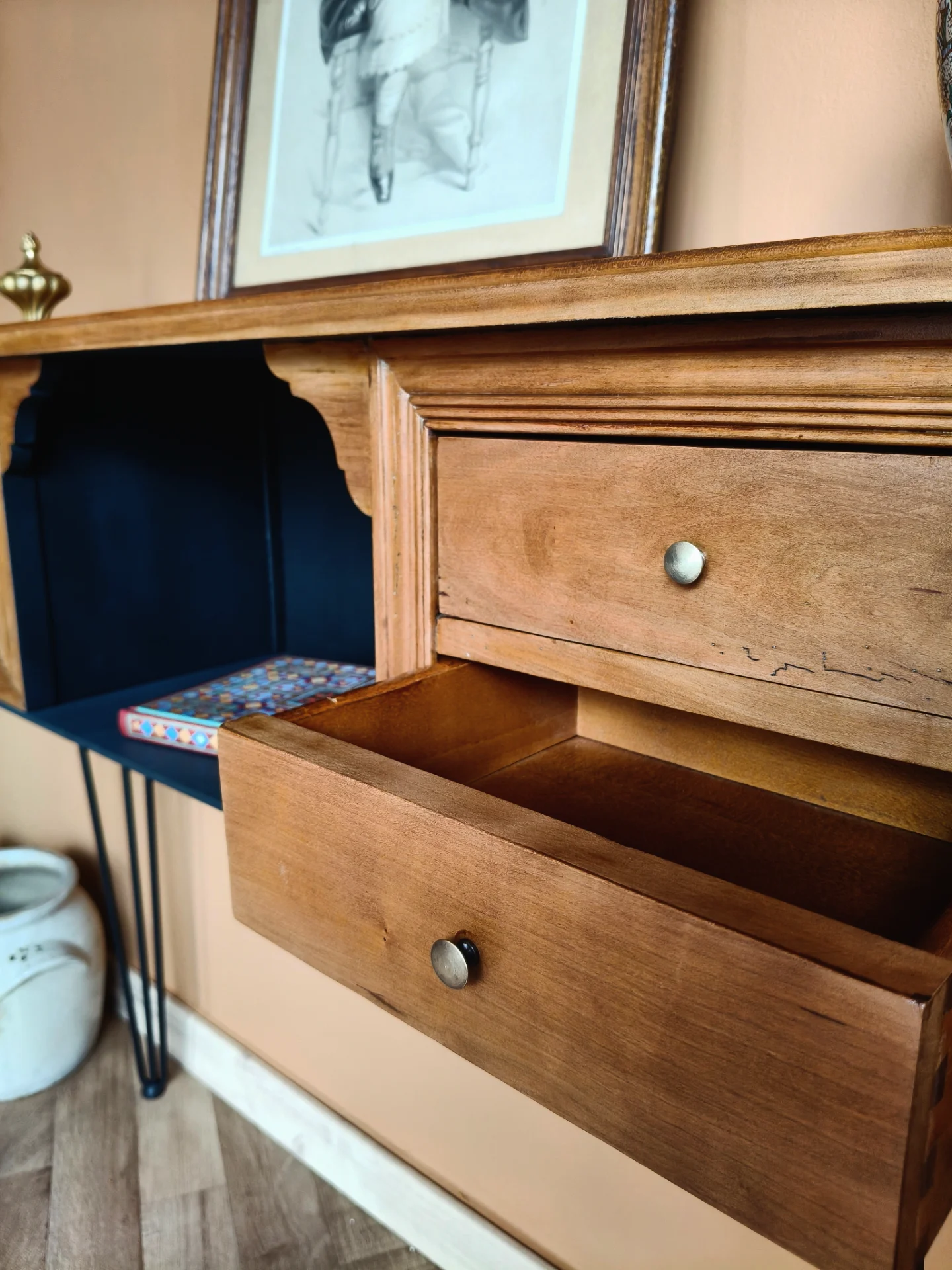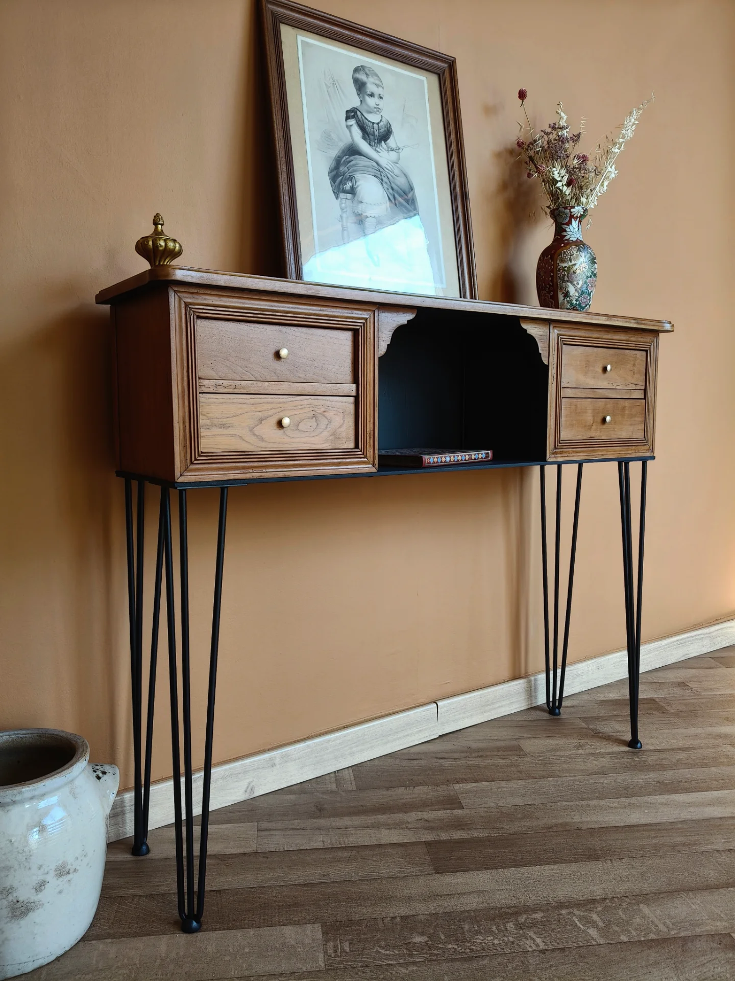 Ancien haut de bureau transformé en console, idéal pour une entrée, une chambre où un séjour. Console entièrement rénovée avec des matériaux de haute qualité. Finition satinée, pieds épingles en metal noir.