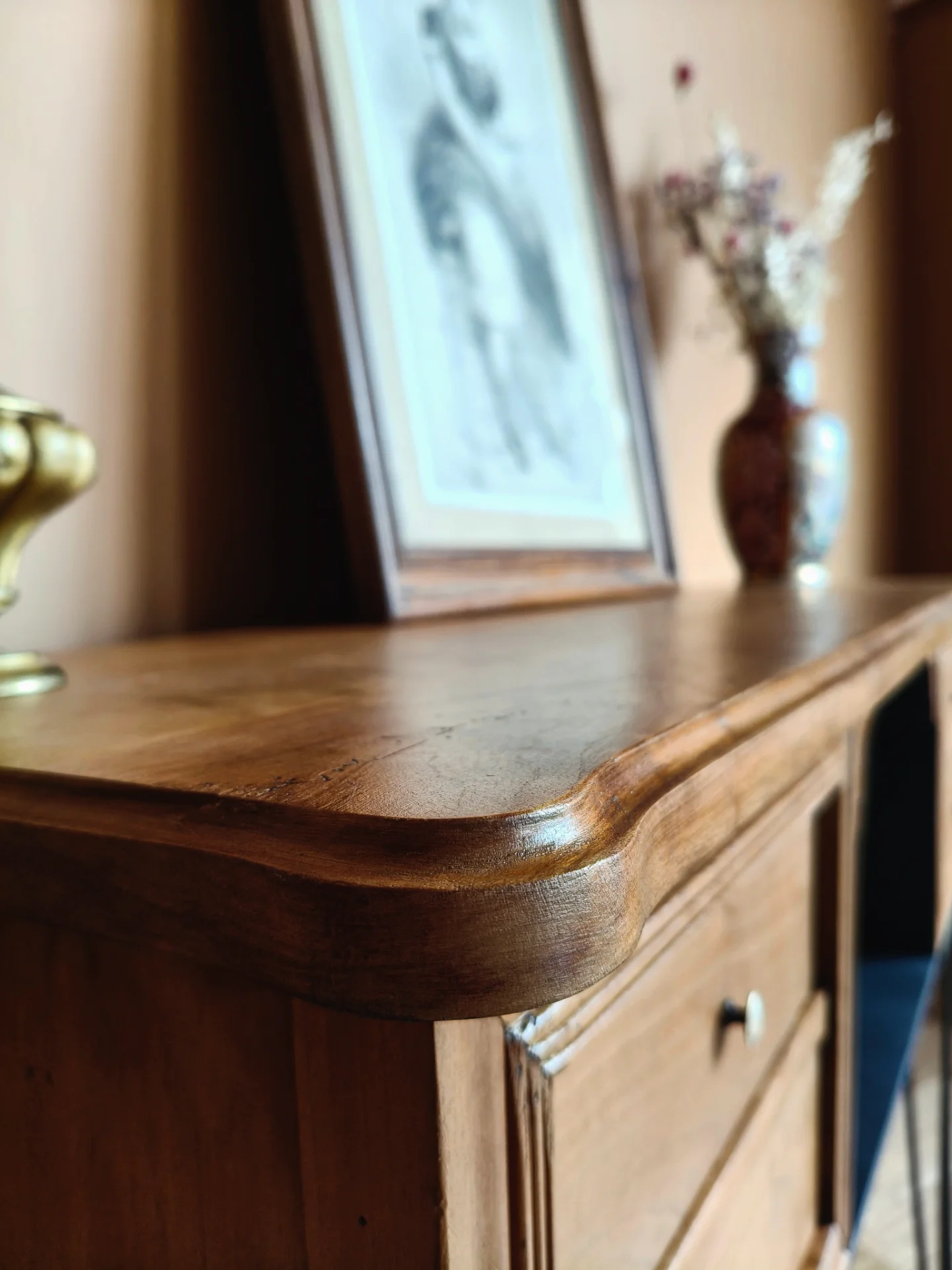 Craquez pour cette superbe commode style Louis XVI entièrement rénovée ! J ai commencé par un ponçage minutieux pour retirer la céruse blanche et le vieux vernis, révélant ainsi la beauté naturelle du bois. La teinte chaleur et l'aspect authentique sont désormais mis en valeur, lui offrant une nouvelle vie. Chaque détail à été soigneusement restauré pour que cette commode puisse continuer à raconter son histoire pendant de nombreuses années !