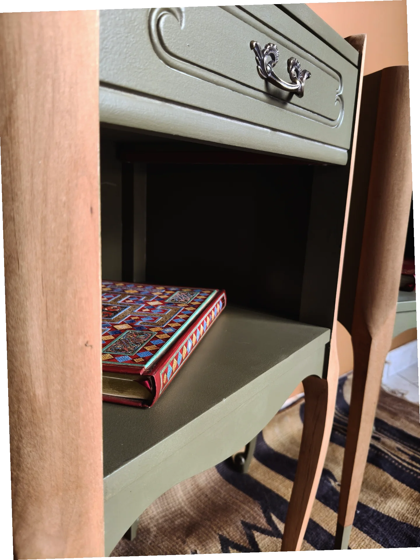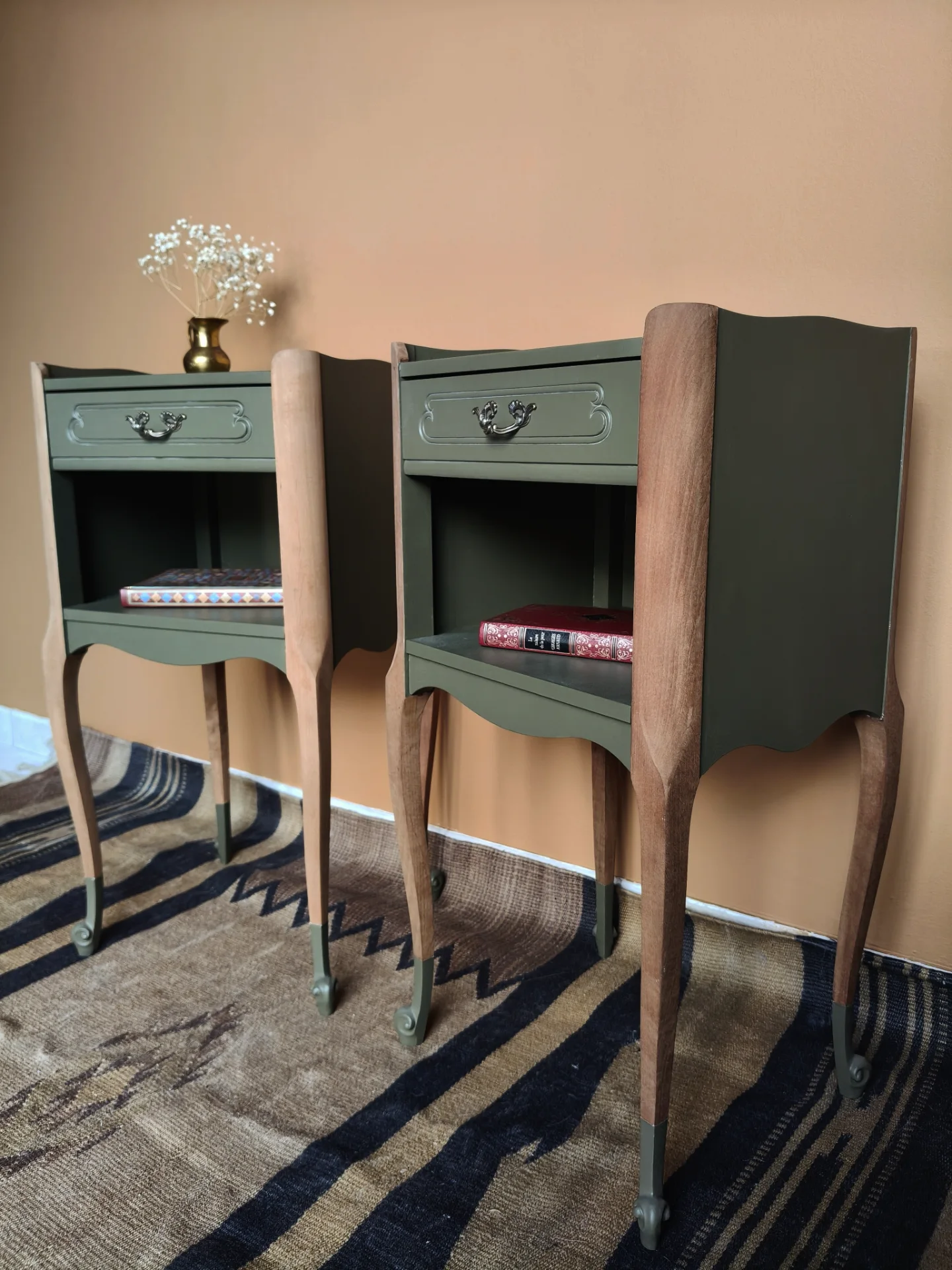 Paire de tables de chevet entièrement rénovées avec soins. Pieds en bois brut teintés. Peinture vert olive protégée par un vernis ultra mat.