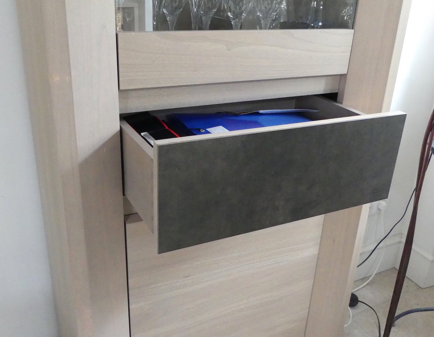 Beau vaisselier contemporain de la marque LA BOISSELLERIE, fabriqué en France (Vendée) Vendu cause déménagement Bois, céramique et verre Dimensions : larg. 112 cm x prof. 42 cm, hauteur 170 cm 1 tiroir central (manoeuvre push-push), 2 portes vitrées hautes, 2 portes pleines basses, 2 étagères intérieures réglables (1 verre, 1 bois) Appartient à un ensemble complet de salle à manger réalisé artisanalement et acheté en 2016