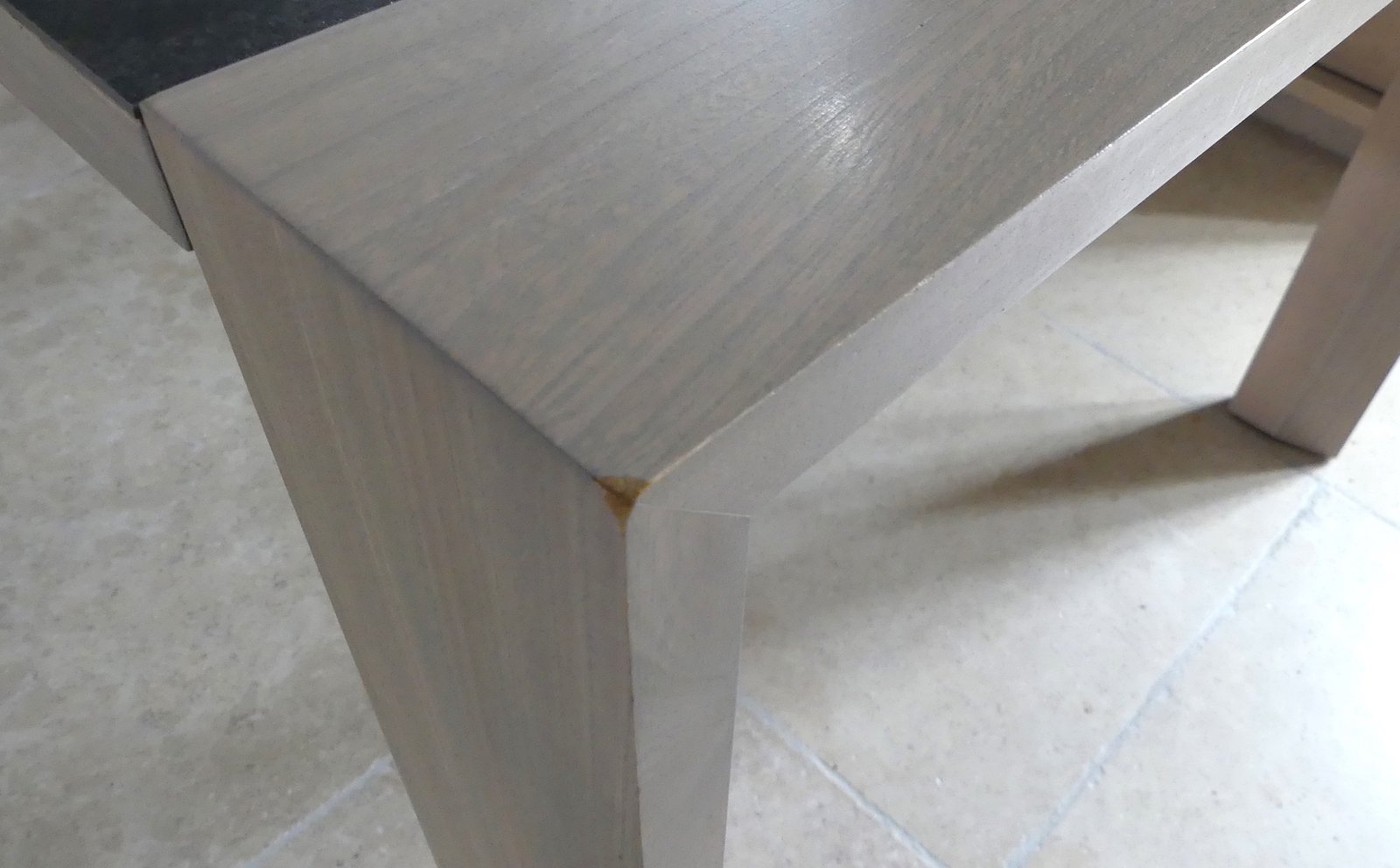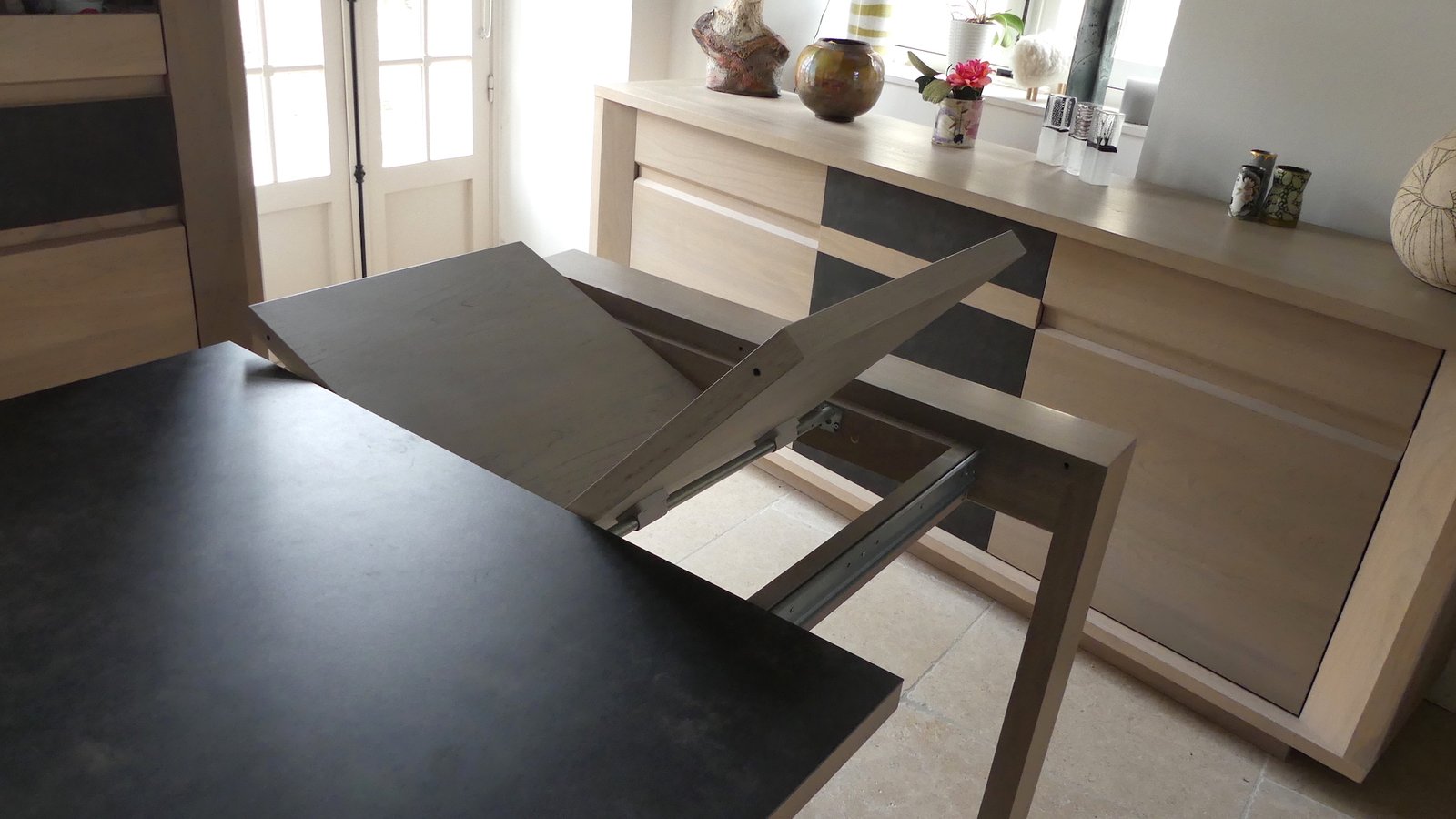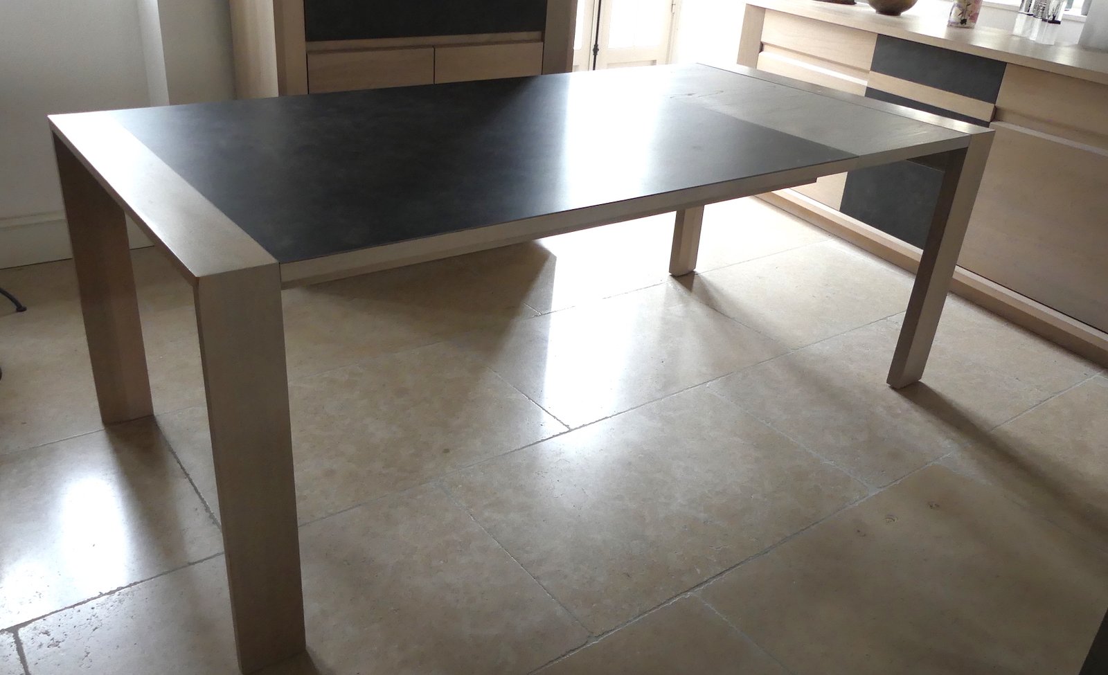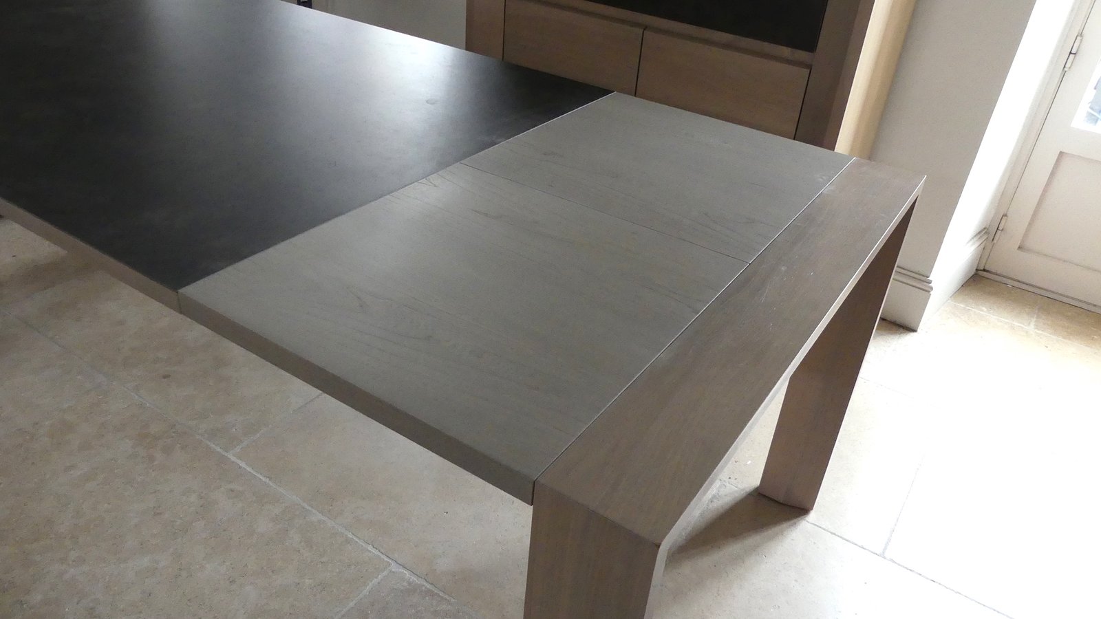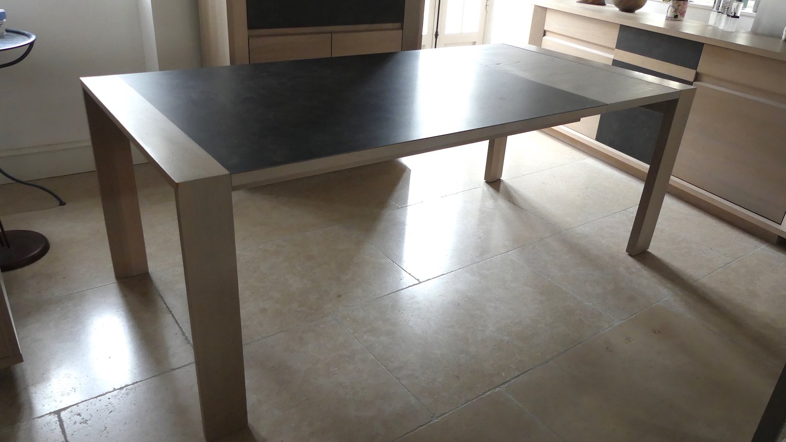 Belle table à manger contemporaine en bois gris-beige avec rallonge, accompagnée de ses 6 chaises (assise grise). Acheté en 2016, assise des chaises refaite en 2024, vendu cause déménagement. Bon état général mais angles légèrement abîmés et deux accrocs peu visibles sur les pieds. Mobilier en bois avec association de béton/céramique, fait en France dans une entreprise de Vendée (La Boissellerie). Table : 100 cm x 162 cm, hauteur 77 cm * Longueur avec rallonge 210 cm. La table et ses chaises appartiennent à un très bel ensemble complet de salle à manger contemporaine de la marque LA BOISSELLERIE, fabriqué en France (Vendée) (2 vaisseliers, 1 buffet, 1 table avec rallonge et 6 chaises), disponible en totalité sur le bon coin.