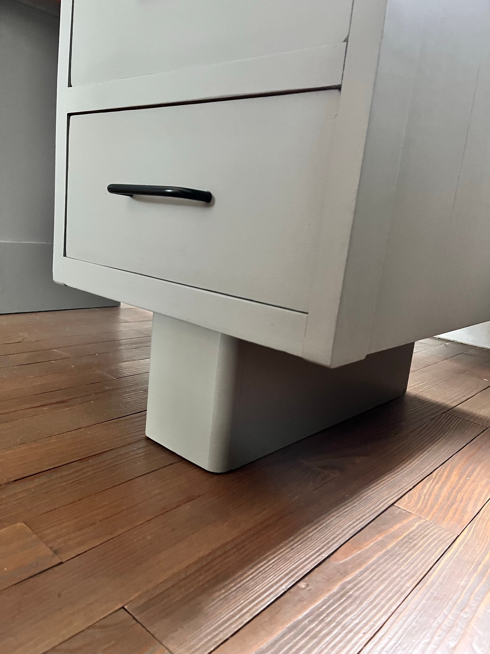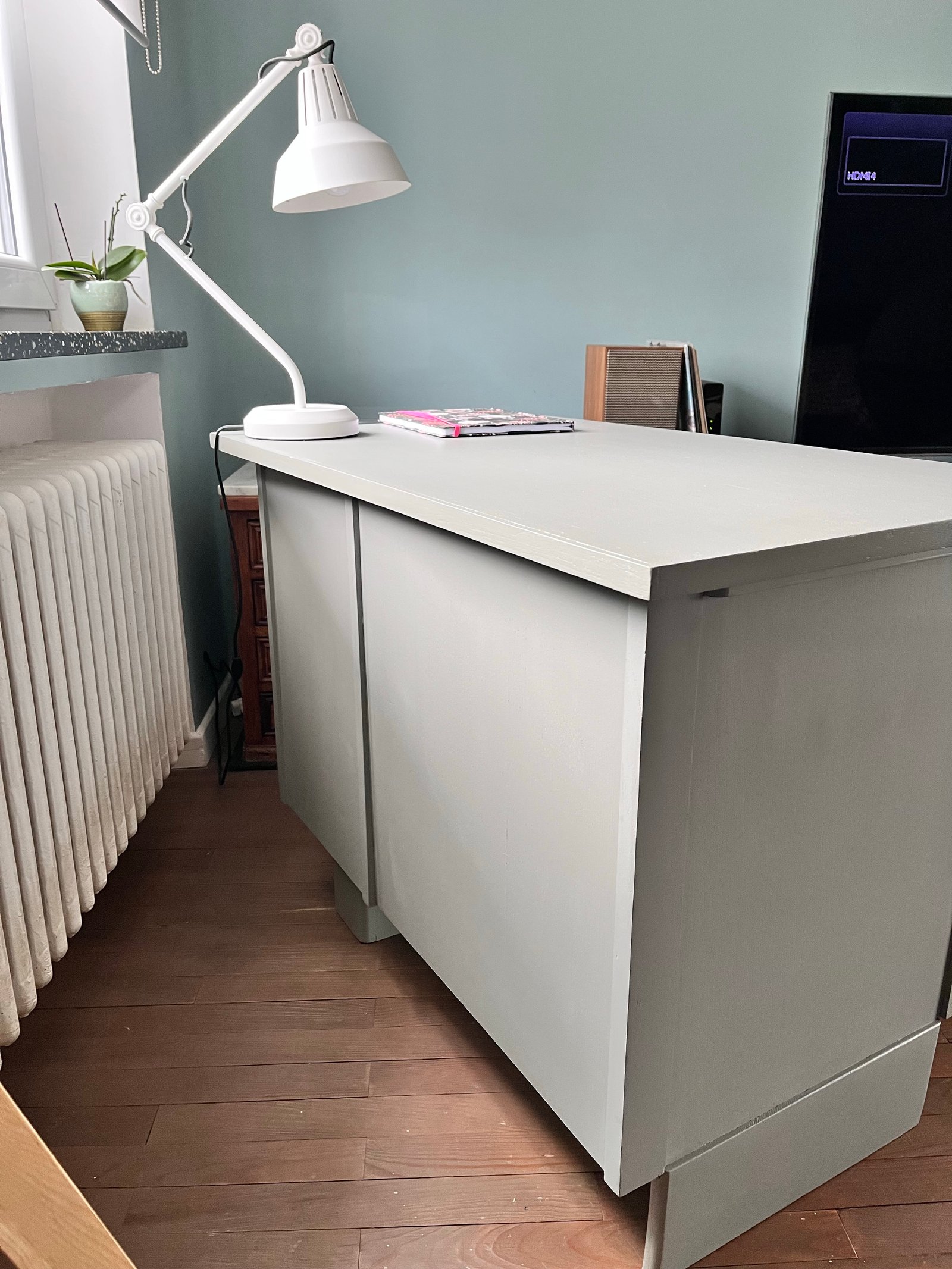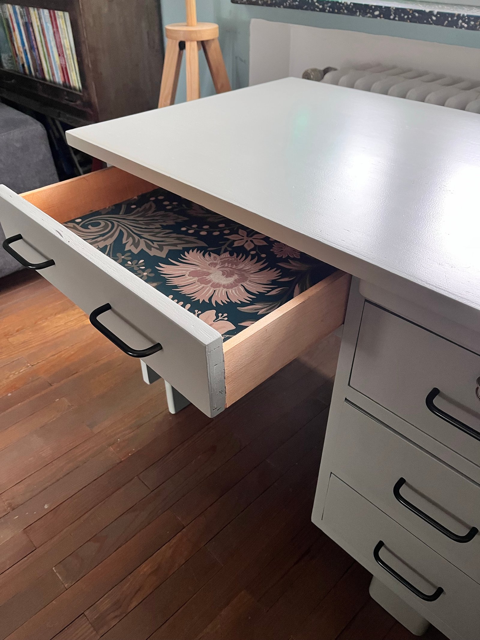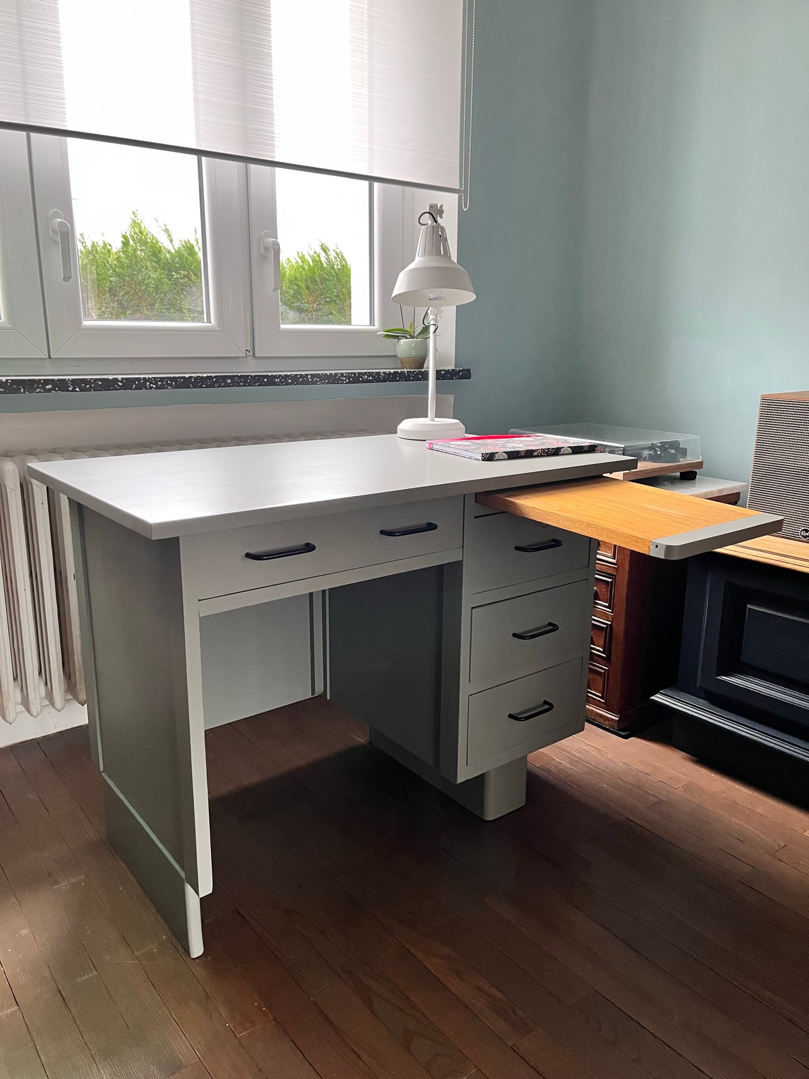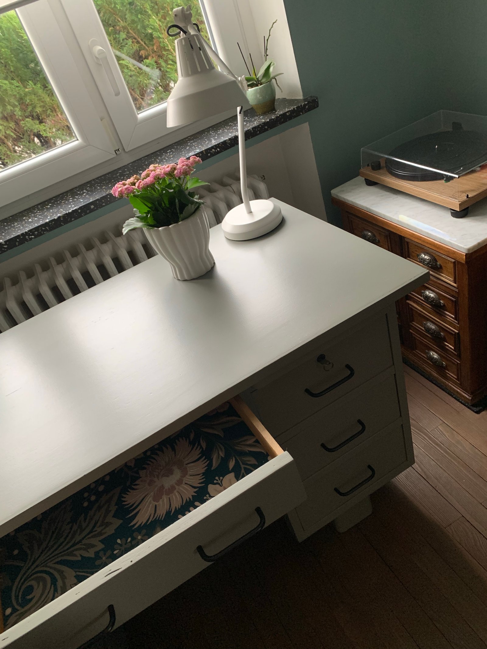 Bureau vintage repeint dans une teinte douce. Cette couleur s'appelle vert scandinave. Elle est difficile à déceler chez moi car mes murs sont presque de la même couleur 🙂. C'est un vert / gris mat. 4 tiroirs, dont un qui se ferme à clé. J'ai repeint les poignées en noir, j'ai tapissé le grand tiroir avec un papier Ava Sandberg. Planche de travail rétractable. Le plateau a été vernis. Le reste du meuble a été ciré.