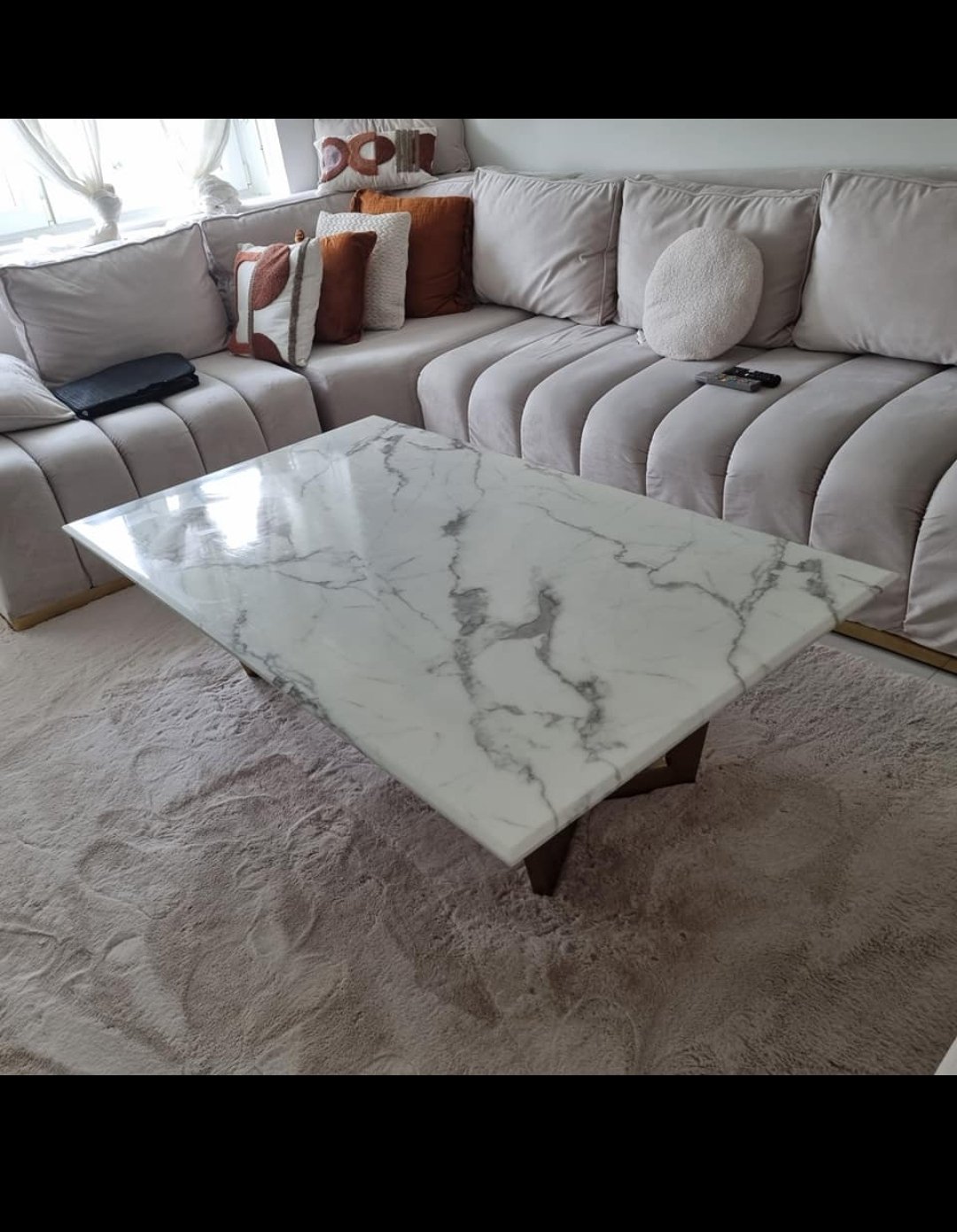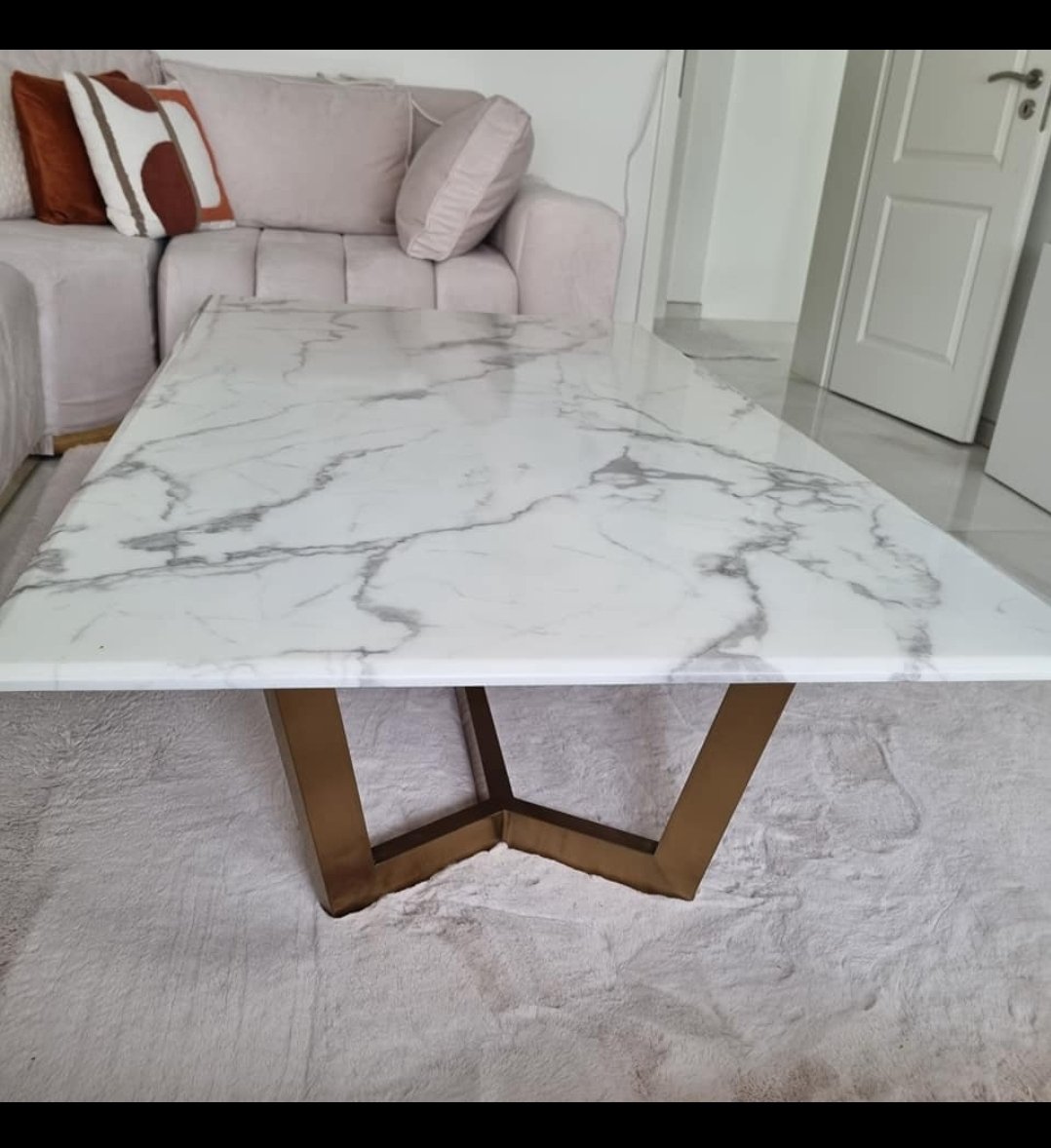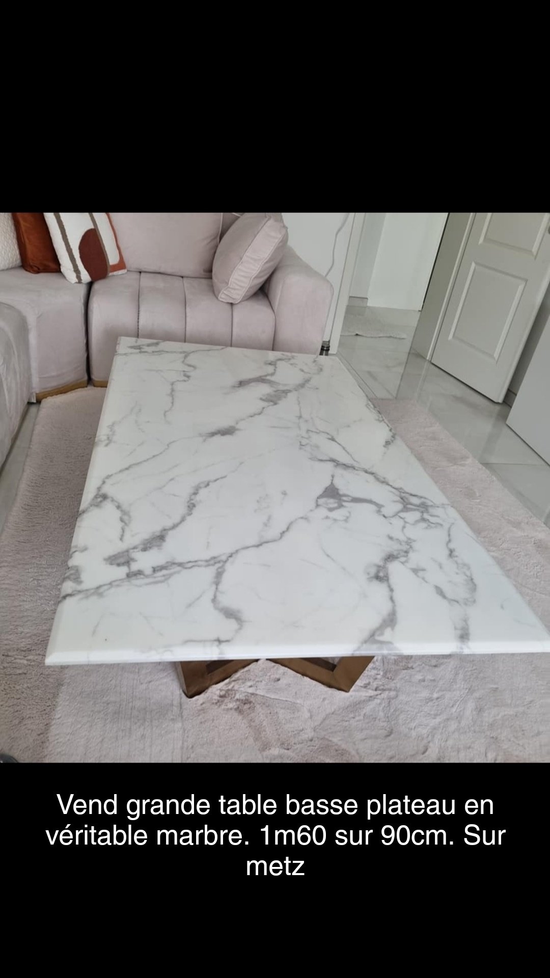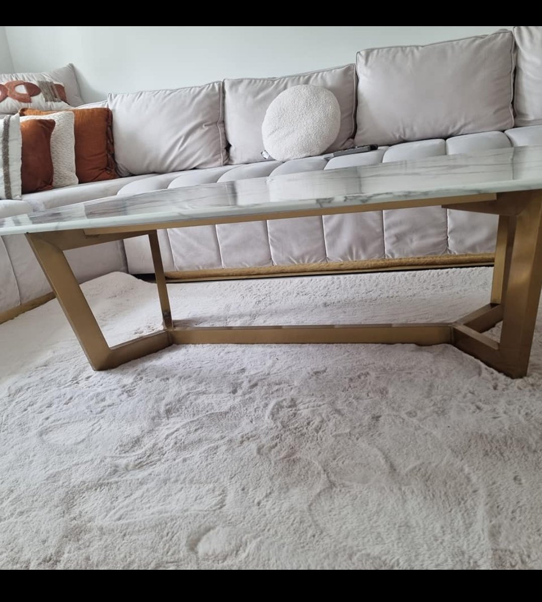 Vend grande table basse rectangulaire avec plateau effet marbre et piétement géométriques en métal couleur doré, style moderne. En très bon état