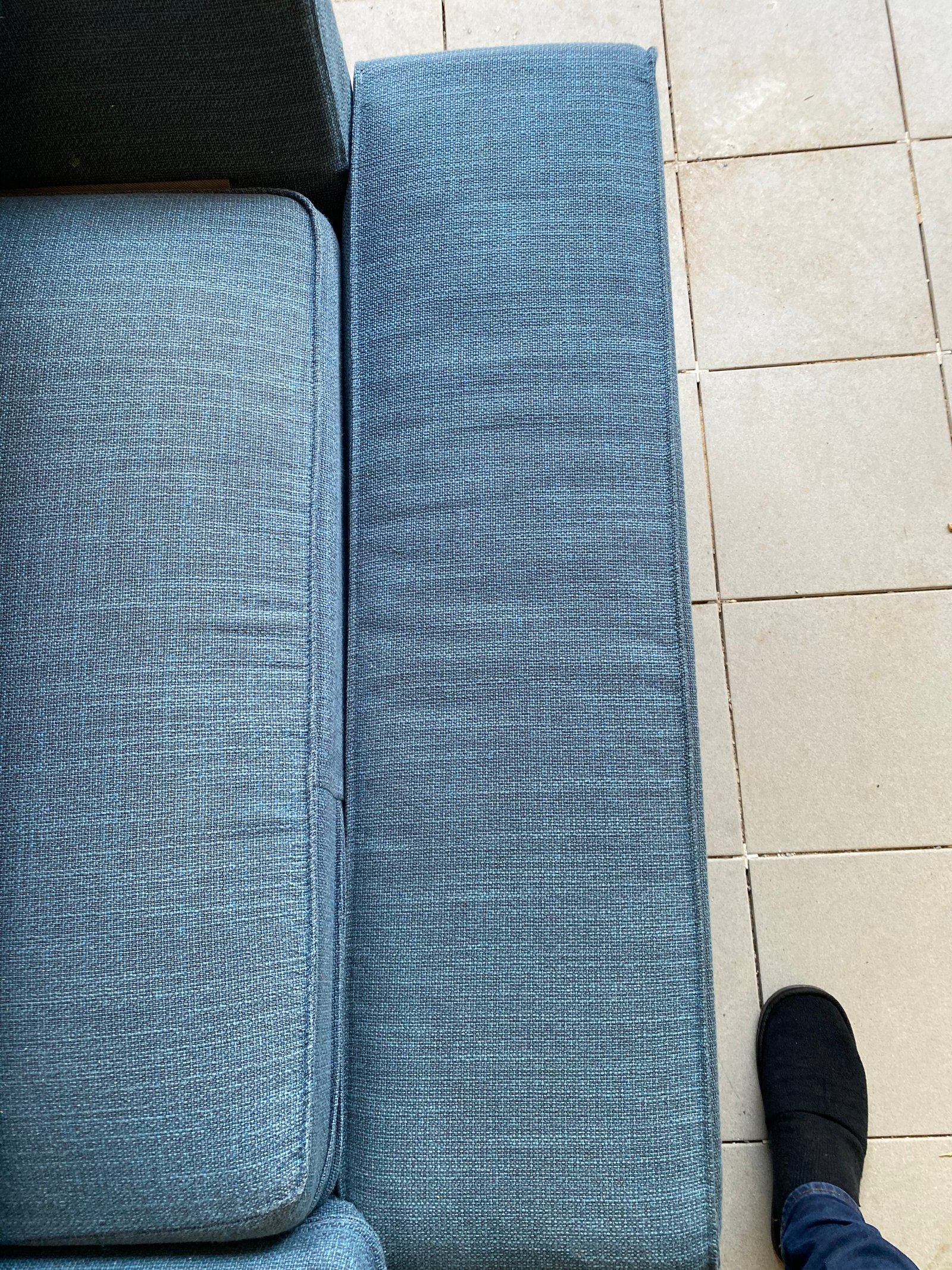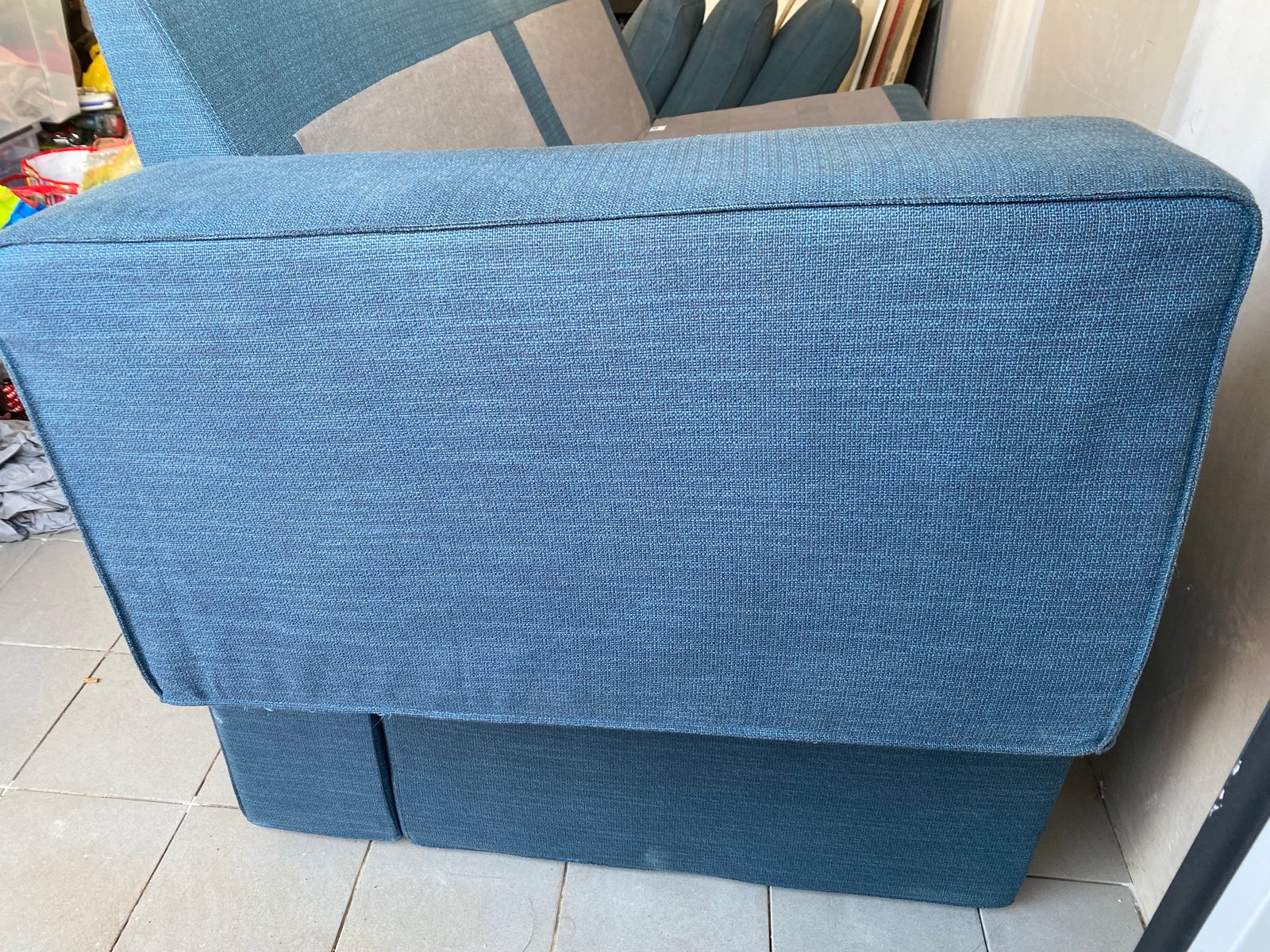 Canapé d’angle couleur bleu canard. Assises et dossiers déhoussables et lavables en machine Canapé en très bon état