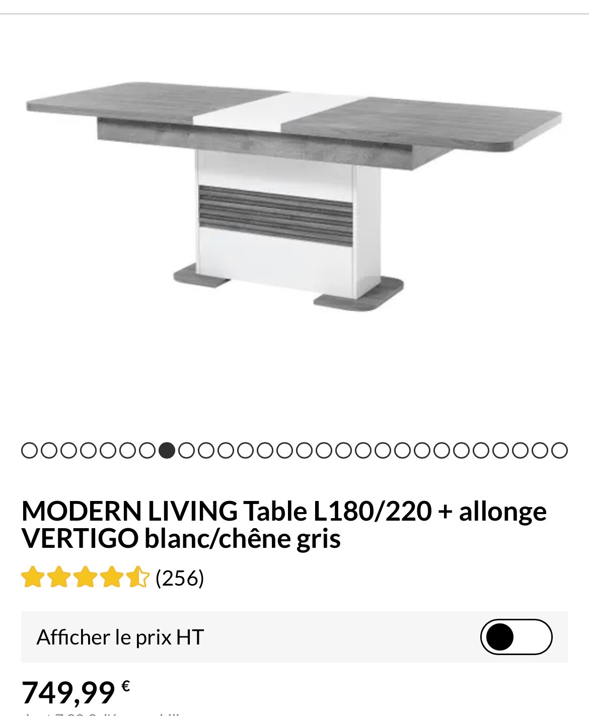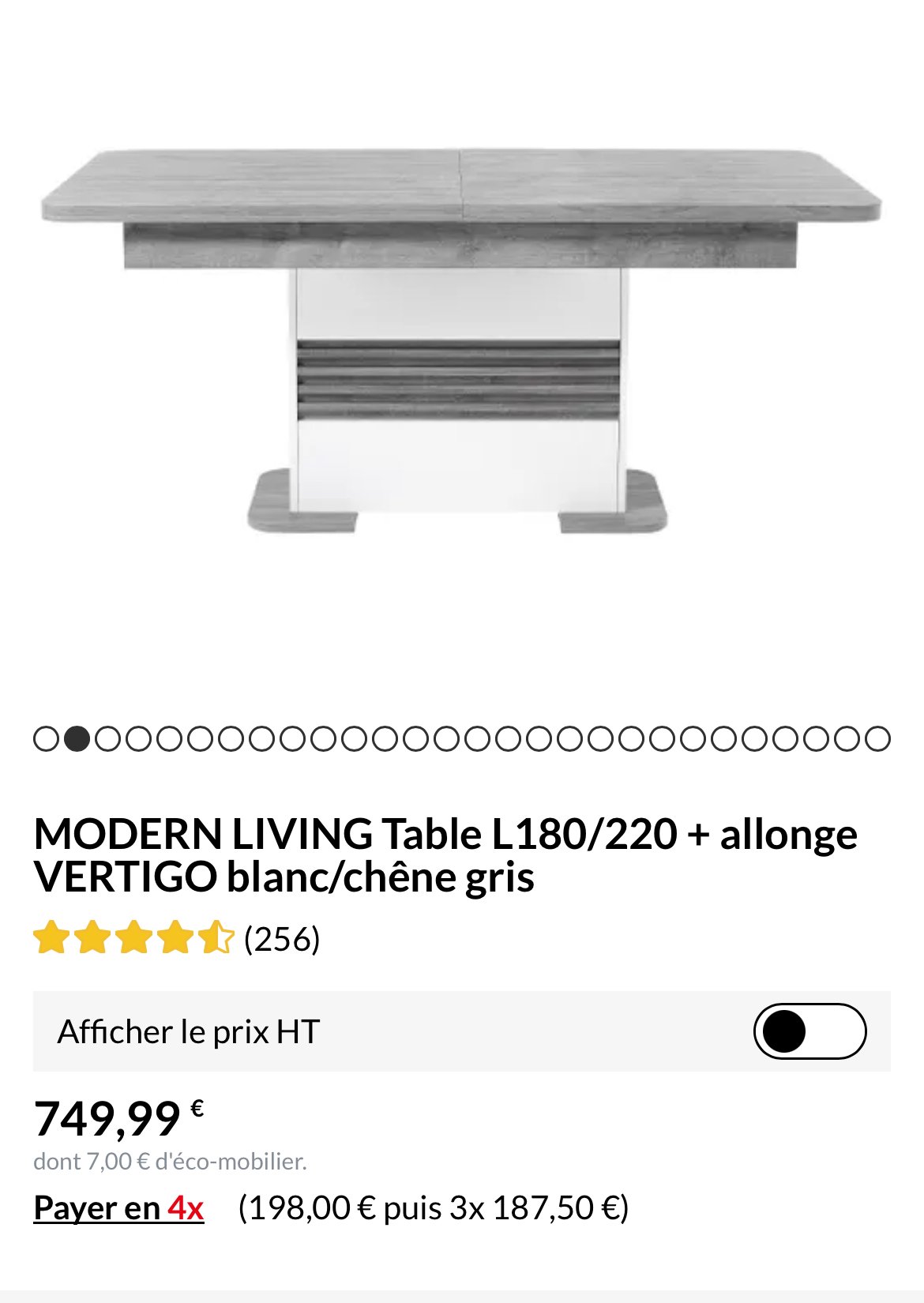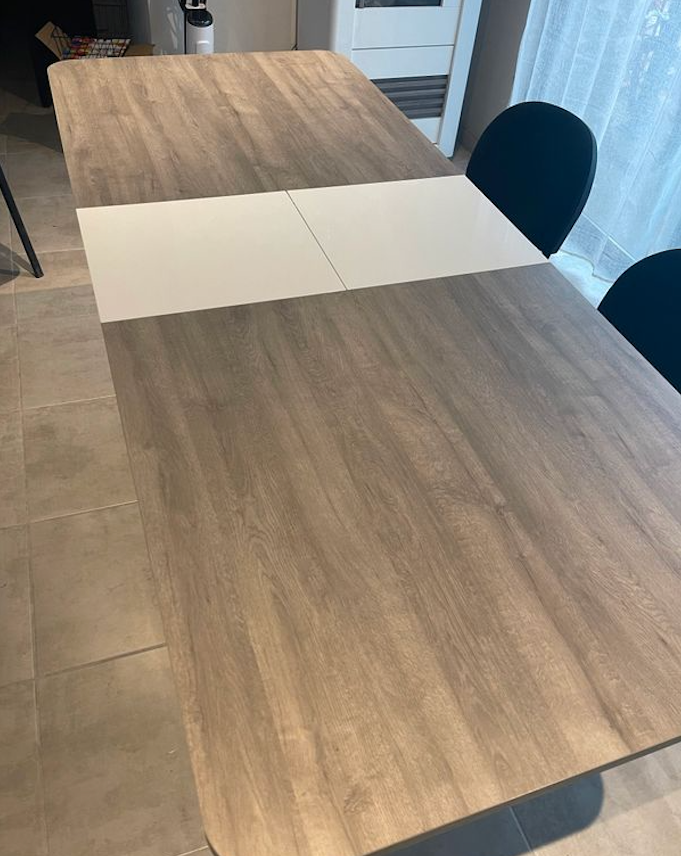Table extensible achetée il y a 1 an – facture disponible (BUT) Cette table extensible, fabriquée en Italie. La structure est composée de panneaux de particules recouverts de mélaminé avec un revêtement en chêne et blanc laqué. Robuste et facile à entretenir, elle s’intègre parfaitement dans une salle à manger moderne. Elle est facile à entretenir grâce à son revêtement en mélaminé et sa surface laquée. La table est conçue avec un design élégant combinant le blanc et le chêne gris. Le revêtement est en finition laquée.
