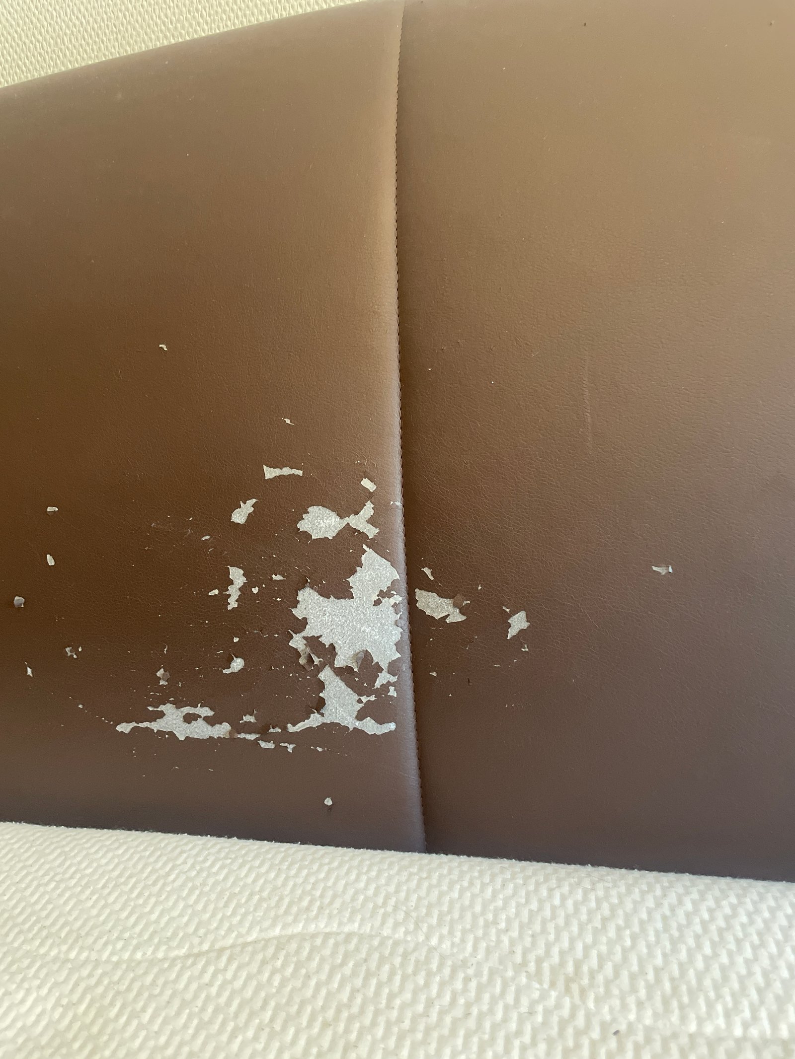 Lit double avec structure en similicuir de couleur marron et tête de lit rembourrée. La surface du similicuir présente quelques traces d’imperfection, visibles sur la tête de lit. Le lit est équipé de deux matelas séparés offrant un confort individuel. Ce lit est fonctionnel et adapté pour une chambre double.