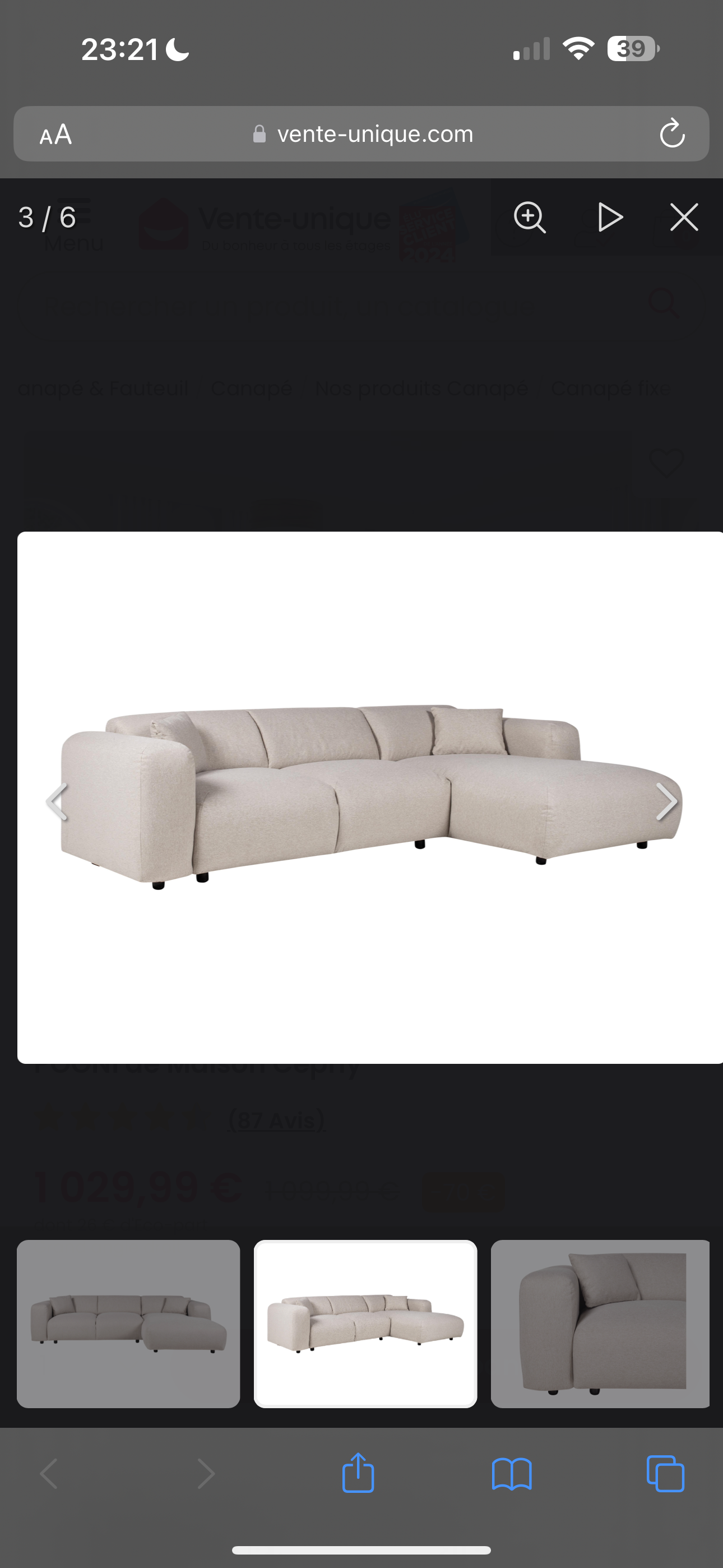 Canapé d'angle avec méridienne à droite en tissu chiné beige, modèle Pogni acheté sur Vente-Unique. En excellent état, comme neuf, ce canapé a été très peu utilisé. Ce canapé offre un confort optimal grâce à son revêtement en tissu chiné beige qui s'intègre facilement dans tout type d'intérieur, du salon moderne à un espace plus classique.